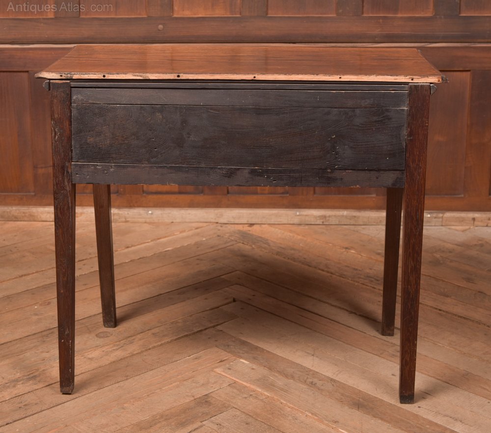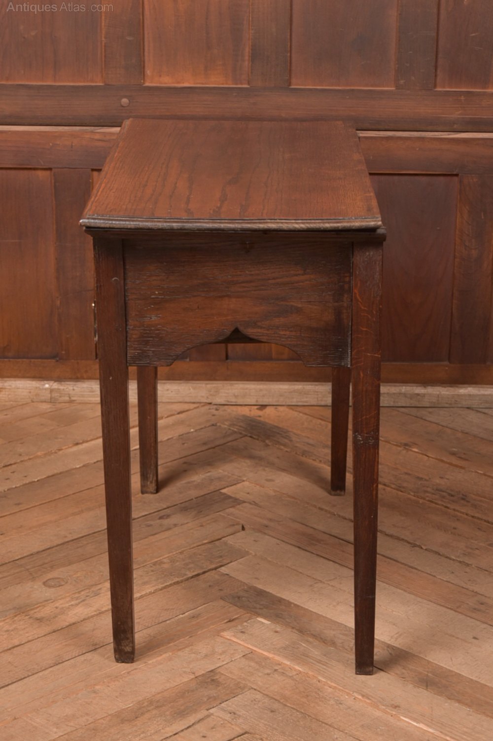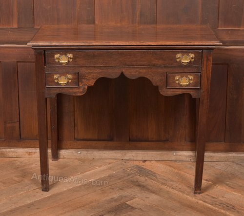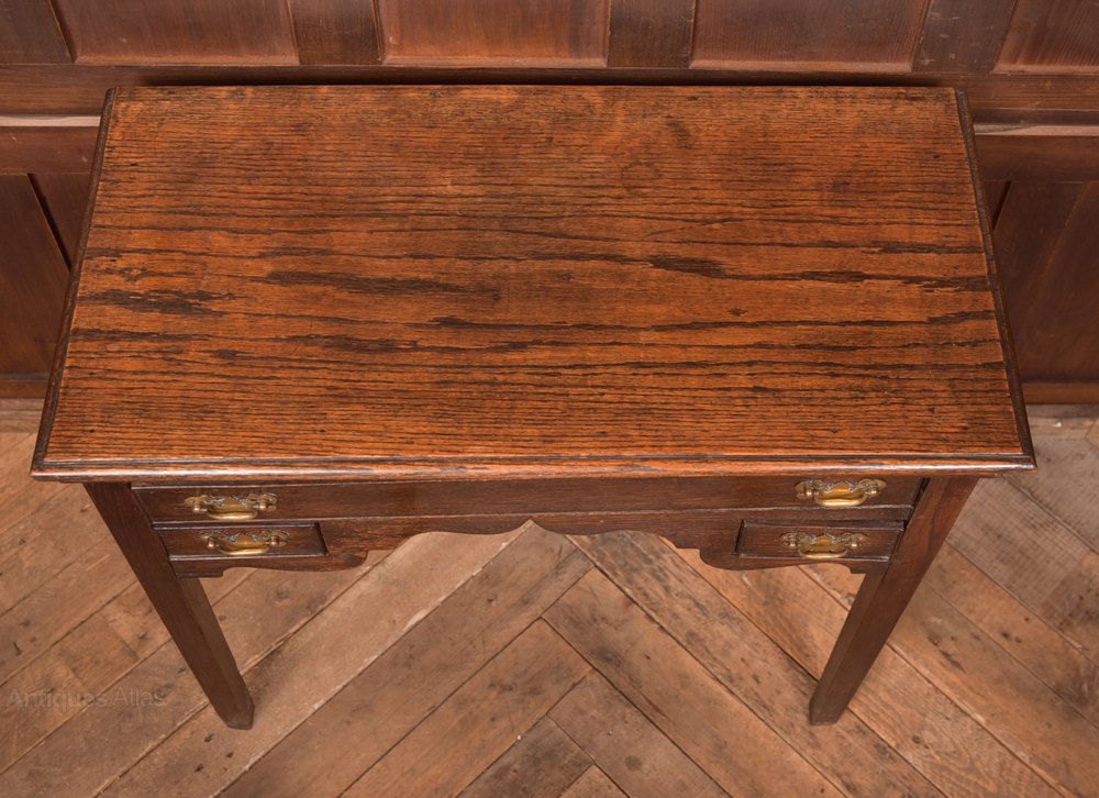 Handsome 18th Century lowboy of neat proportion in fabulous solid oak. The single long drawer in the frieze and two small drawers in it's beautifully shaped apron are all oak lined with attractive brass handles. It stands on four square slightly tapered legs. This is a charming piece with wonderful graining and amazing patina, the perfect addition to any room.