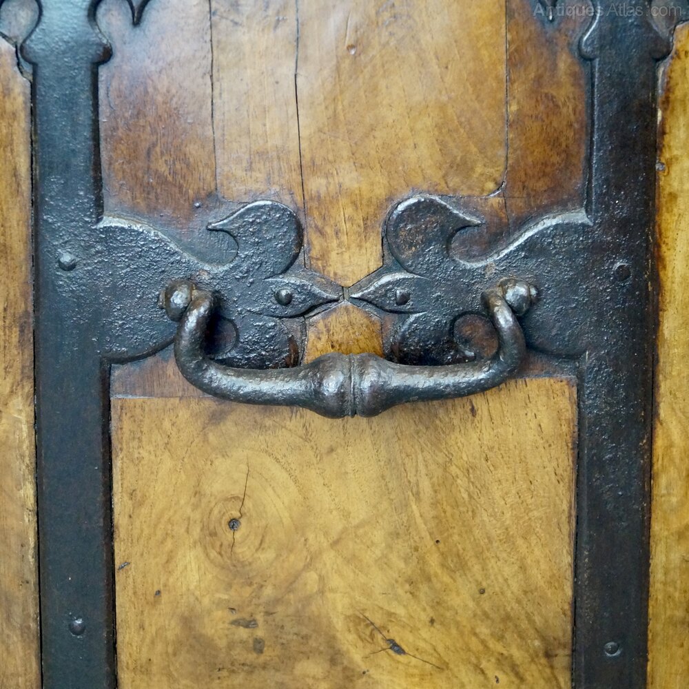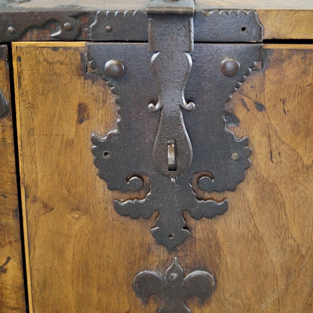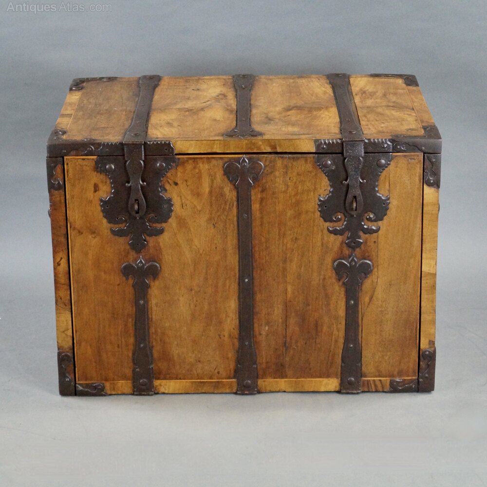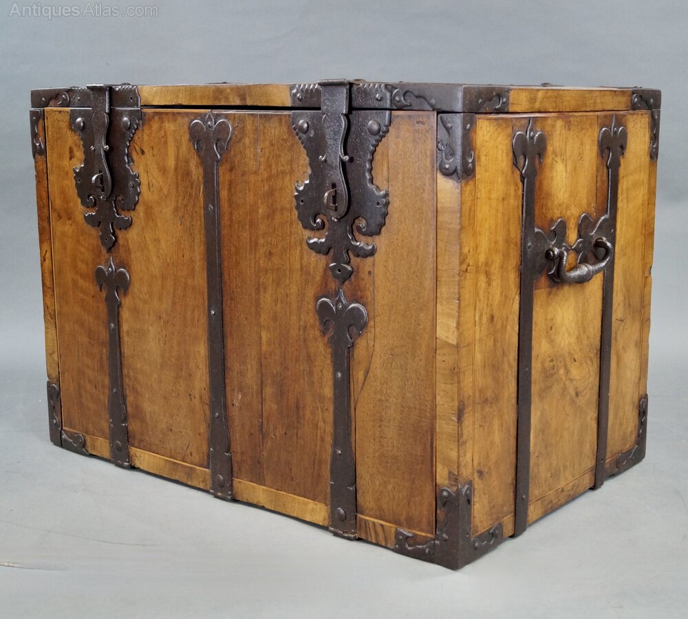 An 18th century walnut strong box with decorative steel strap work, carrying handles and lock plates. The interior, with walnut and birds-eye maple, has four small drawers and a secret compartment. In good and original condition. 500mm high, 700mm wide and 460mm deep. Dutch. Circa 1720.
