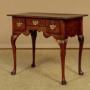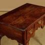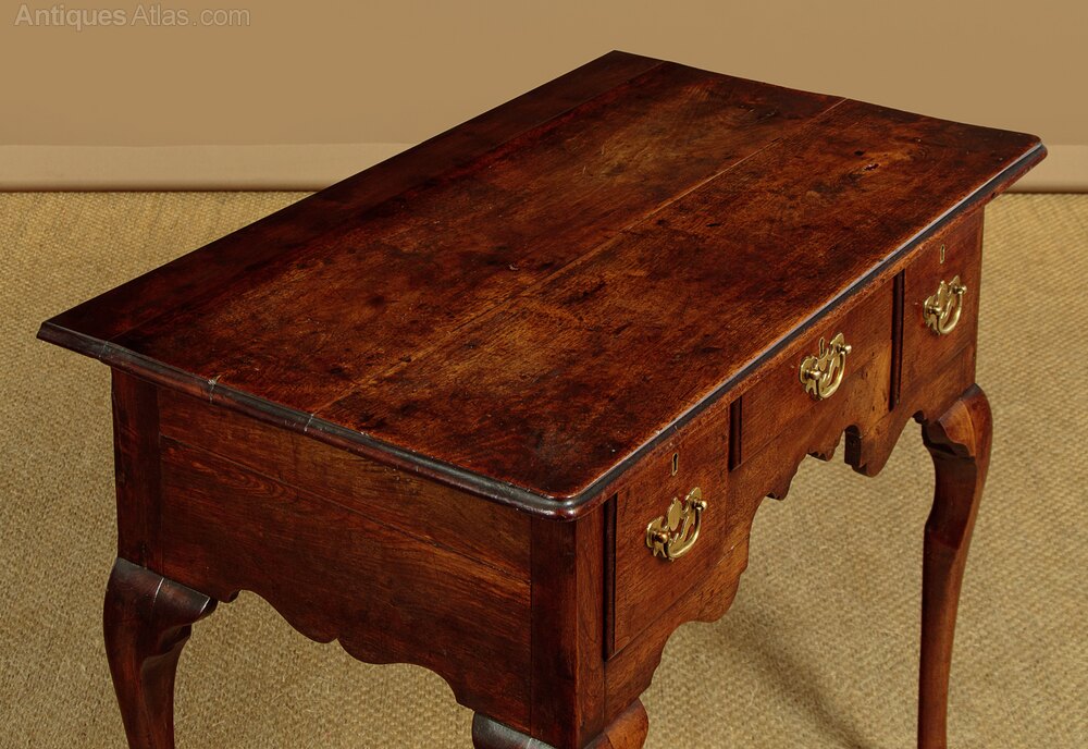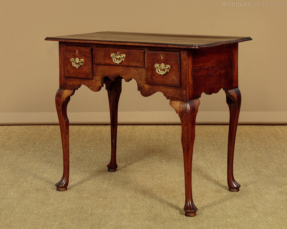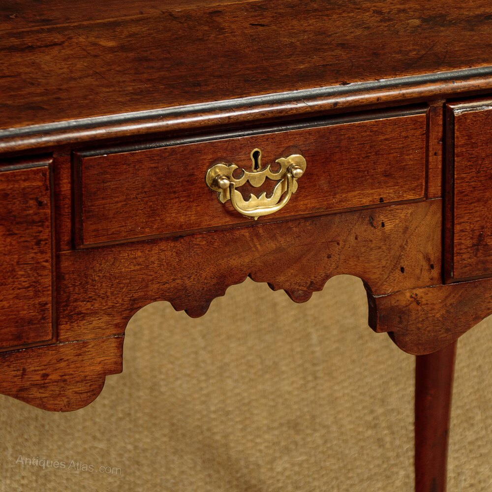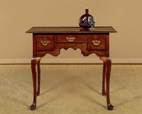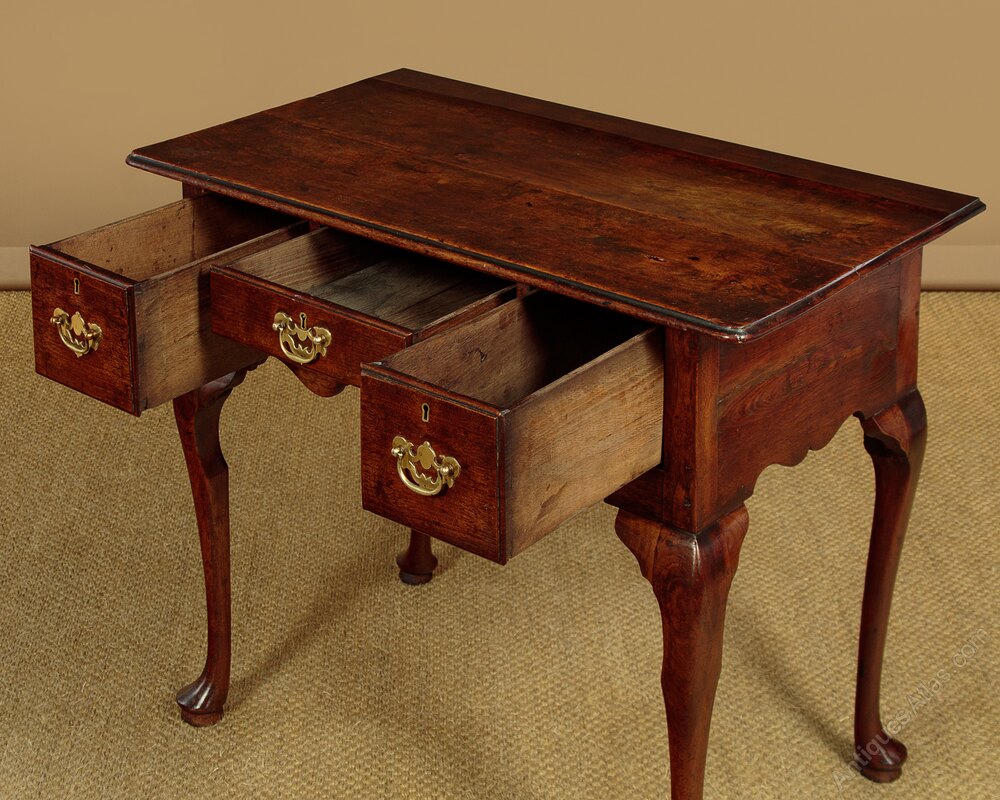Delightful early 18th.c. Queen Anne walnut lowboy or side table c.1710. Three plank top with a moulded edge over three small drawers. Solid walnut drawer fronts with moulded edge and period brass handles. Particularly attractive shaped apron to the front and sides. Raised on slim cabriole shaped legs with pad feet front and rear. Solid walnut sides and oak drawer lining. Excellent colour and condition, cleaned and waxed in our workshops.
