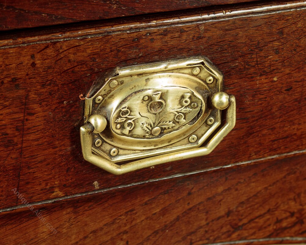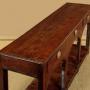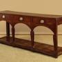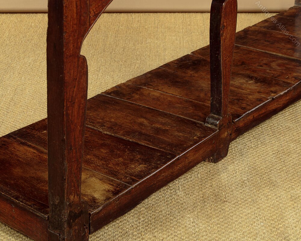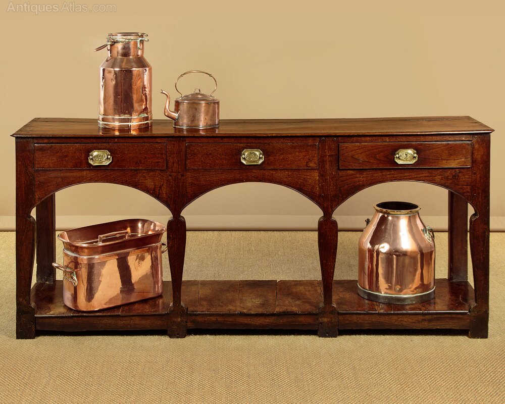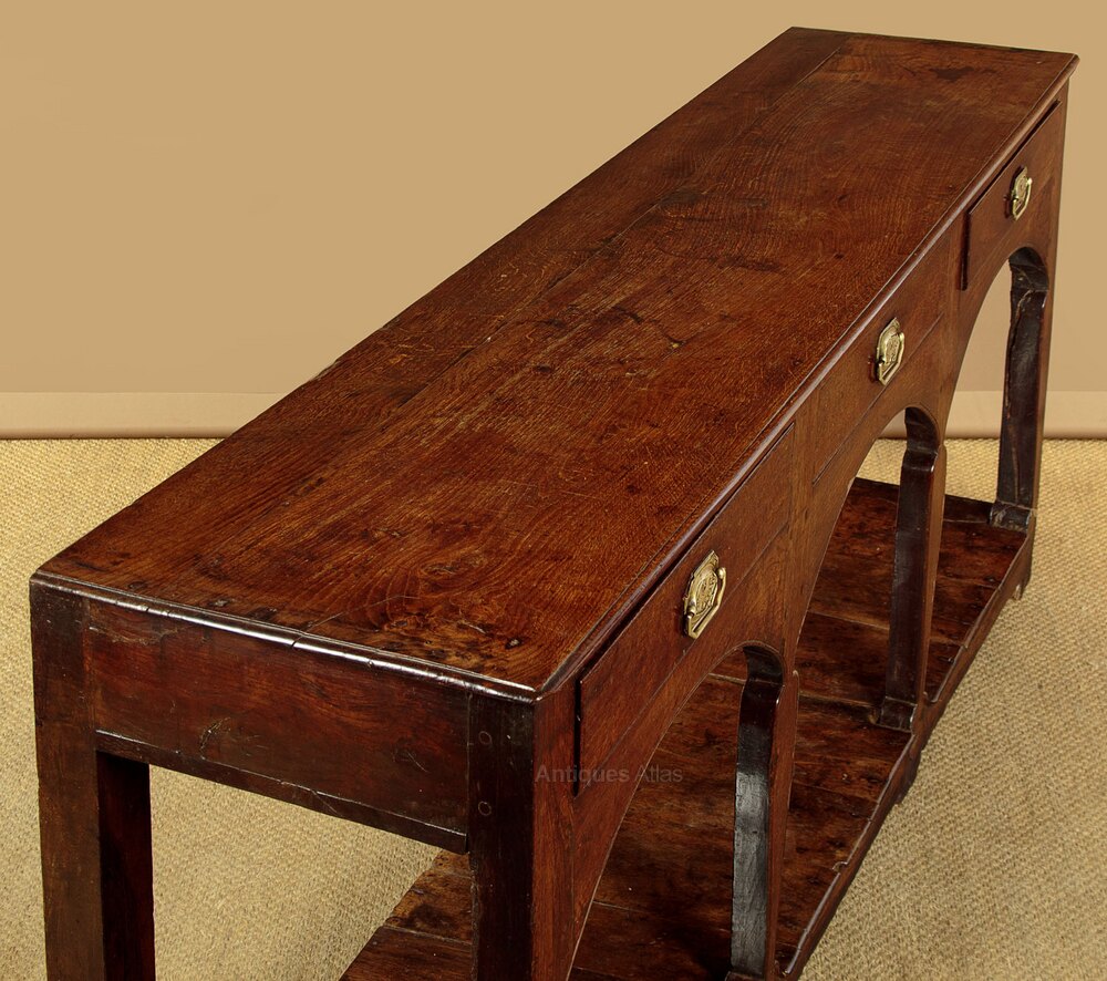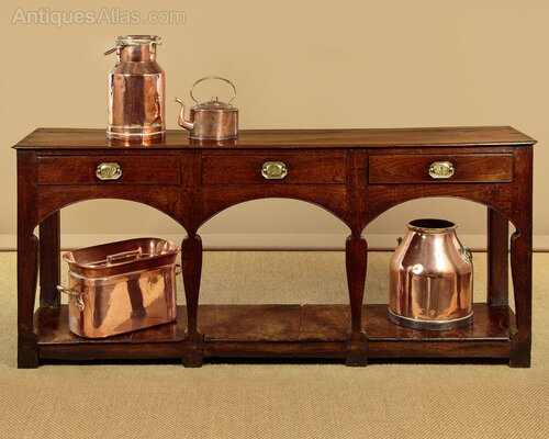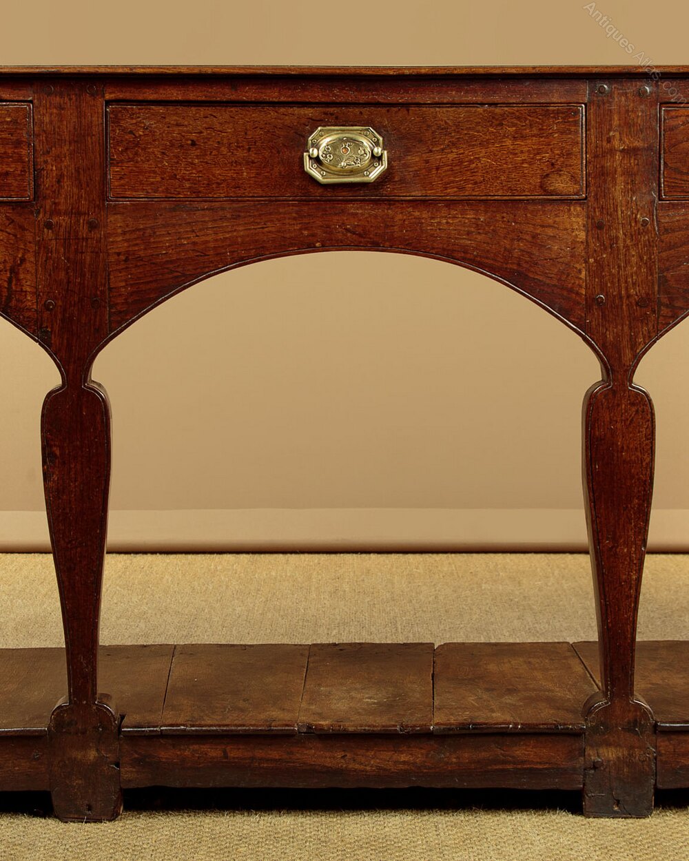 Unusual late 18th.c. oak Welsh potboard dresser base from mid wales (Brecon or Montgomeryshire) c.1770. Two plank top with a simple moulded edge (note the 12½" deep front board). Over three slim drawers with scratch carved edges to the drawer fronts and what appear to be the original brass handles with an attractive thistle motif to the back plates. Three shallow arches to the apron raised on unusually shaped baluster silhouette legs. Joined to the sturdy square rear stiles with an open potboard display shelf with the original oak boards. Oak sides and back. Note the pegged construction. Repairs to the bottom of the legs, otherwise very good condition with excellent colour and patina. Restored, cleaned and waxed in our workshops.