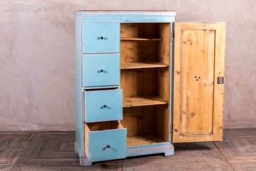 The cabinet has four drawers to the left, and a large cupboard space to the right. A wonderful piece of furniture, which would be ideal for the storage of jars and tins in a large pantry, or for storing towels, toilet rolls and bottles in a bathroom.