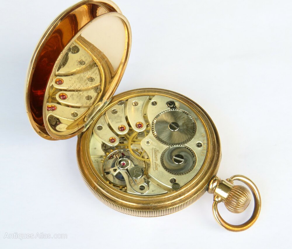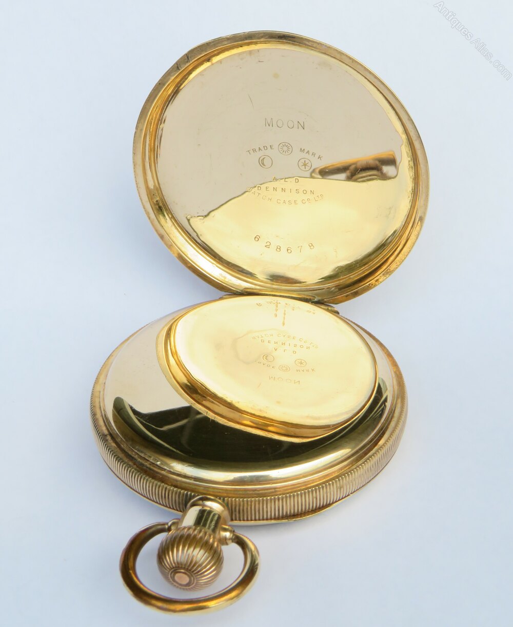 The watch measures 50mm diameter excluding the winding stem and the loop. The case is the gold filled Moon model from the Dennison Watch Case Company. The front and sides of the case are in good condition. The hinged case back has engine turned detail and a vacant cartouche. There is a rubbed ring around the edge, just from where it has sat in a pocket over the years.