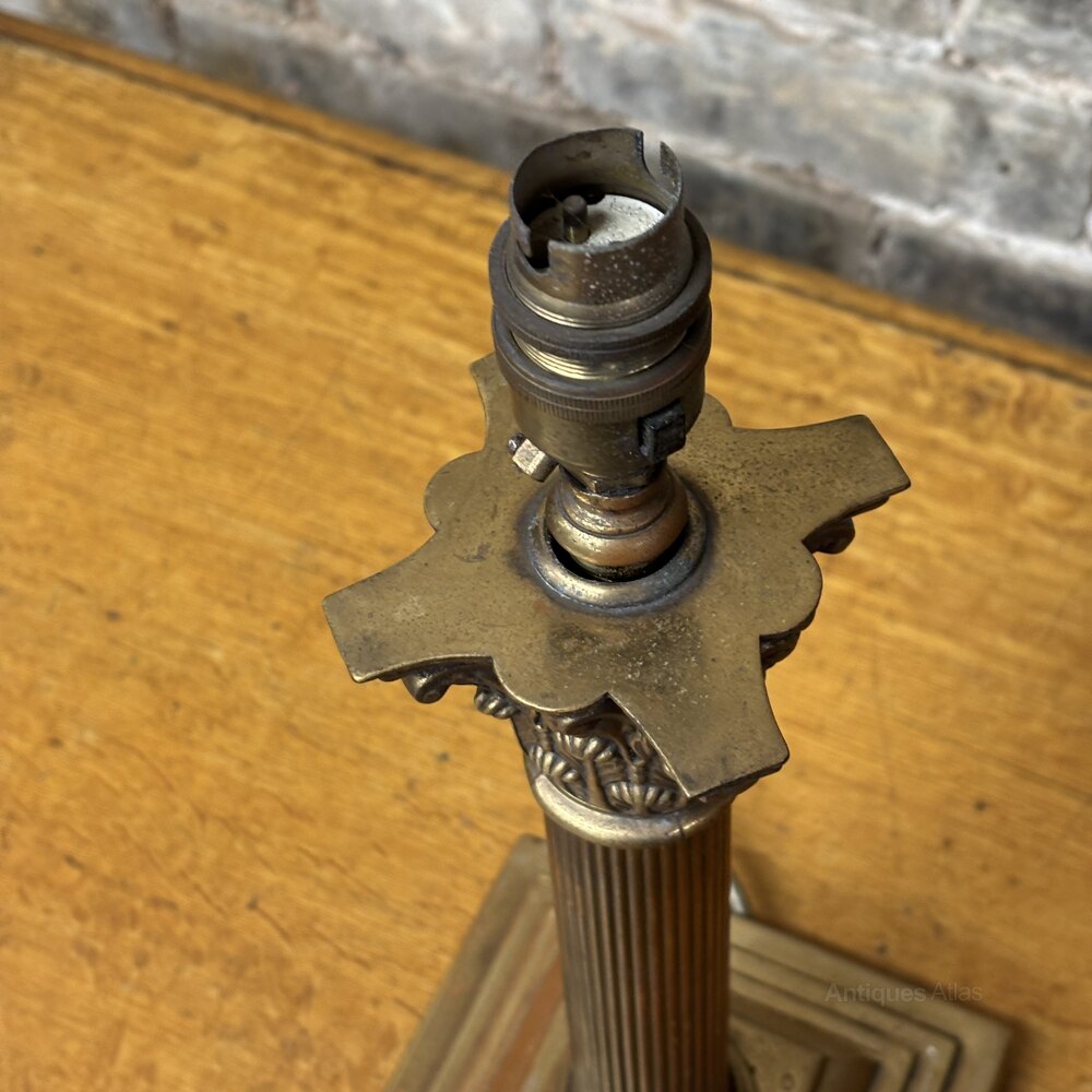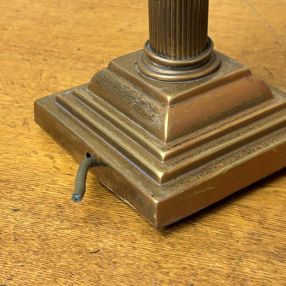 Here we have a 1920s cast brass table lamp in the form of a classical column, raised on a stepped square base. The fluted column is topped with a decorative capital featuring stylised floral and foliate motifs, combining classical architectural influence with a subtle Art Deco feel in its clean lines and simplified ornament.