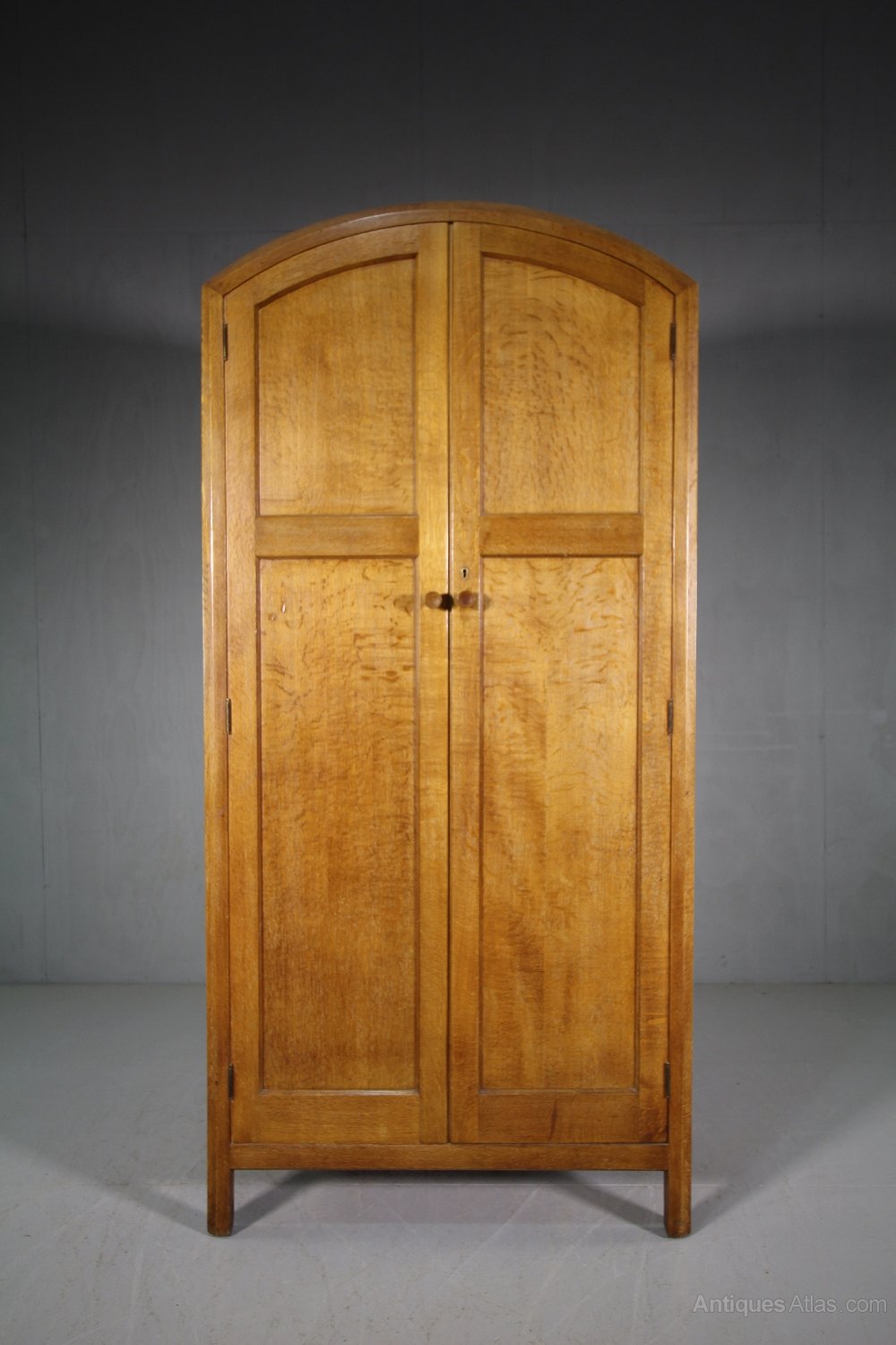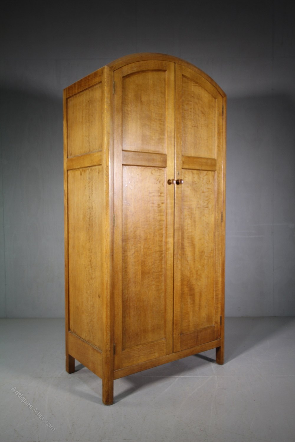 This is a very good quaity, oak dome top wardrobe by Heals of London in the twenties. In the original finish and having the large, Heals makers label inset into a door. In superb condition, inside and out, the wardrobe doors and sides are panelled, inside is the original brass hanging rail and a single storage shelf. A lovely original model, perfect for a smaller bedroom.