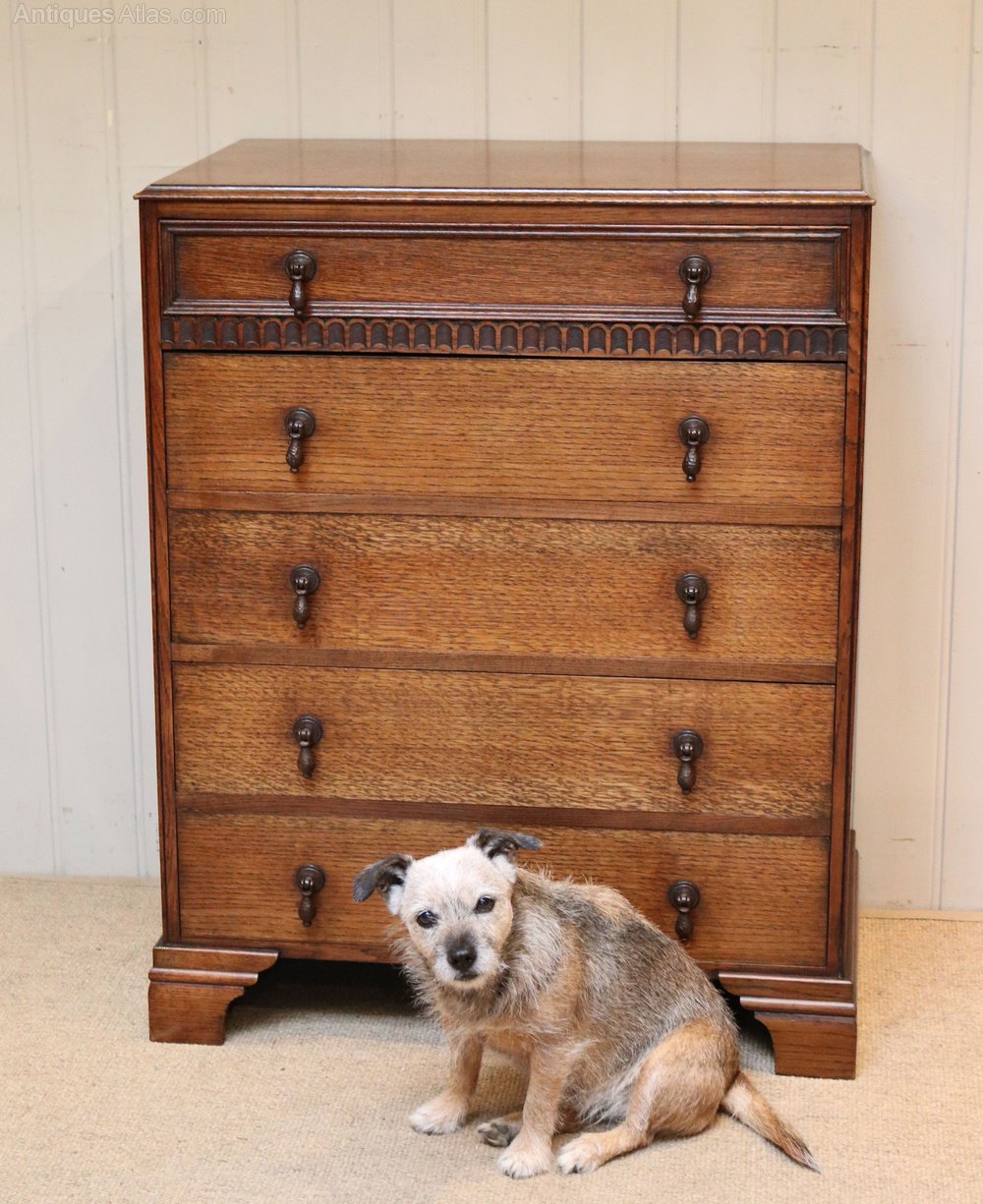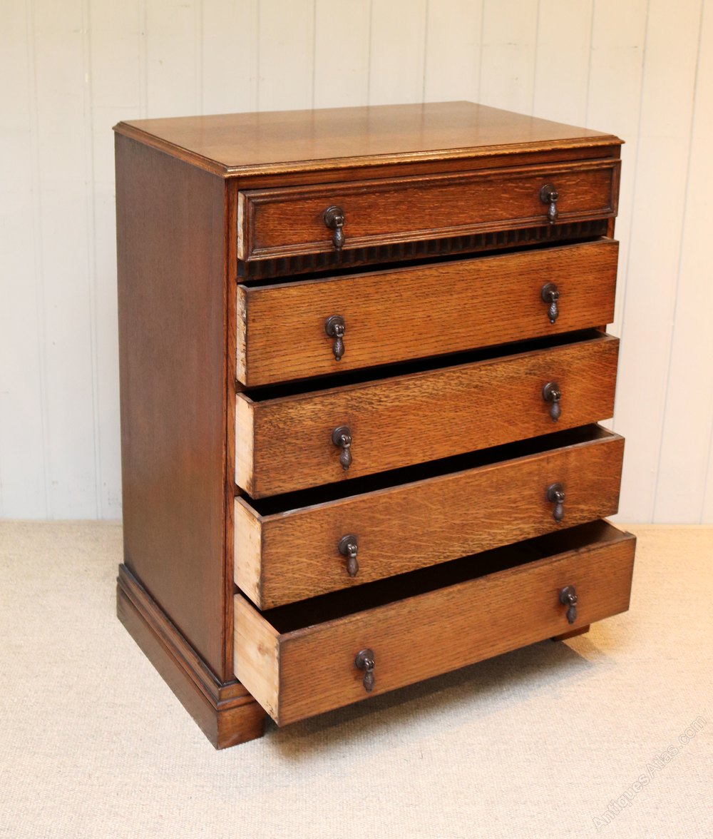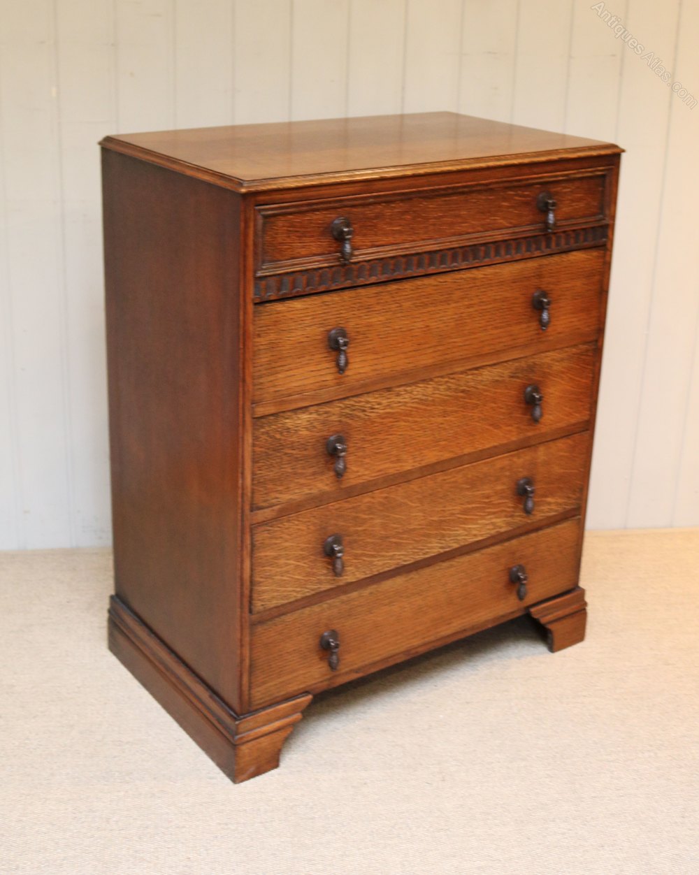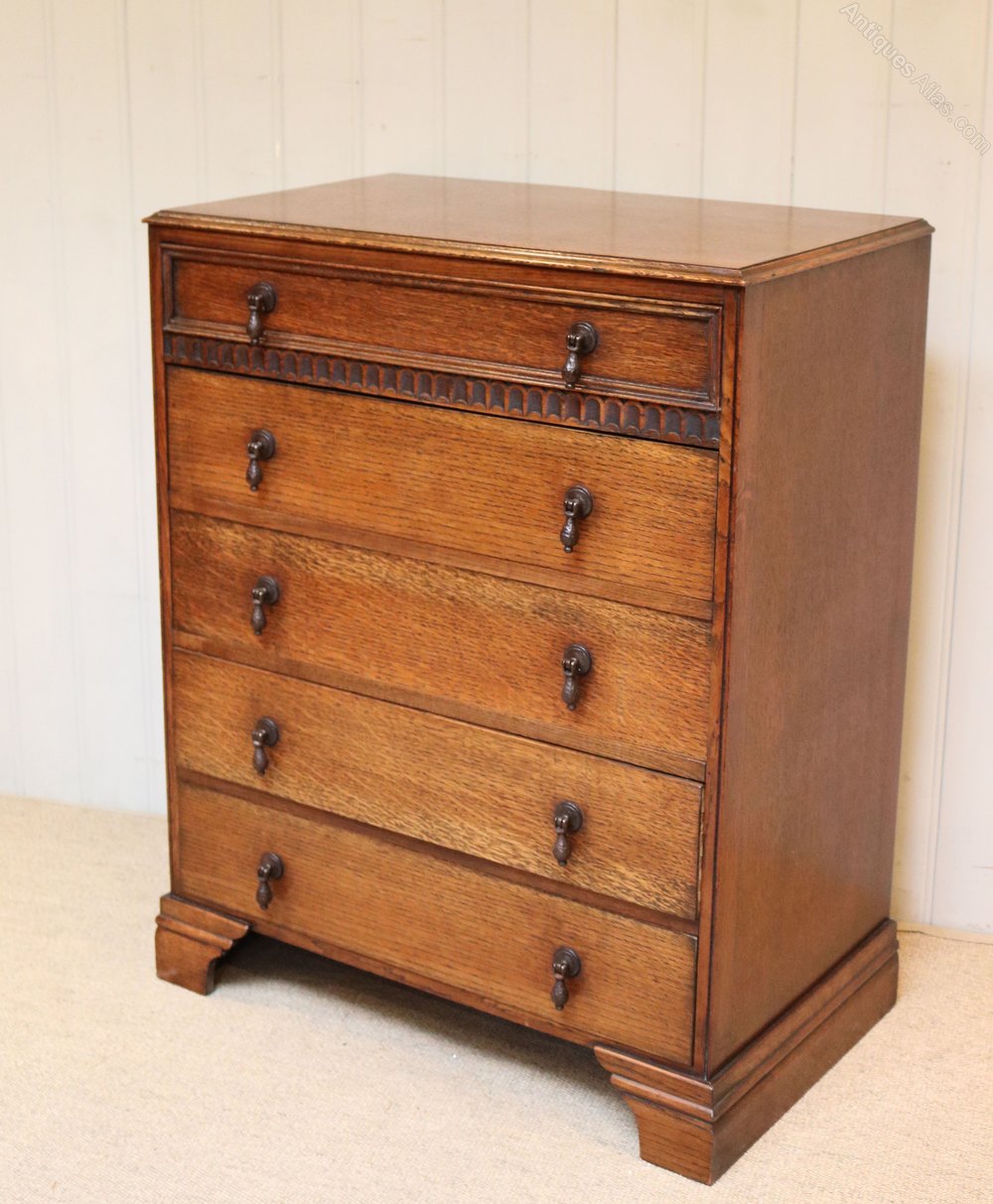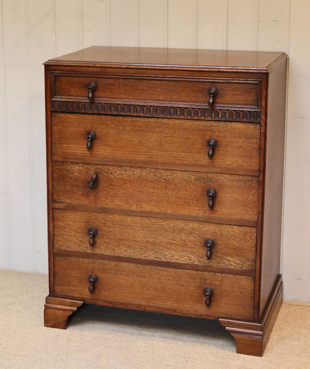 1920s Oak chest of drawers having a carved top frieze with five drawers having brass drop handles raised on bracket feet