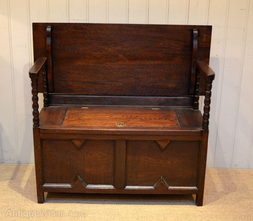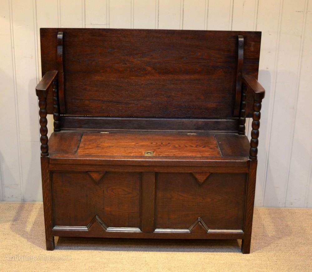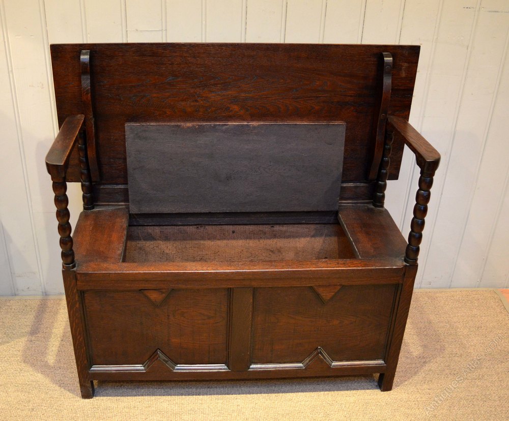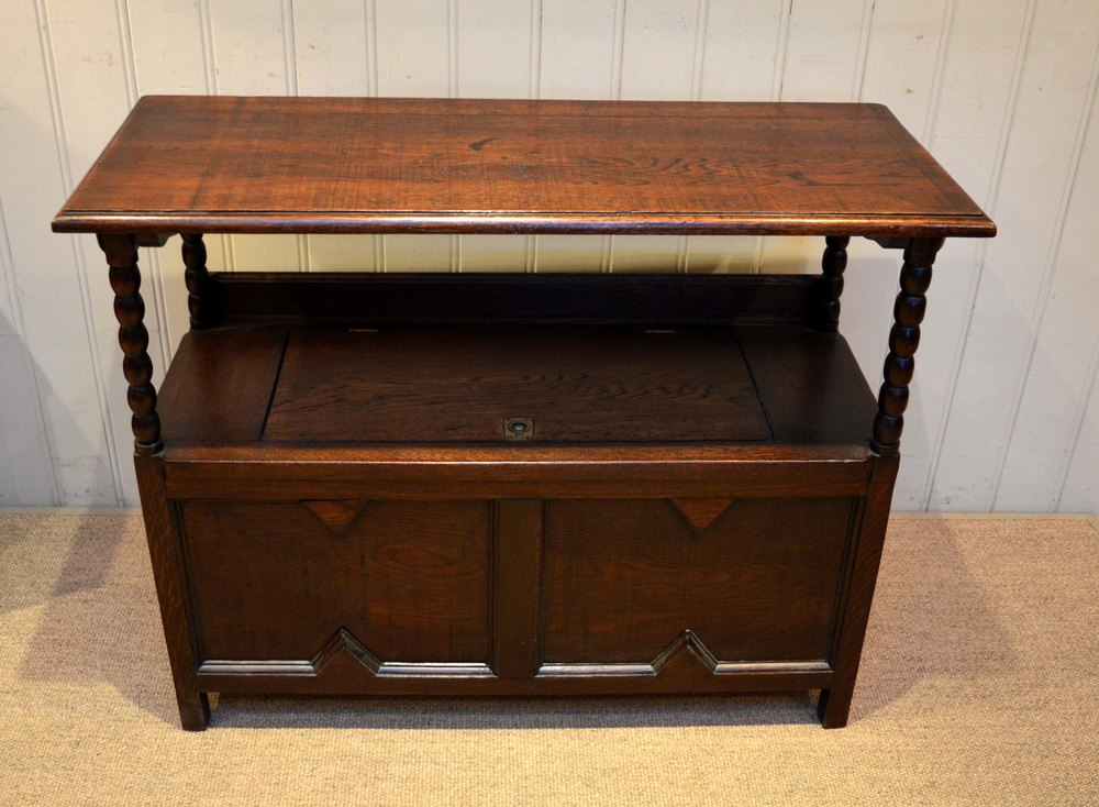 1920s dark oak monks bench having a lift p seat for storage with bobbin turned supports and a top that folds down to become a tableThe height when folded down is 76cm