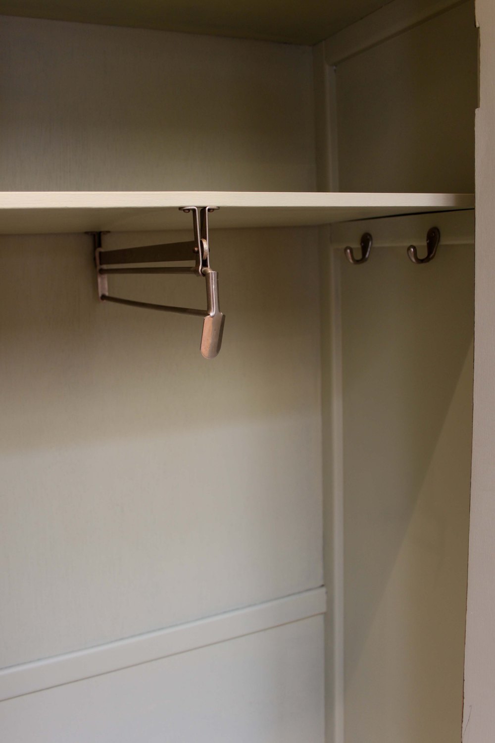 Painted single door hall cupboard / wardrobe having canted corners and fitted internally with a back to front hanging rail