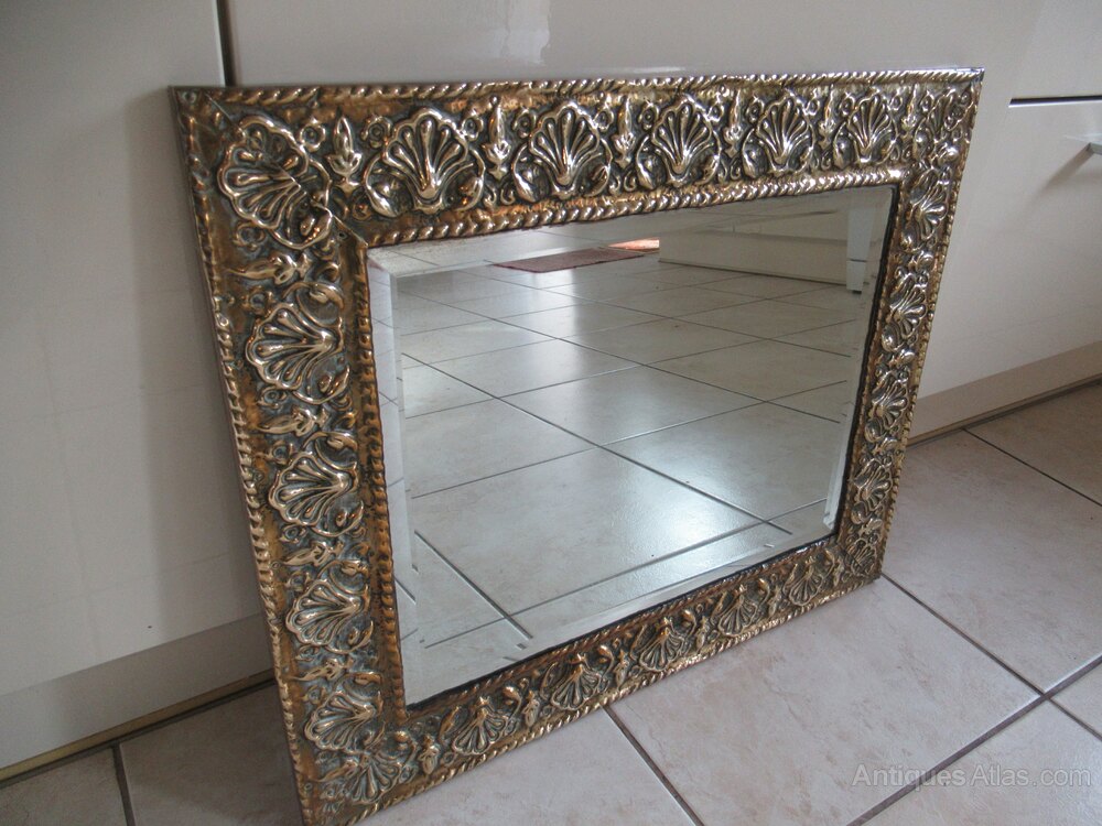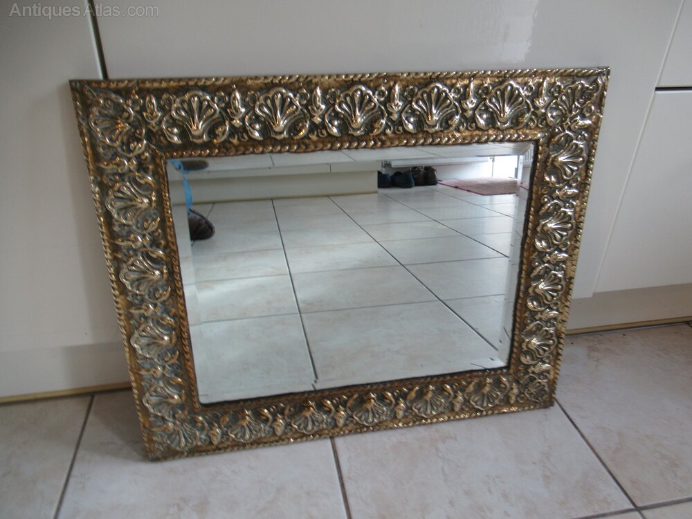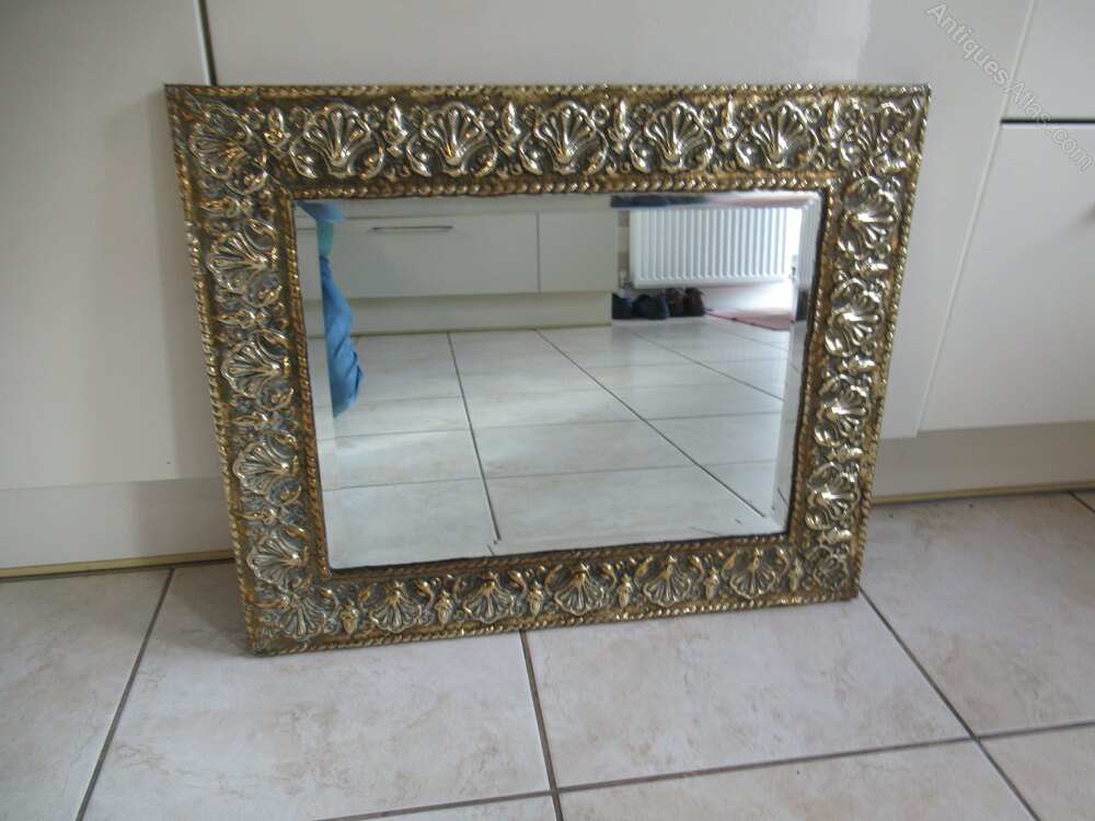 1930s embossed brass wall mirror , with a bevel edge plate glass mirror, in good condition.