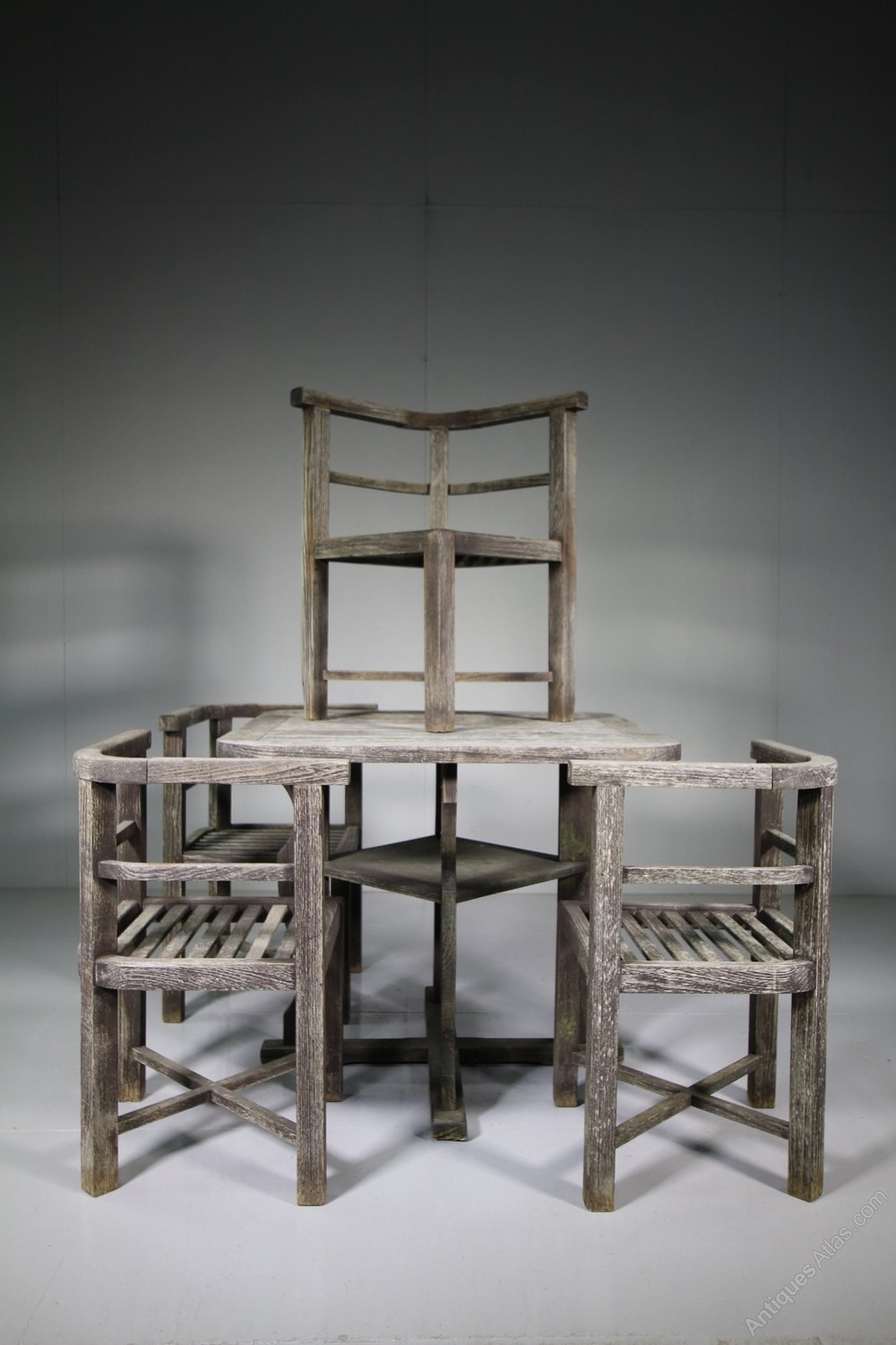 A very original, strong and complete set of English teak garden antique furniture by Heals of London in the early twentie, made from teak wood from the S.S. Otranto, a First Wold War armed merchant cruiser. The teak garden table features a slatted top with urn shaped silhouette legs and a small, solid undershelf. The four Heals teak dining chairs have slatted backs and seats and fit snugly under the table top, to make a neat set when not in use. Perfect for gardens, terraces or even to use inside as a dining set. The teak wood is a lovely, natural silvered colour. Made for Heals of London by Hughes Bolcklow, the ship breaking company in Northumberland. In super condition.