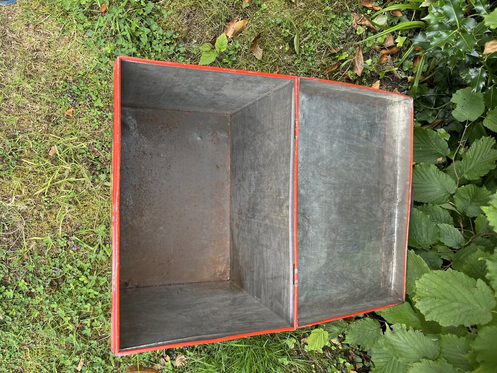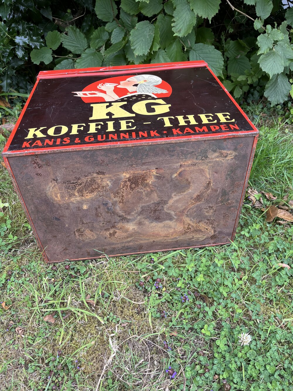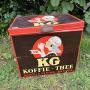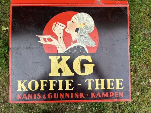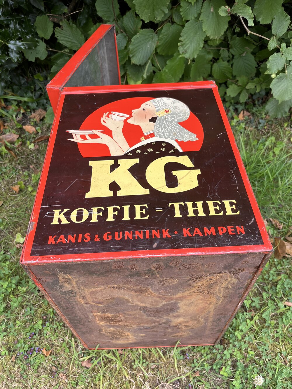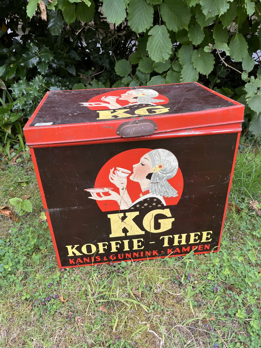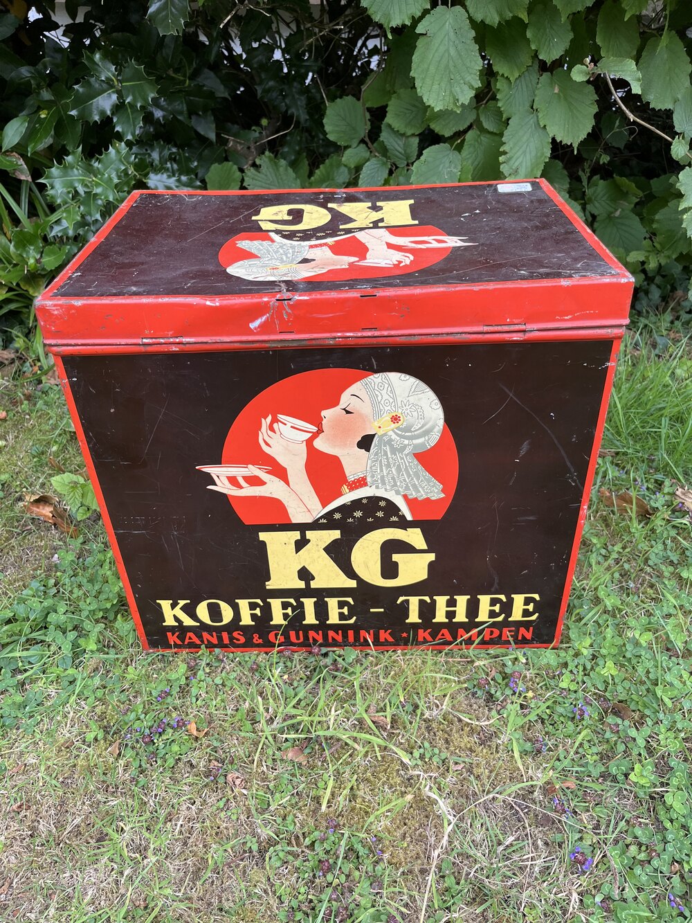 a 1930's KG tea and coffee advertising tin. Measures 42cm wide, 29cm deep and 37cm tall.In good overall condition, a few dents and scratches for it's age. Hinge good, strong colours.
