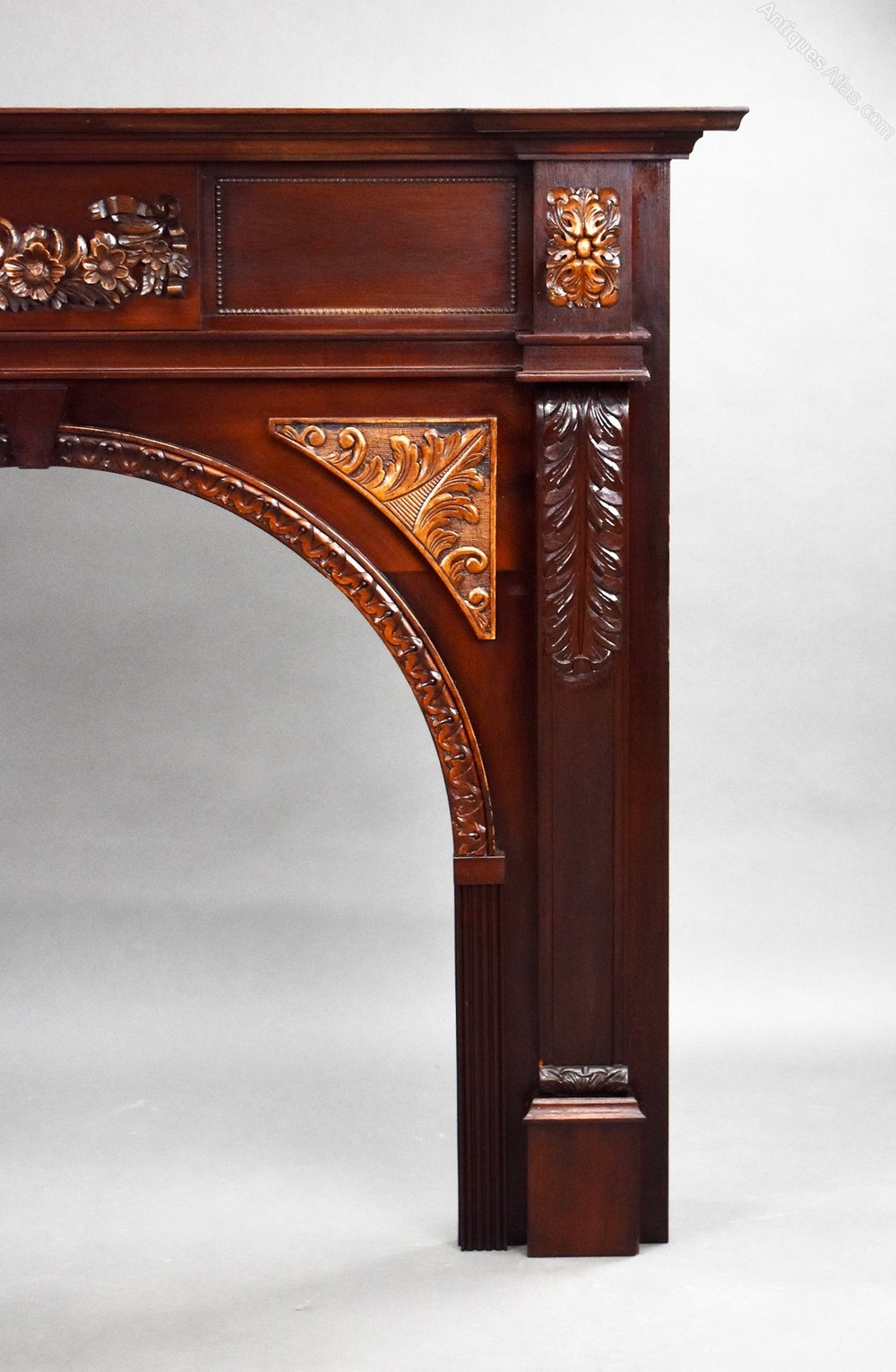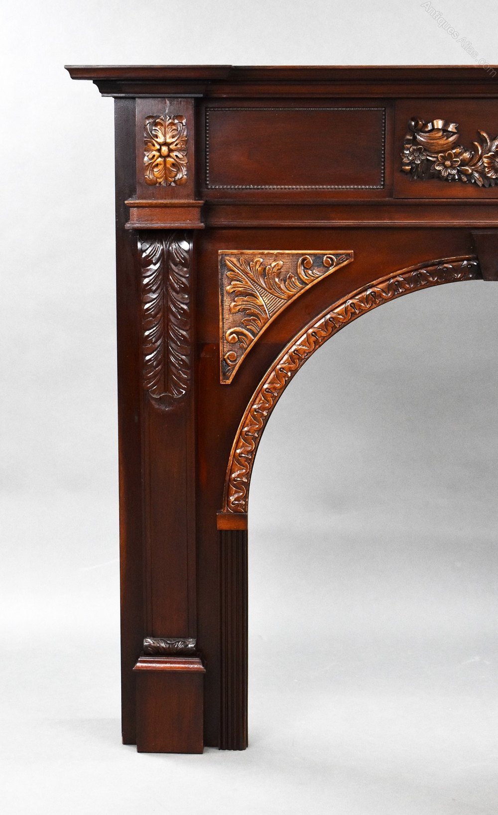 Offered for sale is this 1930s mahogany carved fire surround in good condition with carved flowers to the centre and carved motifs to each column, with a decorative arch.