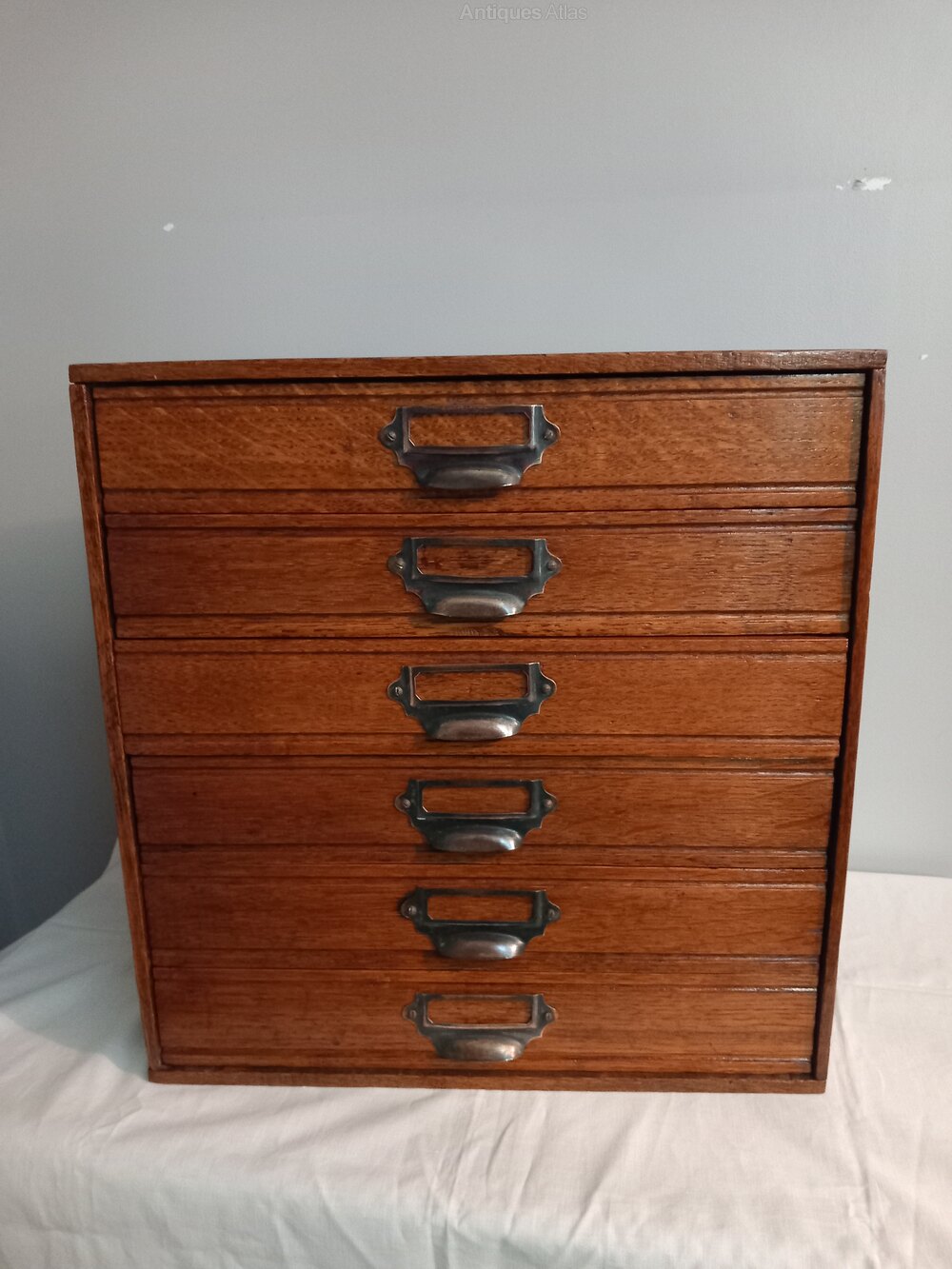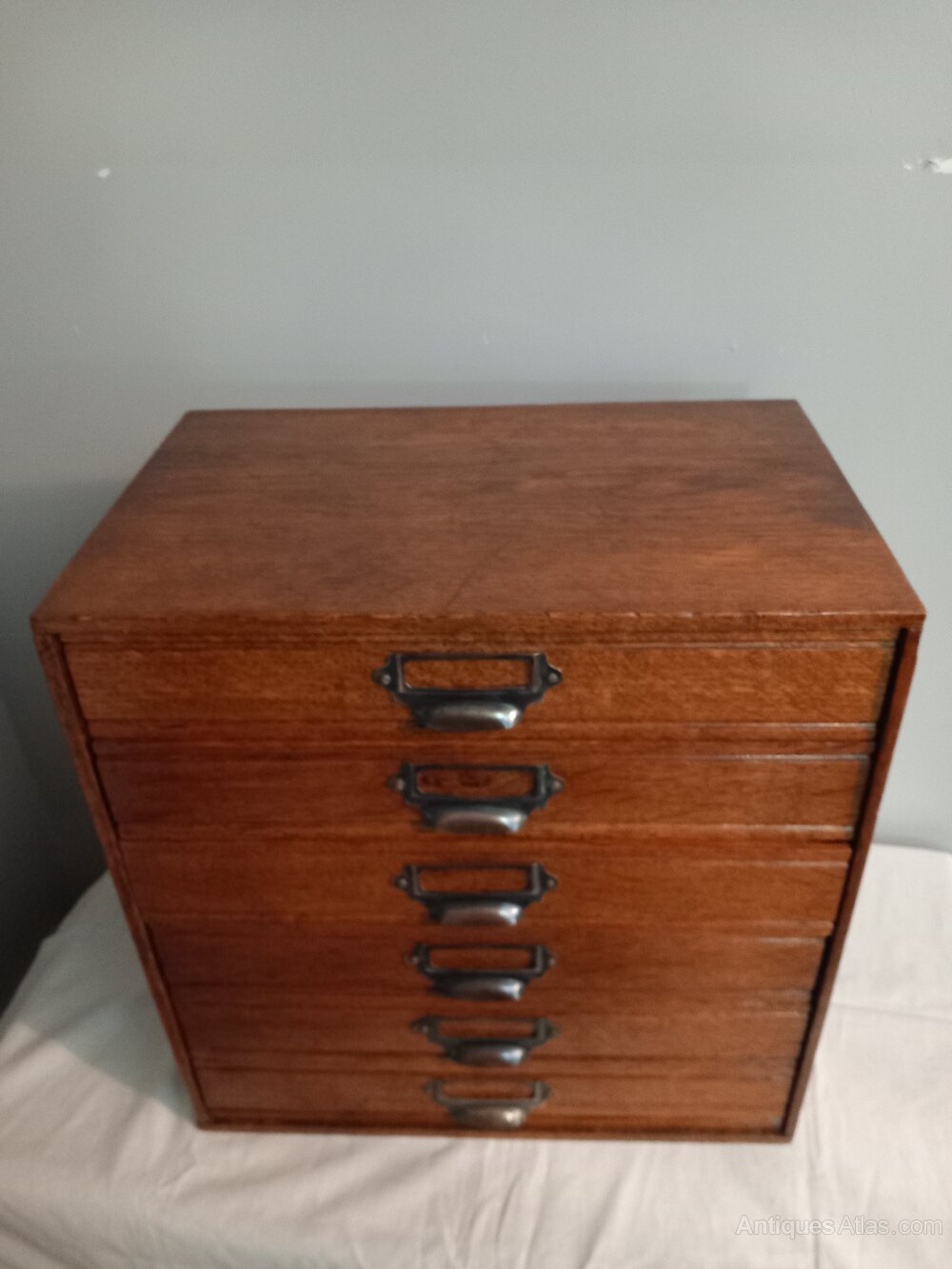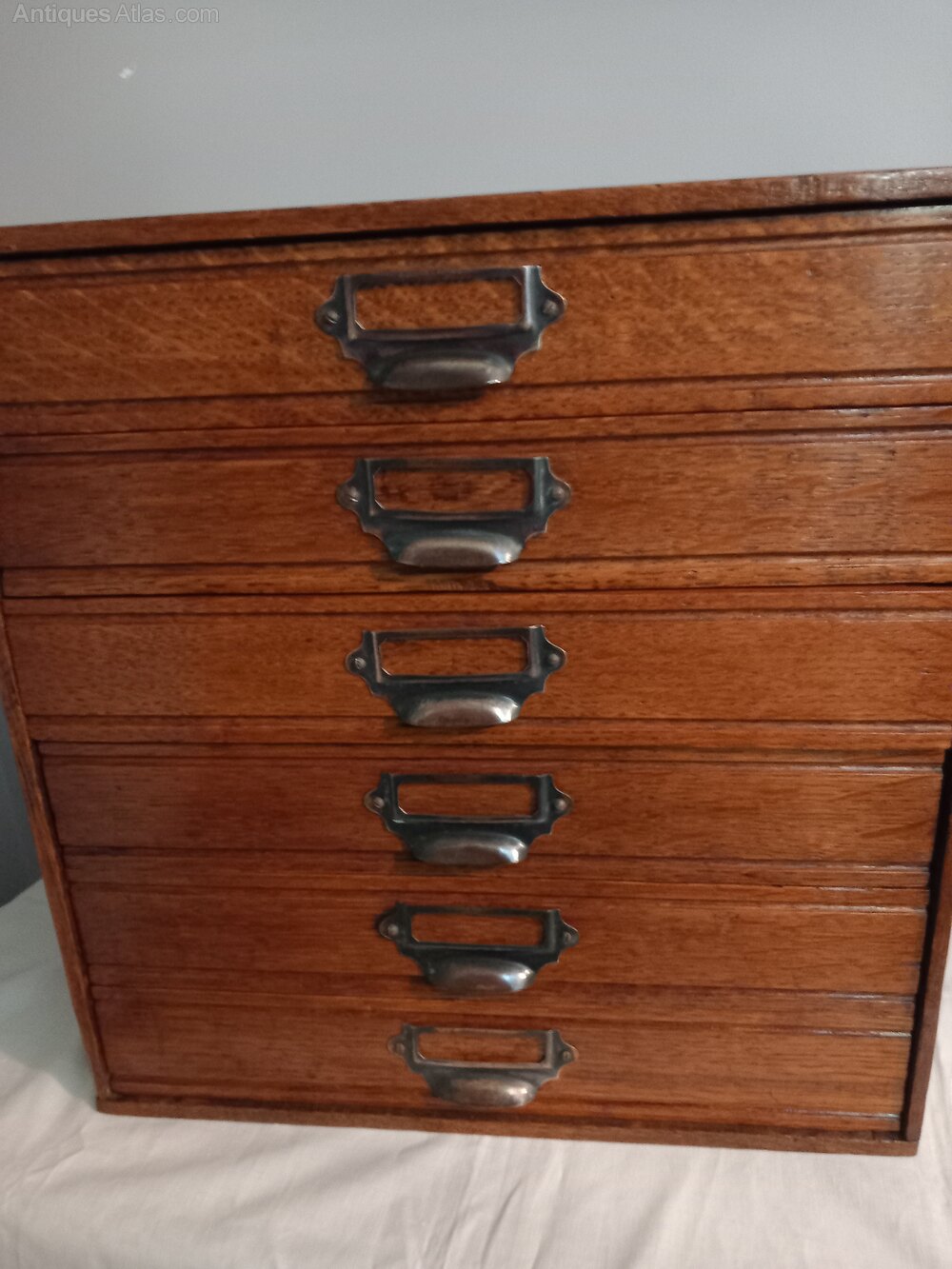 This Genuine Antique Oak Desk/Table Top Chest Of Drawers is perfect for those who appreciate traditional style and quality craftsmanship. Made from oak with original copper handles, this free-standing chest boasts six drawers, providing plenty of storage space for your belongings. Measuring 42 cm in length, 27 cm in depth and 43 cm in height, it is a versatile item that can be placed on a desk or table top.