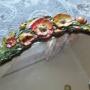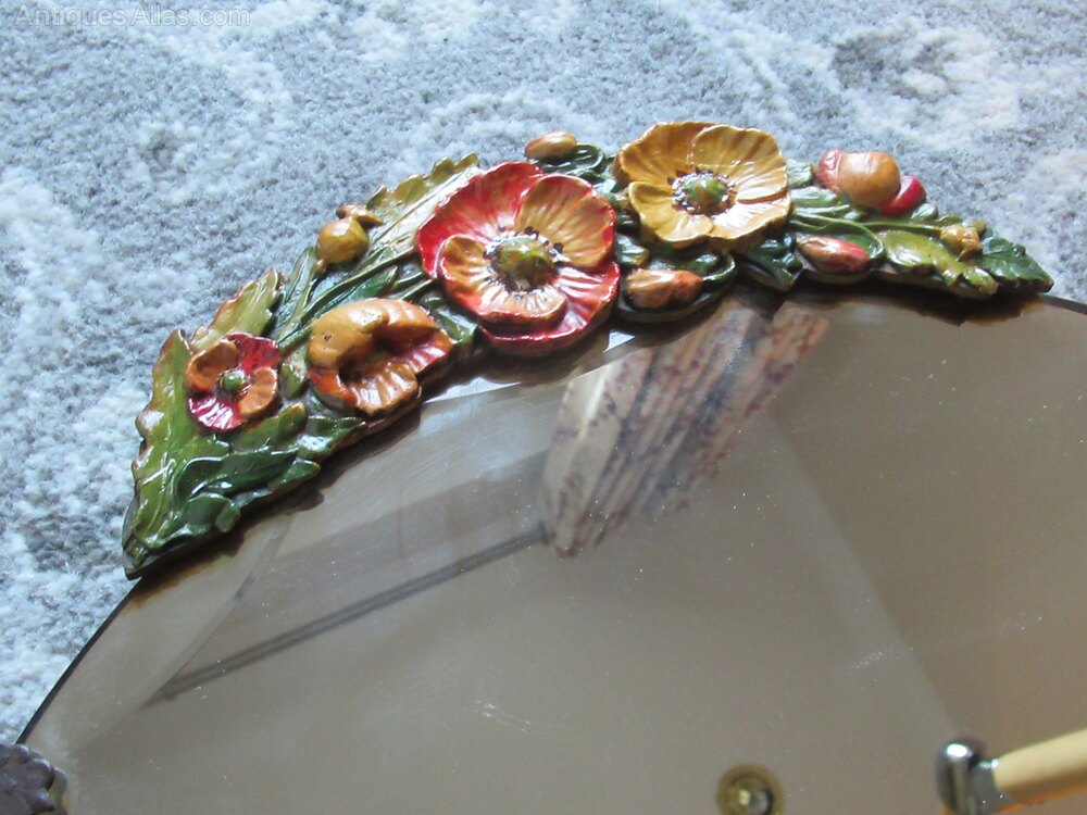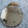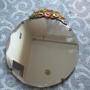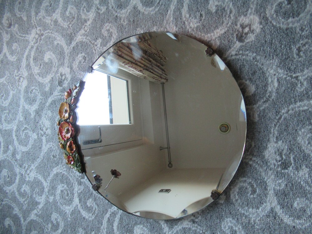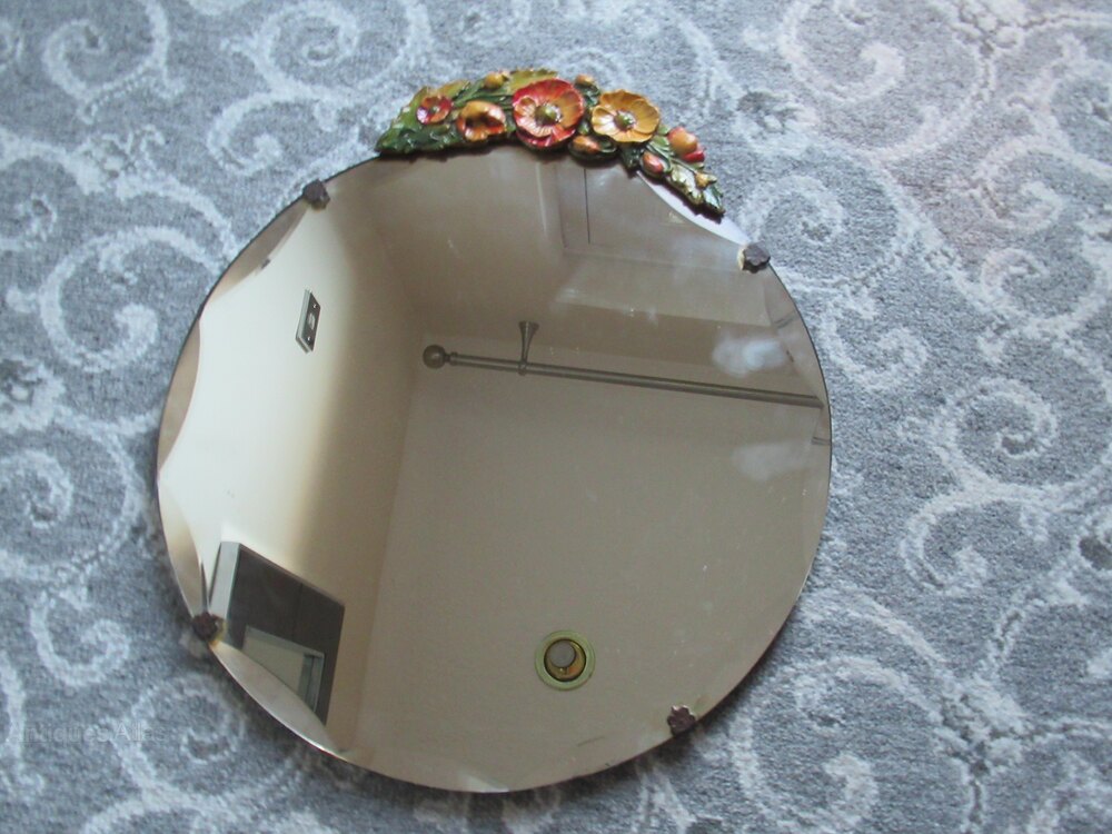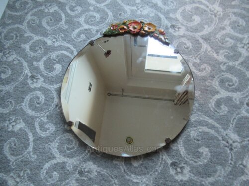 1930S Small round wall mirror, with a bevel edge , the top with coloured plasters work flowers .