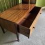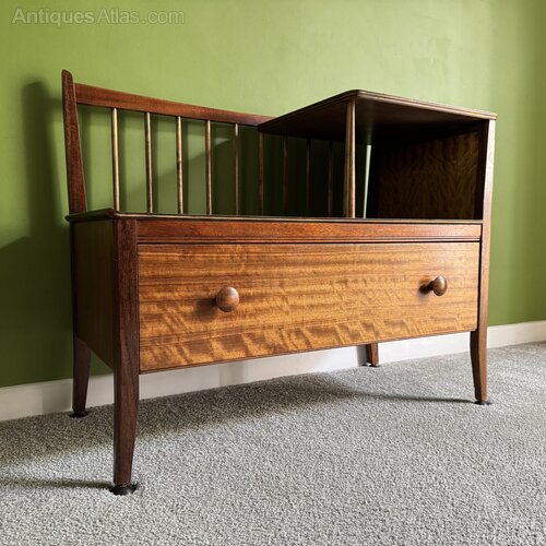 A 1950s telephone bench made by Chippy Heath, a British manufacturer based in High Wycombe. Made of teak and elm, this bench was designed to provide a place to sit whilst talking on the telephone, back in the days of non-mobile phones which couldn't be carried around the house. Nowadays it makes a perfect hallway table for your keys and shoes, but would also work as a bedside table, or just a side table in any room. It has a large drawer and bakelite feet, and comes with a new green seat cushion.