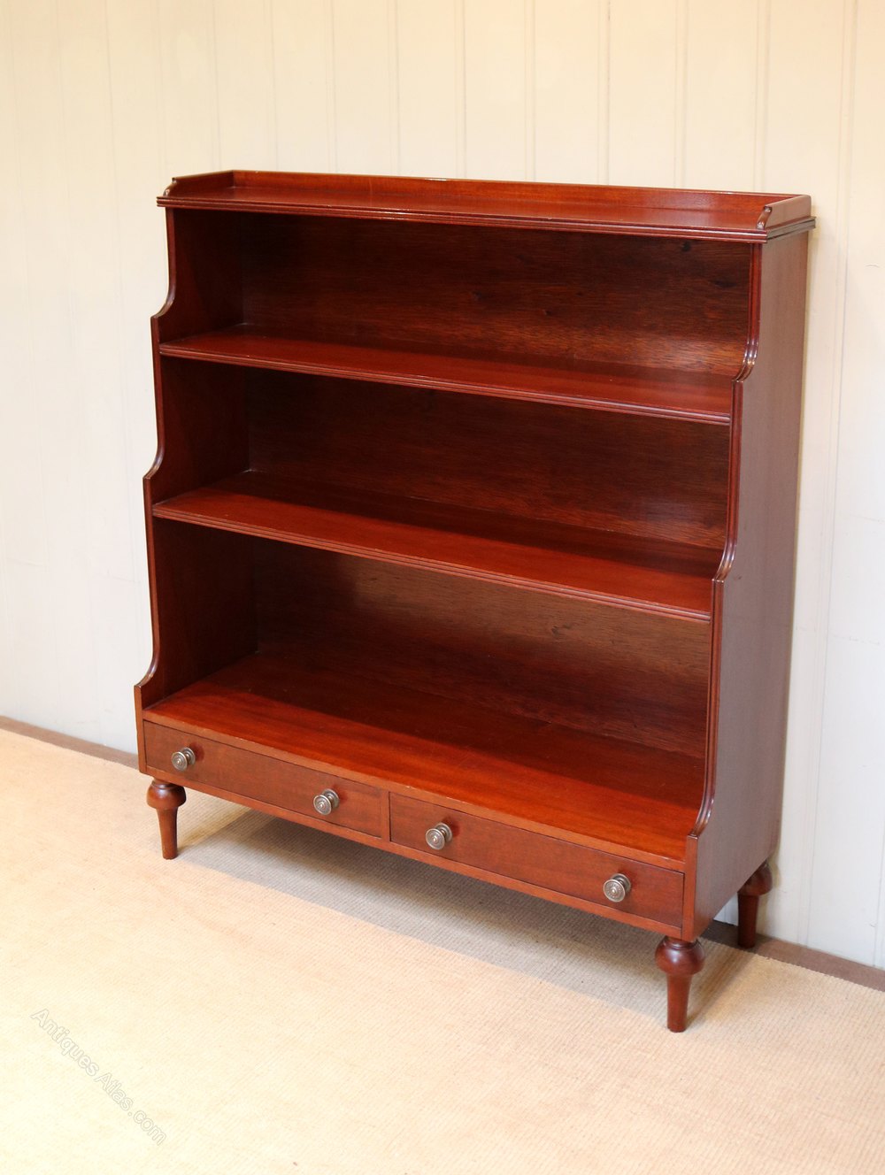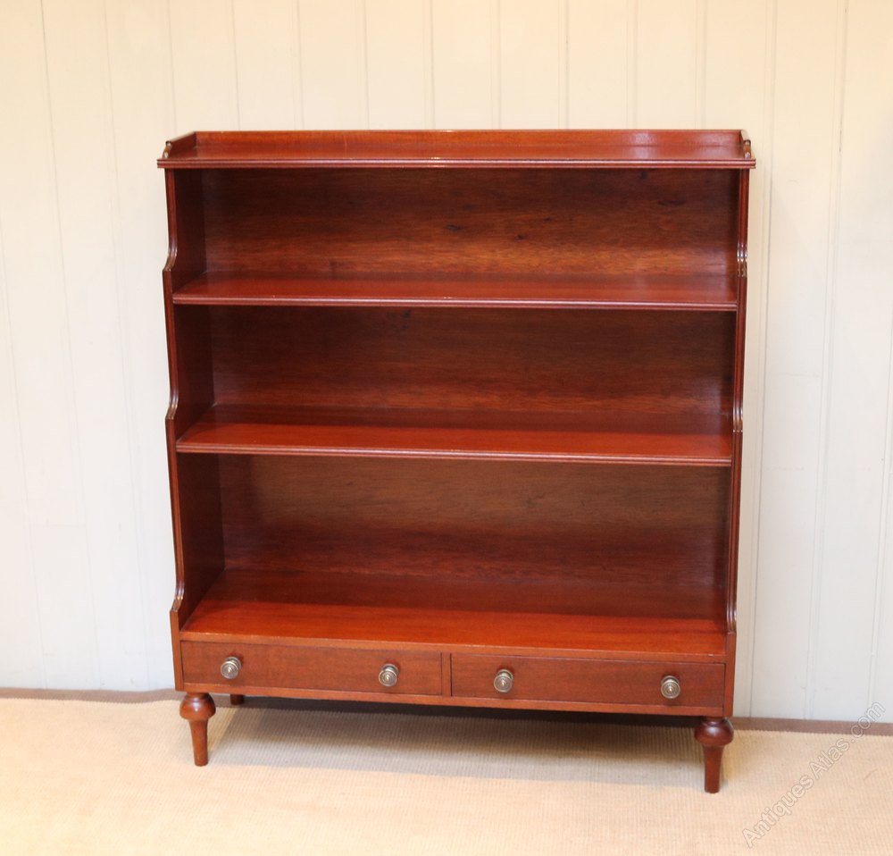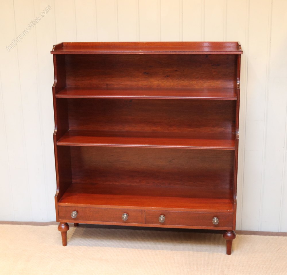 1950s Mahogany open waterfall bookcase having reeded edges with a pair of drawers to the base raised on turned legs