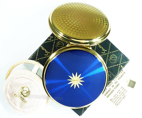 A high quality 1950s Stratton branded makeup compact, which is suitable for loose and solid face powder. Rimmel, CCUK, Max Factor and Miss Beauty 67 mm diameter pans of powder are an ideal fit. The delightful cobalt blue enamel lid is decorated with a gilt star motif. The whole piece is in excellent condition. The catches and hinges work perfectly The mirror gives a clear and accurate reflection. The original box, signed luxury puff, velour edged sifter, padded paper insert, instruction leaflets and pouch are present. Measures 3" and weighs 93.5 grams.