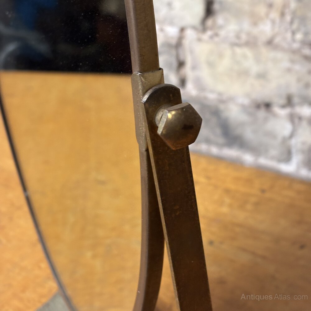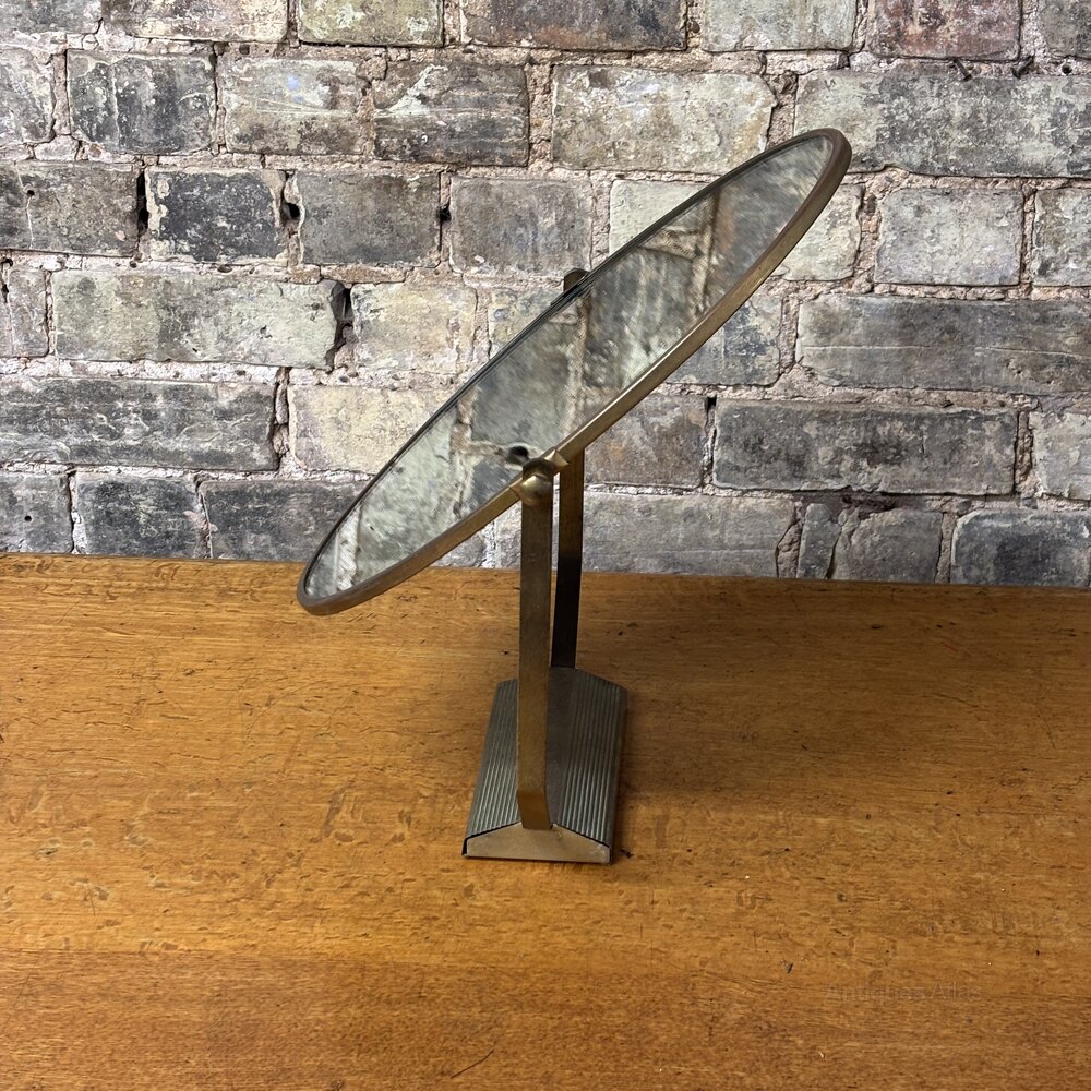 The mirror is set within a slim brass-toned surround and supported by a shaped frame with adjustable side knobs, allowing the angle to be positioned as required. It sits on a stepped, ribbed base, giving a subtle Art Deco influence to the overall design.
