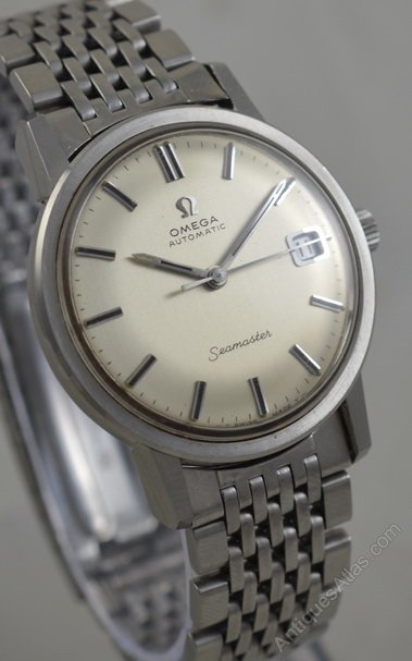A 1968 Omega Automatic Seamaster wristwatch. A silvered dial with silver batons and a central black lining. A date aperture to 3 o'clock, changed by a quick-set mechanism. A stainless steel case with champfered lug edges and original Omega bracelet. A high quality 24 jewel caliber 565 automatic mechanism. Case reference 166.003. Serial numbers date this watch to 1968.
