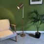 A quality 1970s floor lamp by Studio FMP in tan brown, with adjustable height telescopic pole in brushed steel, and black trim. The lamp is quintessentially 70s with its chunky simple design and warm colour. It features an adjustable spotlight which pivots from horizontal (facing forward) to vertical (facing down), making it useful for both mood lighting and task work. It has a push button floor switch so can be turned on/off with your foot. It's a heavy lamp which gives it stability. It takes a standard screw cap bulb, one supplied.