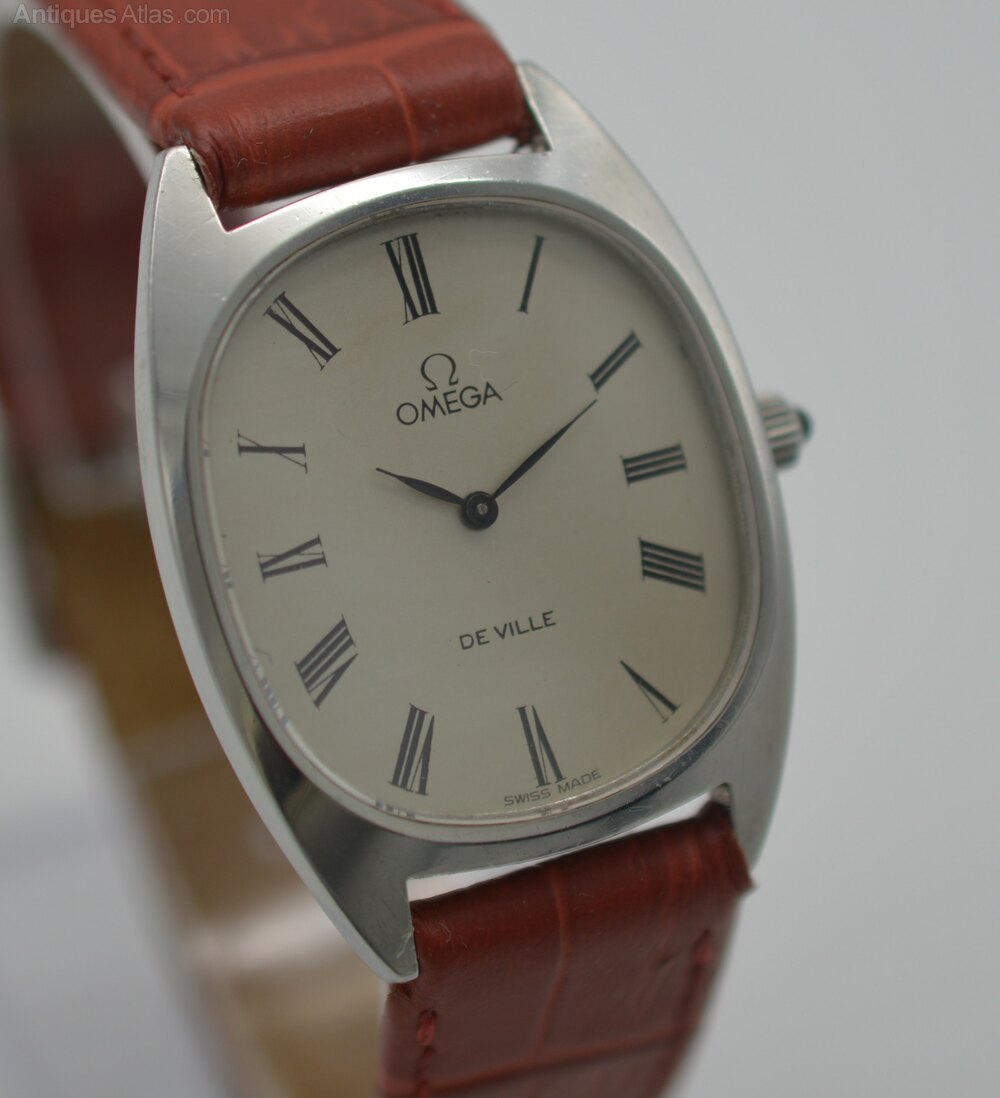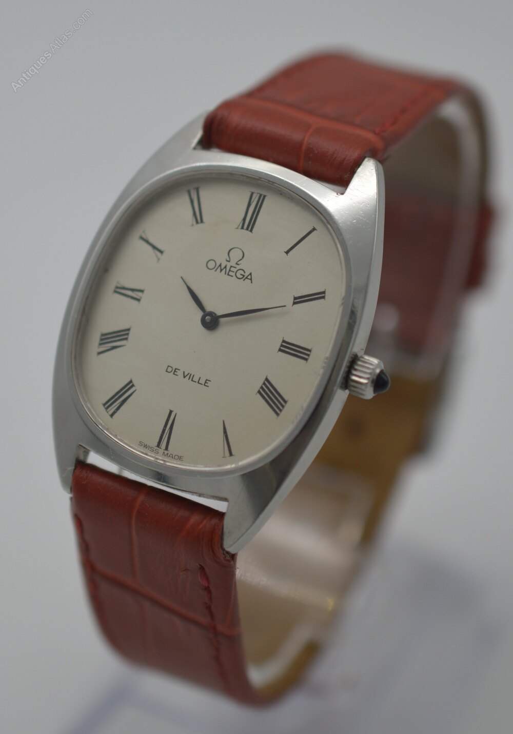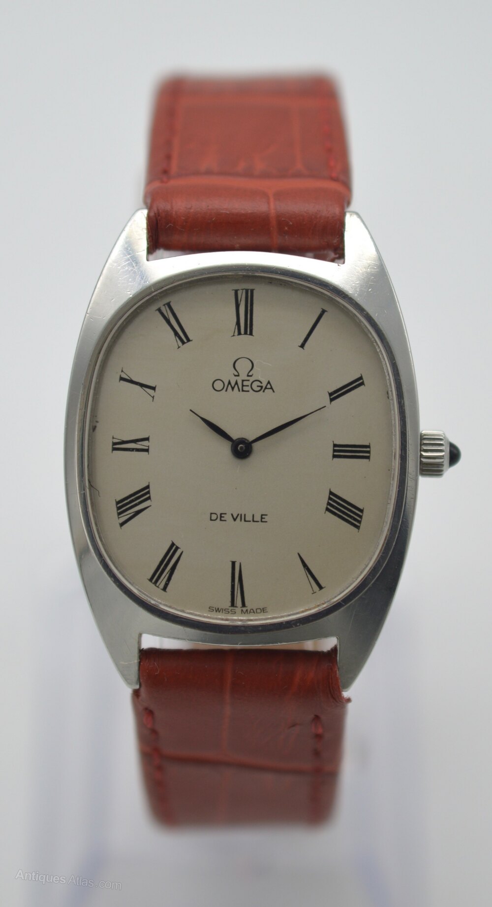 A 1975 Omega De Ville wristwatch. An oval shaped dial, with a silvered finish which creates a light matte look. The hours are marked with Roman numerals, extending at angles to create a circular effect. The Omega and De Ville script is very slightly raised from the dial. The hours and minutes are indicated by slim black hands. Signed Swiss made to the bottom.