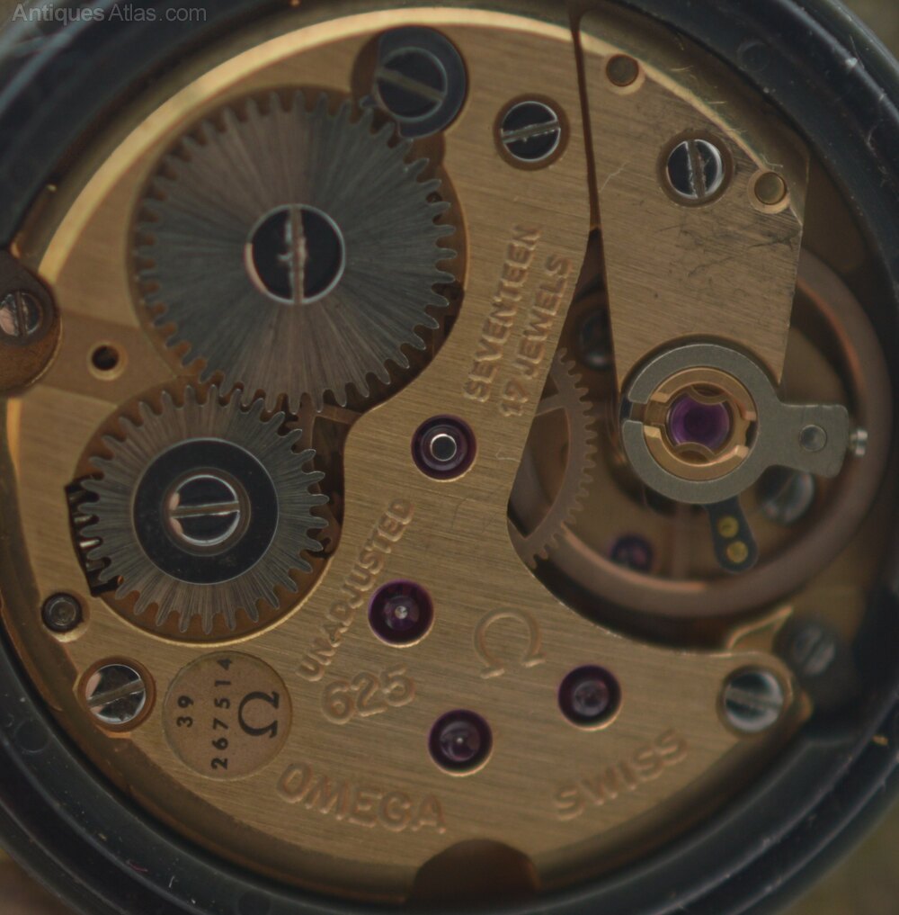 The watch is powered by an Omega caliber 625 manual wind mechanism. The 39M serial numbers date this watch to 1975.