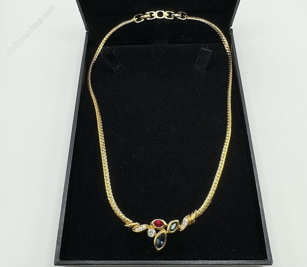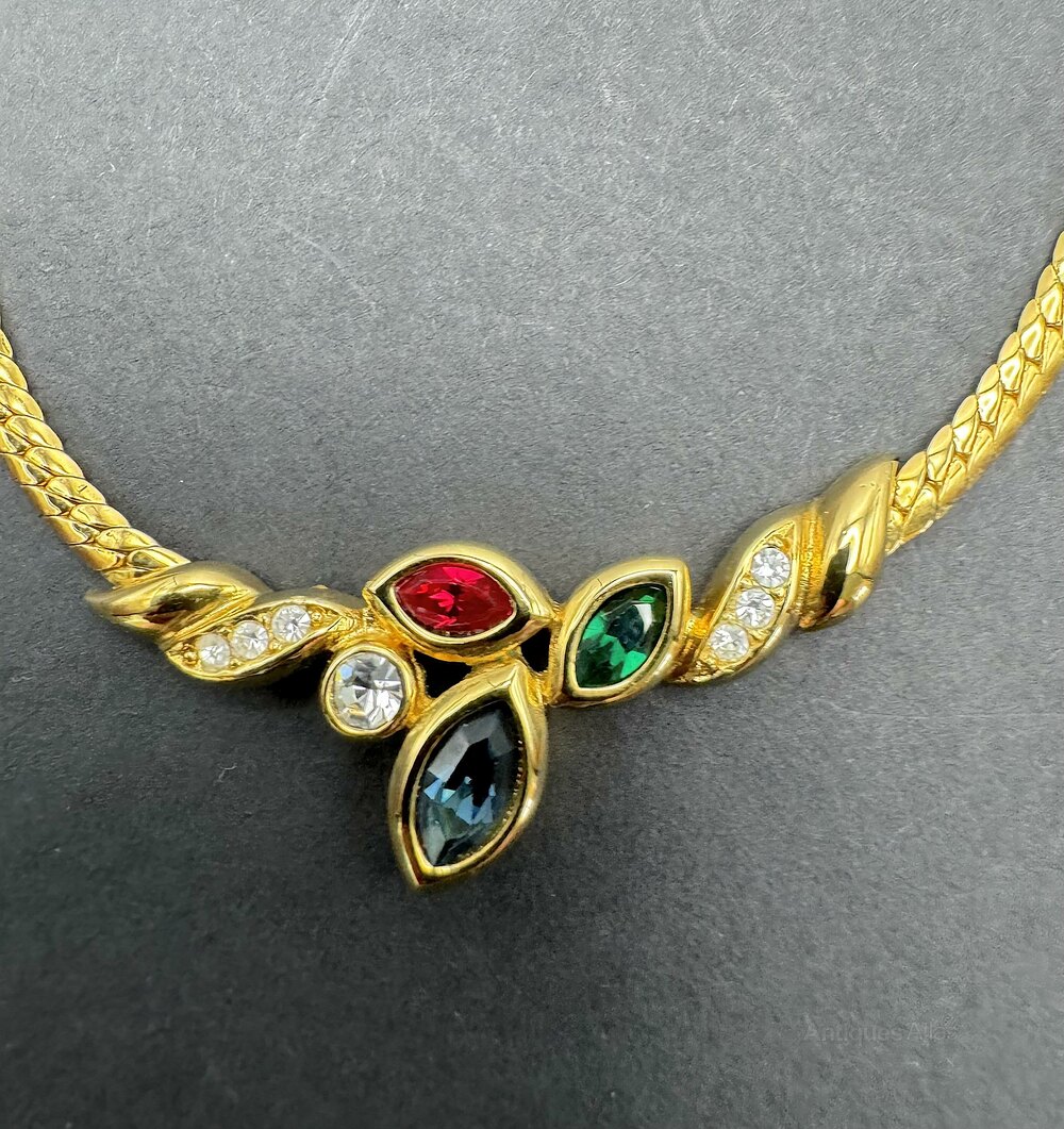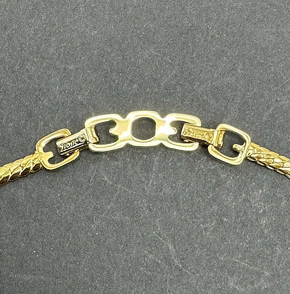 This very striking omega Henkel and Grossé Necklace consists of very attractive snake chain with a central rhinestone and red, green and blue glass gemstone motif. The Necklace is completed by a typical Grossé signed clasp incorporating an a removable chin extender.