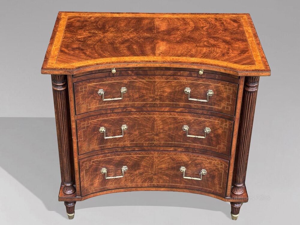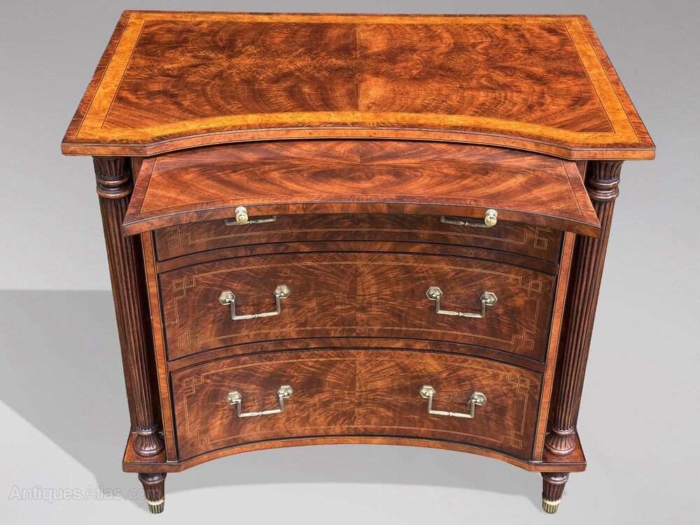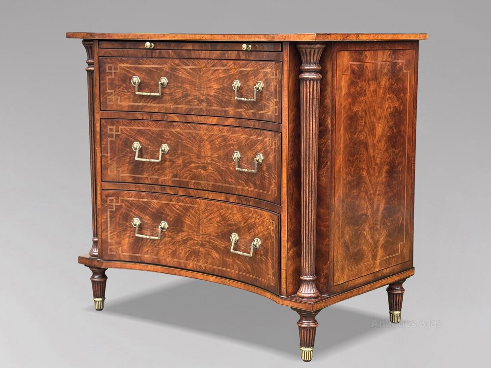 An elegant late 20th century commode by Brights of Nettlebed, a respected family firm renowned for fine English furniture since 1866. This shaped chest combines classic English design with excellent modern cabinetmaking.