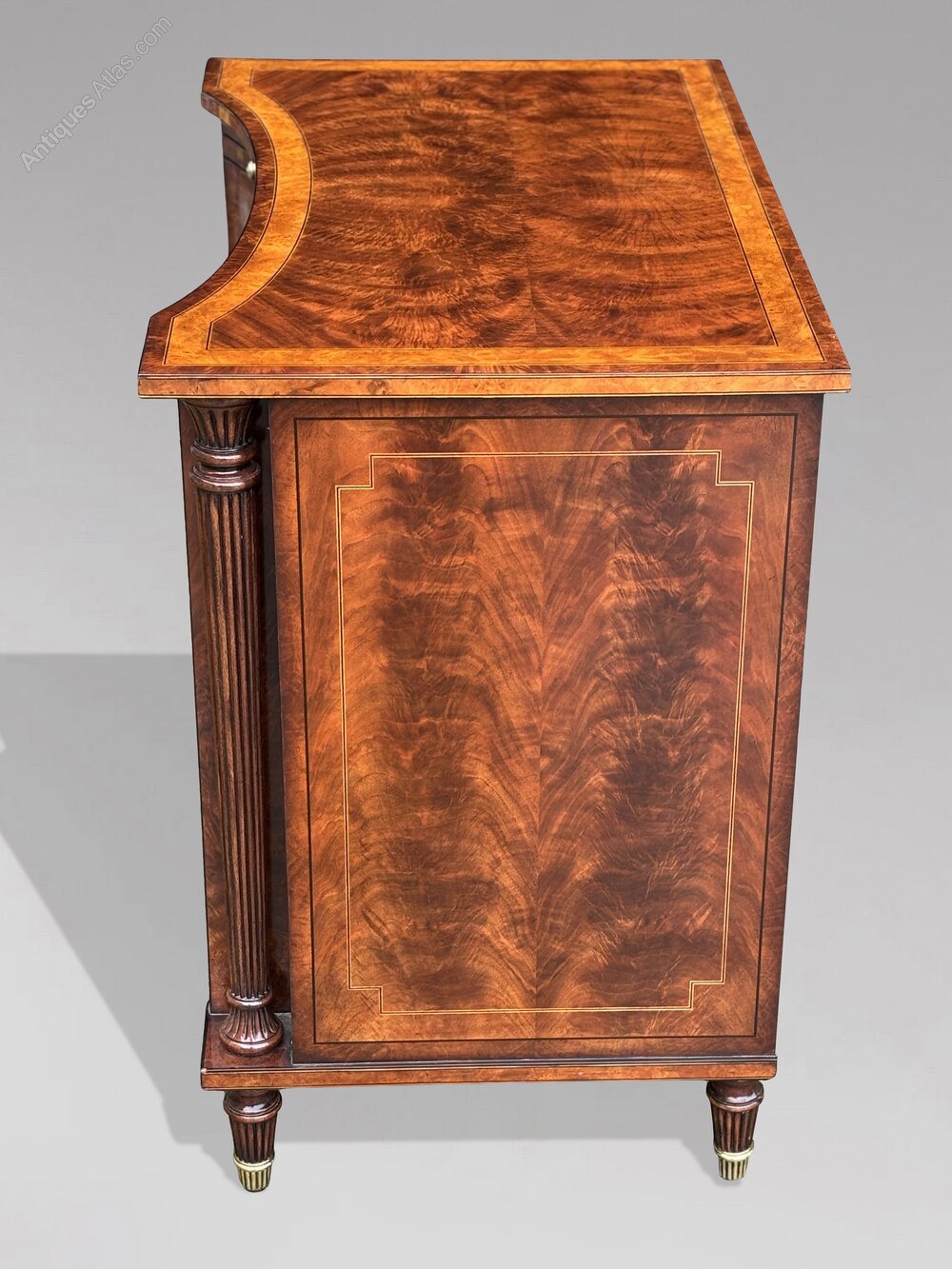Turned, tapering columns flank the drawer fronts, lending structure, symmetry and a pleasing architectural quality. The chest stands on fluted peg feet with brass caps, which add both stability and a refined decorative finish. The careful use of veneers, stringing and banding showcases the crisp, high-quality workmanship throughout.