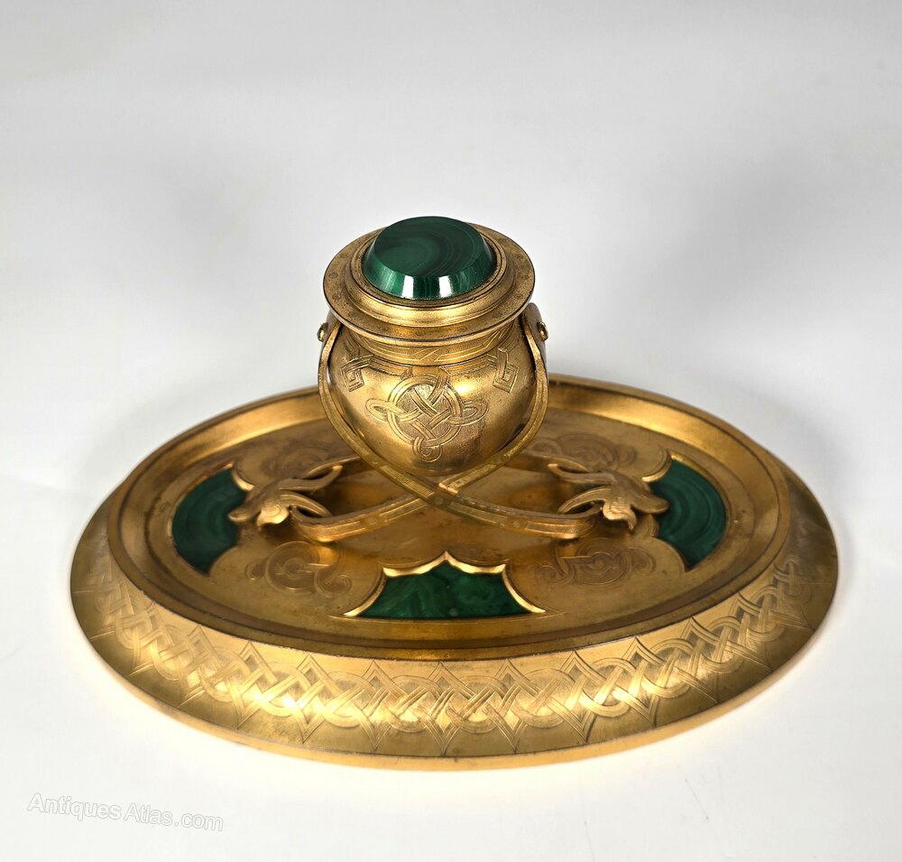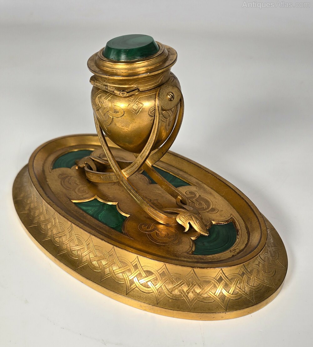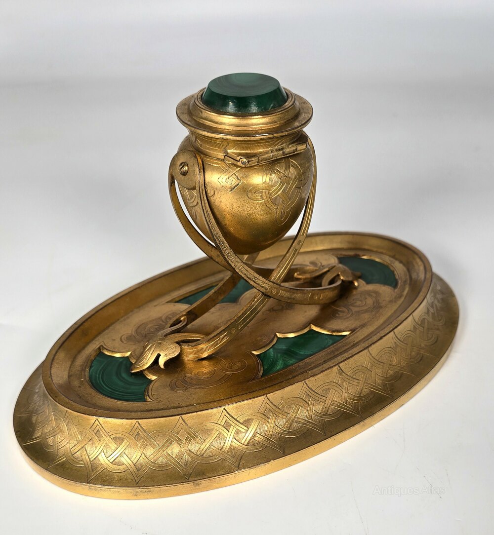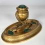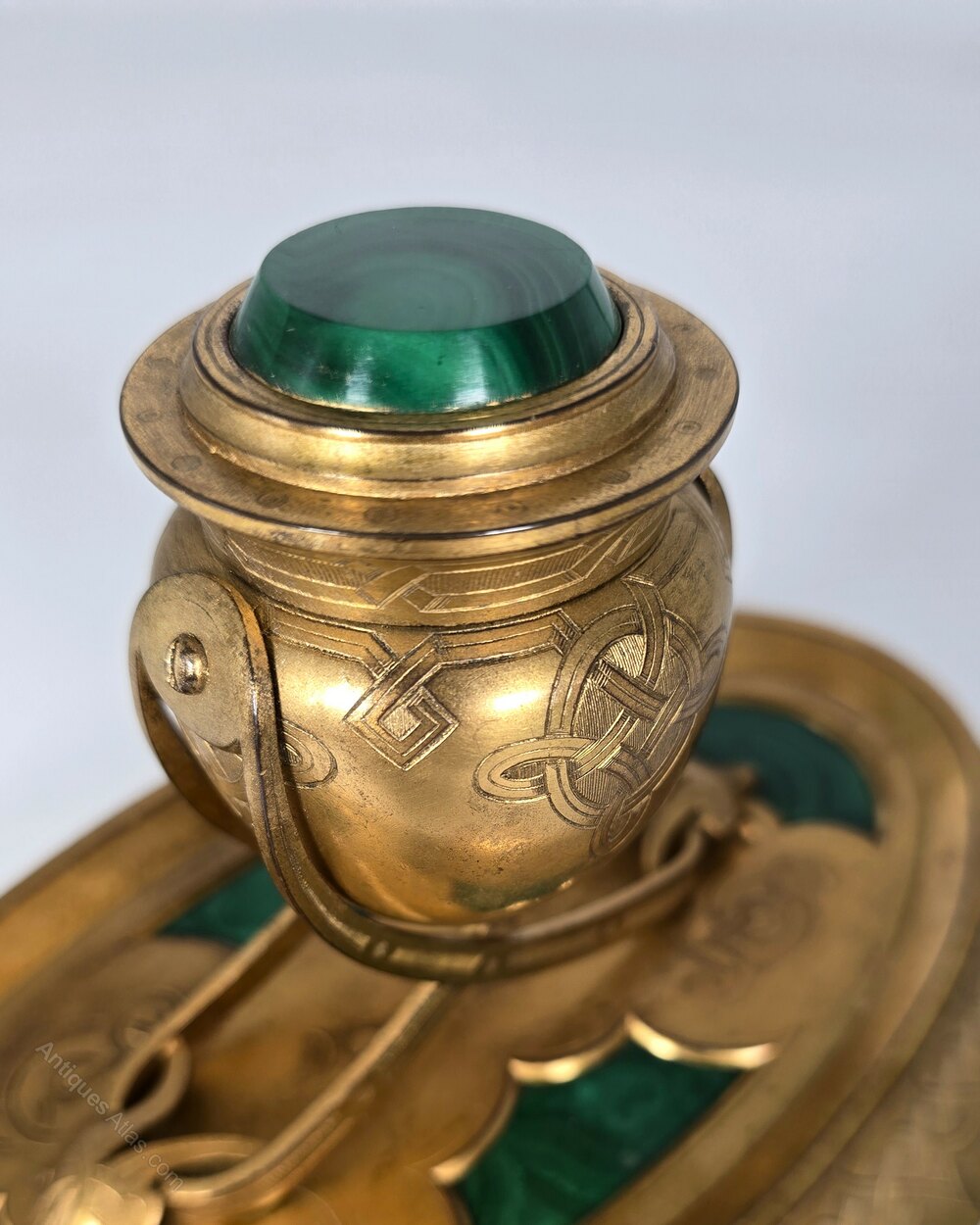 The inkwell has an entwined support with matching engraving. It encloses and holds an elliptical round inkwell which has a flared and shaped rim, which is fitted with a hinged lid, which is also mounted with a bevelled circular polished malachite roundel.