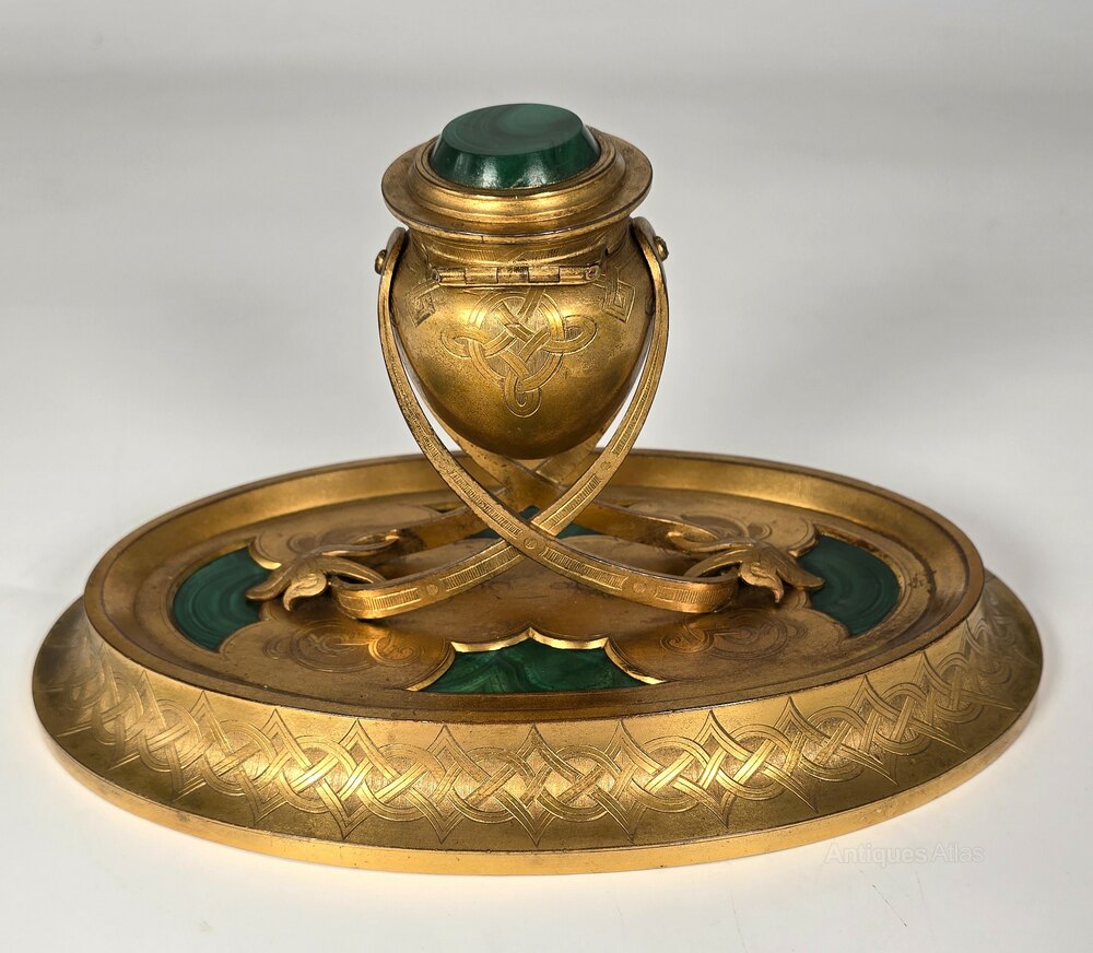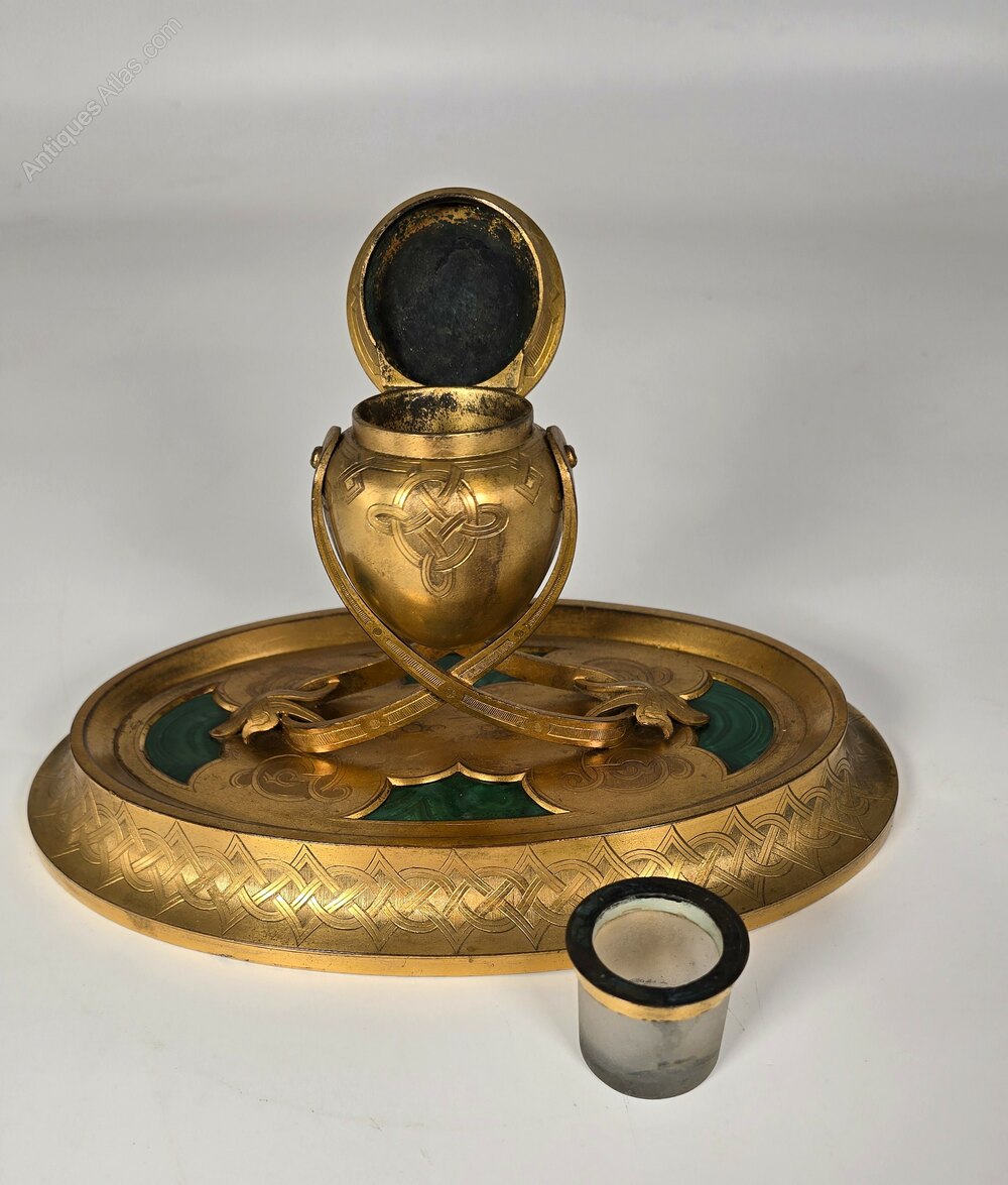The gilt bronze inkwell is also hand engraved with a similar Celtic influenced design.