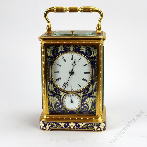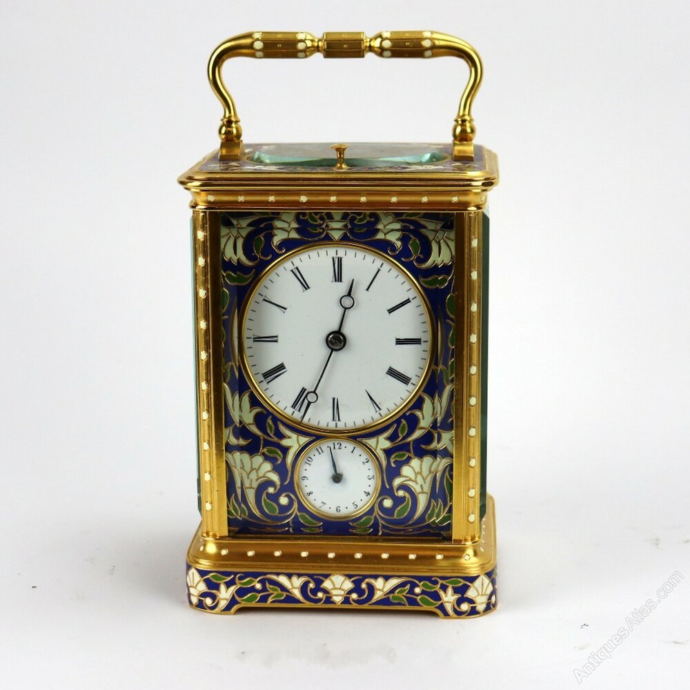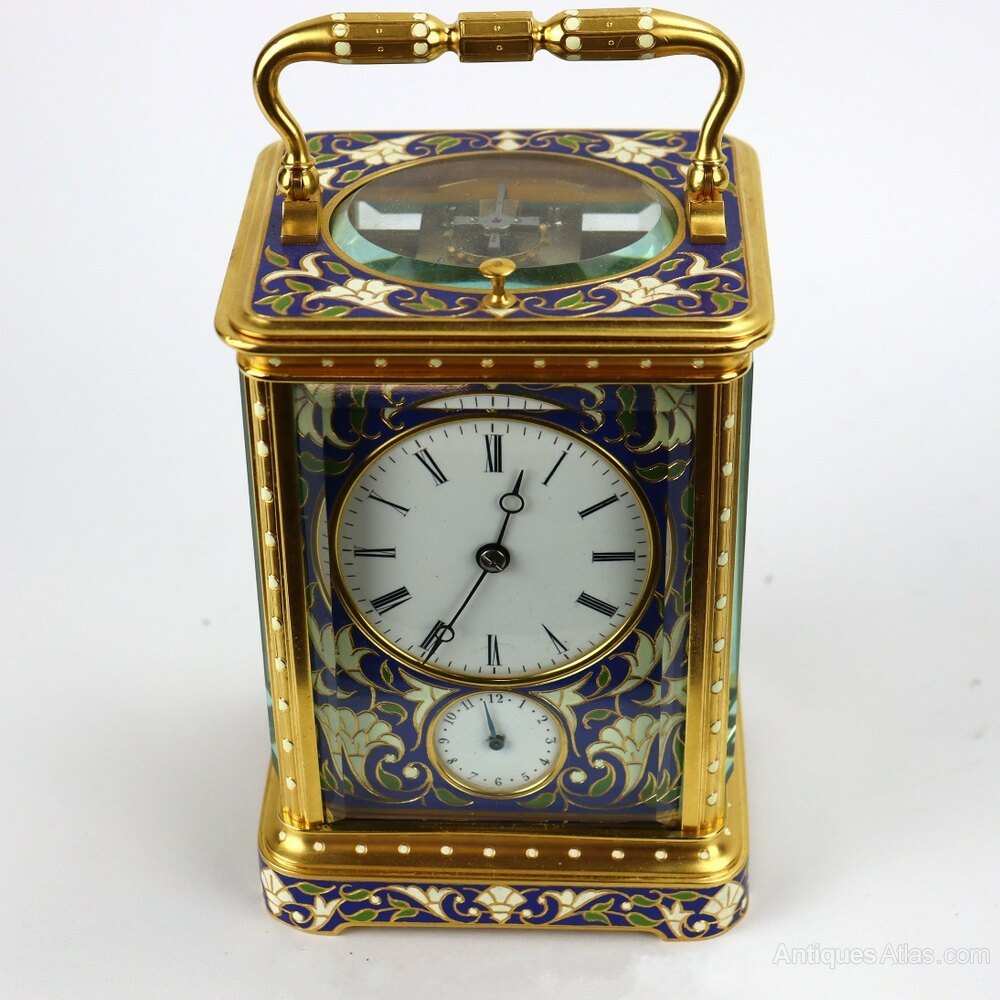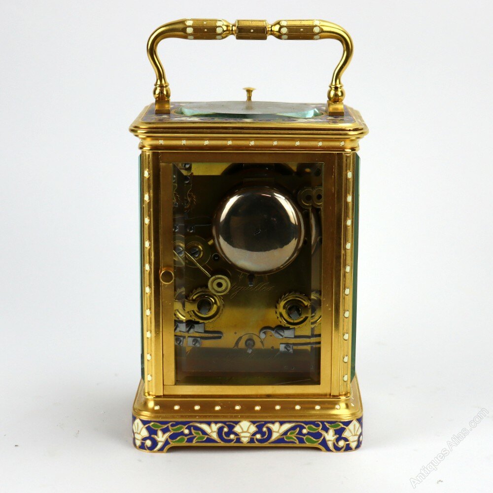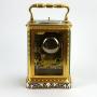 A very fine example of a French polychrome repeating carriage clock with alarm. The gilded case with stunning decorative finish. The 8-day strike, repeat, alarm movement with original silvered lever escapement.