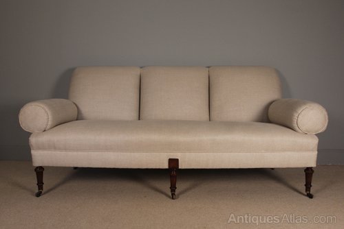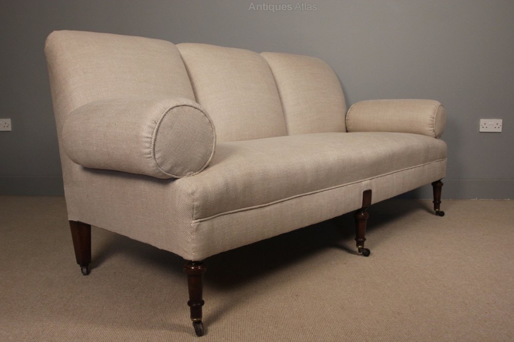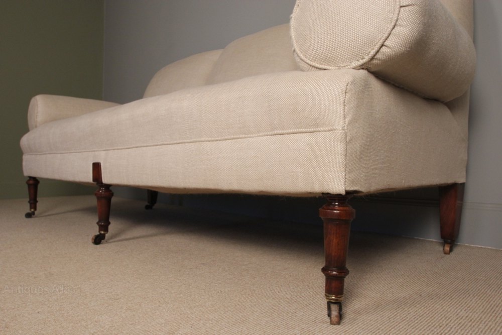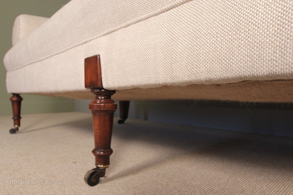 A large French mid 19th century upholstered sofa, having a sprung seat and bolster arms, raised on ring turned Mahogany legs terminating in the original wood and brass cup castors. This sofa has been completely re-furbished in a traditional manor, covered in a high quality natural tween linen fabric.