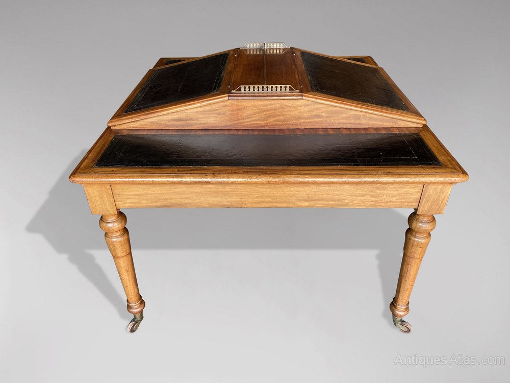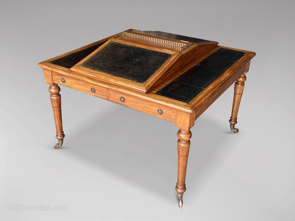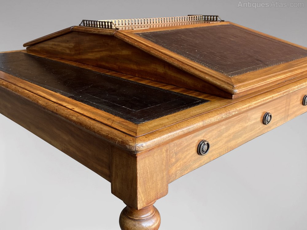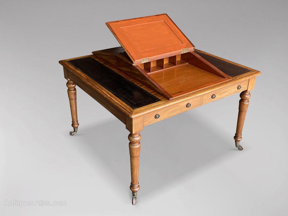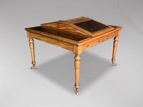 A fine late 19th century, Victorian period mahogany partners writing table with unusual features such as a moulded rectangular top with two rising fall writing slopes in the centre topped by a brass galleried top, above two faux drawers on either side. The pair of slanted black leather writing surfaces opens to reveal a fitted interior, flat surfaces to each side also with a black tooled leather insert. Raised on 4 slender turned legs terminating in brass cup porcelain castors. England circa 1880. Very unusual, good quality with an original warm patina. The table top height is 75cm.