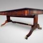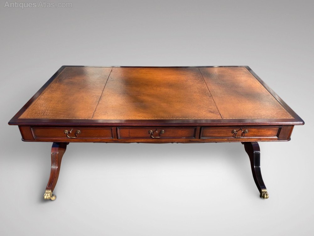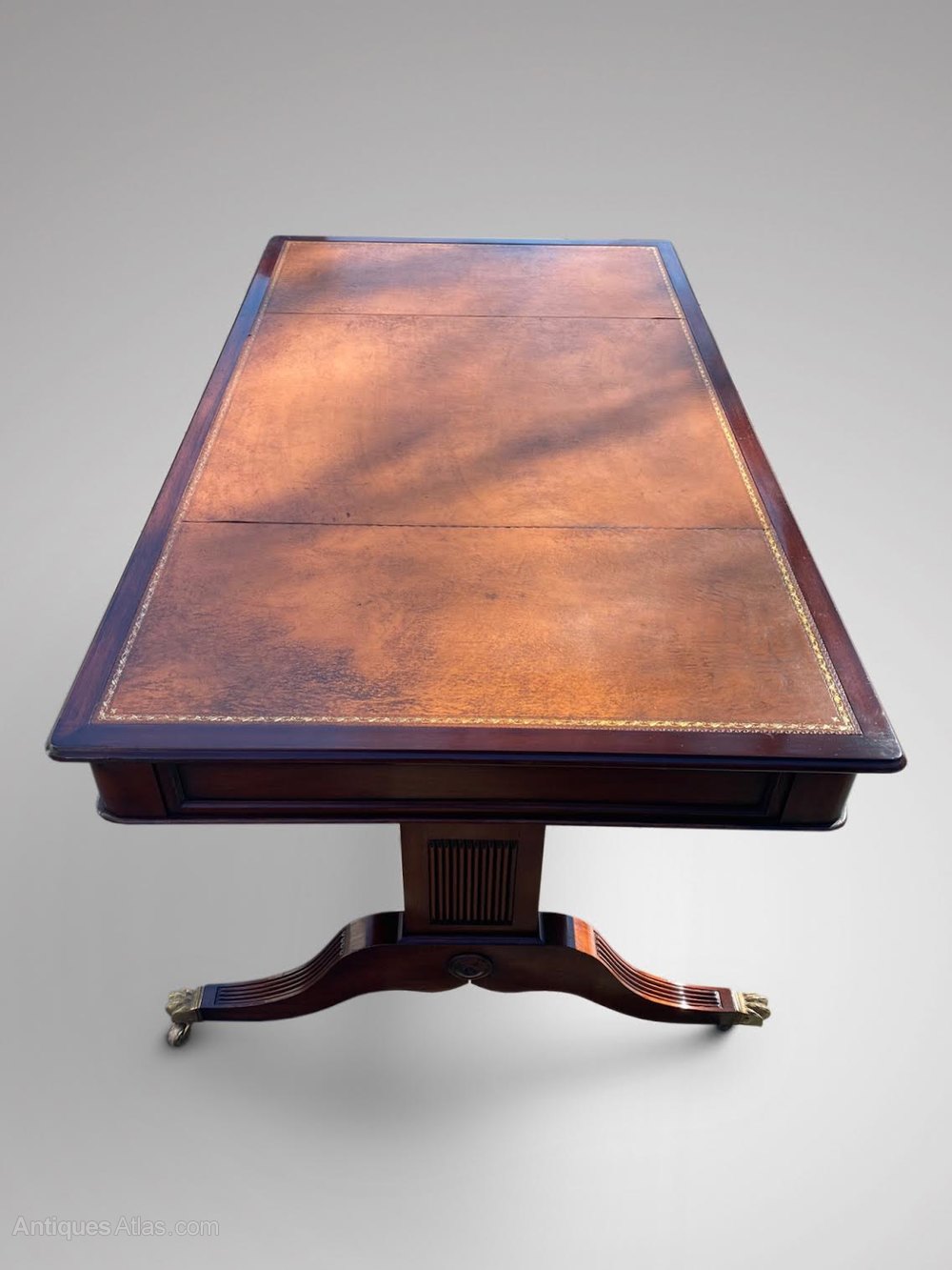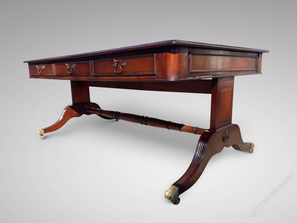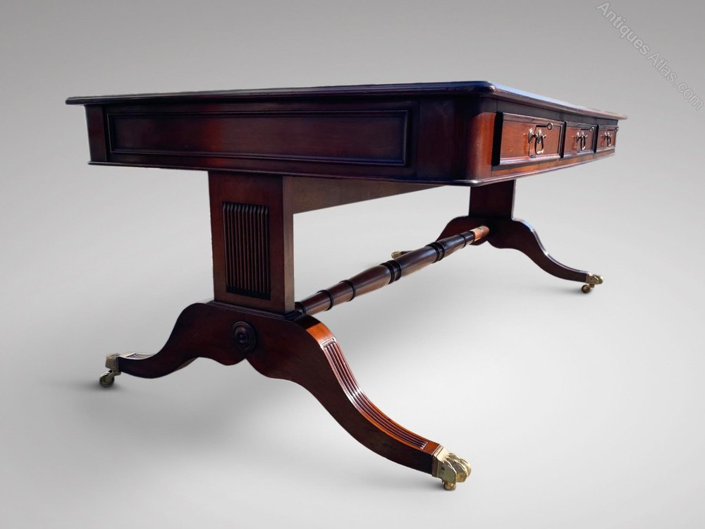 A good quality late 19th century, mahogany partners writing table. The rounded moulded rectangular top with light brown tooled leather inset above six drawers with brass handles, the end supports standing on reeded sabre legs with brass caps and castors. England circa 1890.