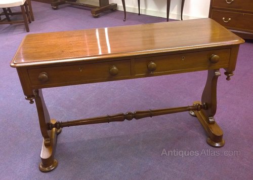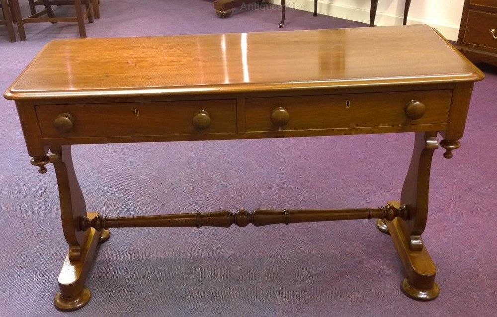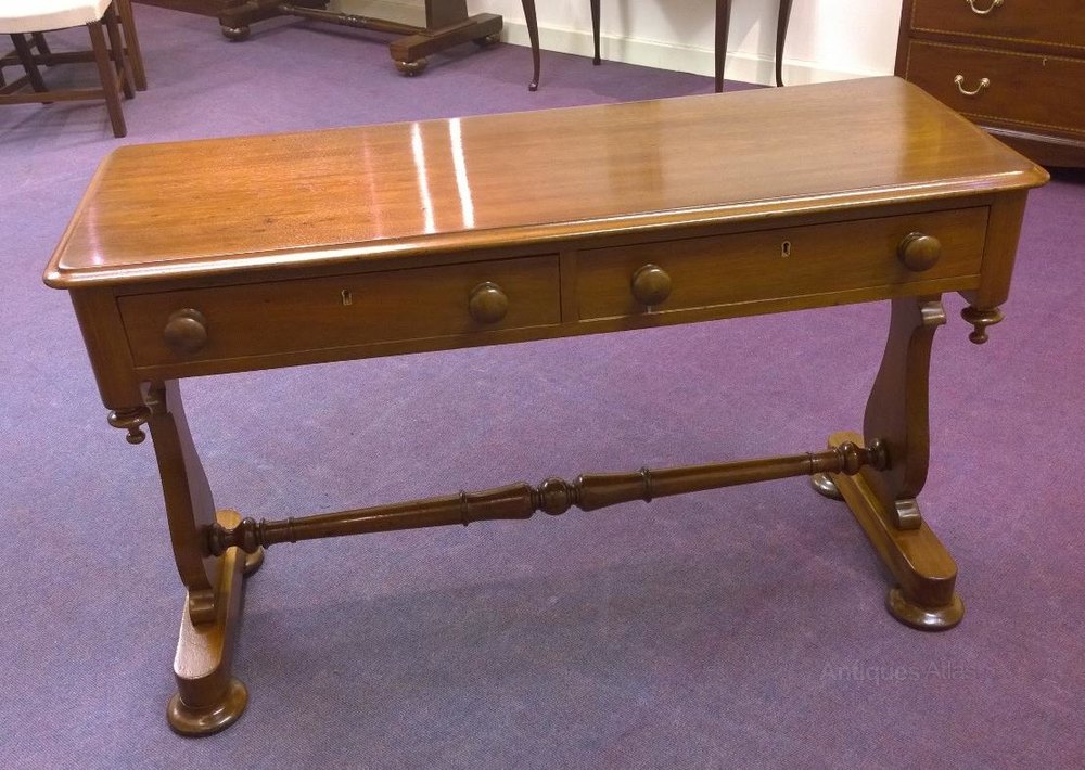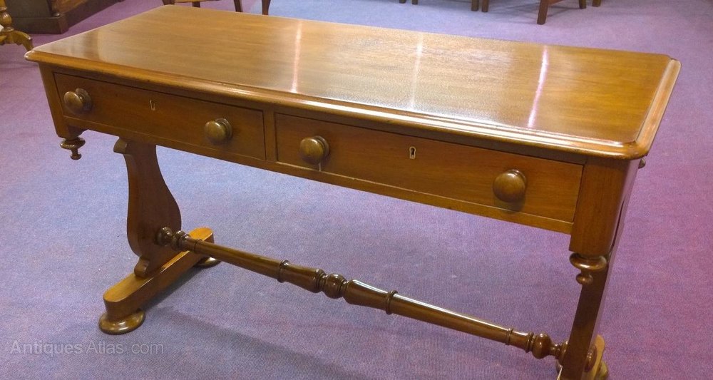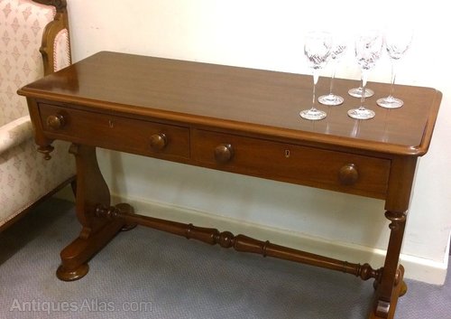This lovely rounded corner stretcher table is suitable for so many uses in a modern home. It will make a great desk or server. Superb for putting on your make up in the bedroom as a dressing table, we have a miror or two that would easily go with this.......... This mahogany table would also make a good console as it is a little narrower than many. In very tidy condition it looks good with the turned stretcher and shaped end. Useful pair of drawers in the front with the nicely turned wooden knobs.