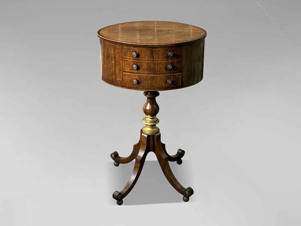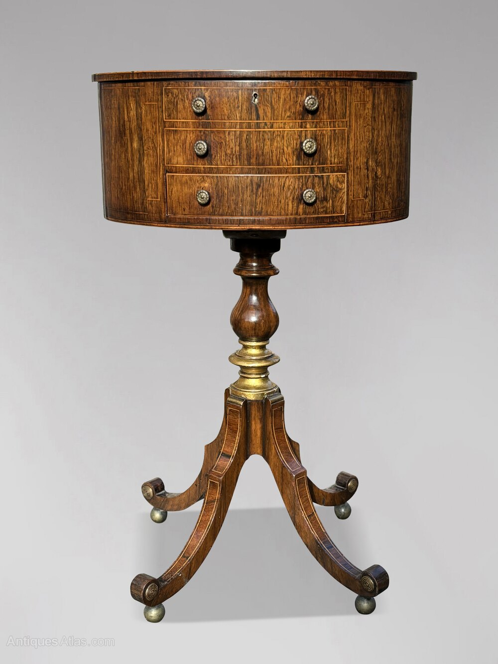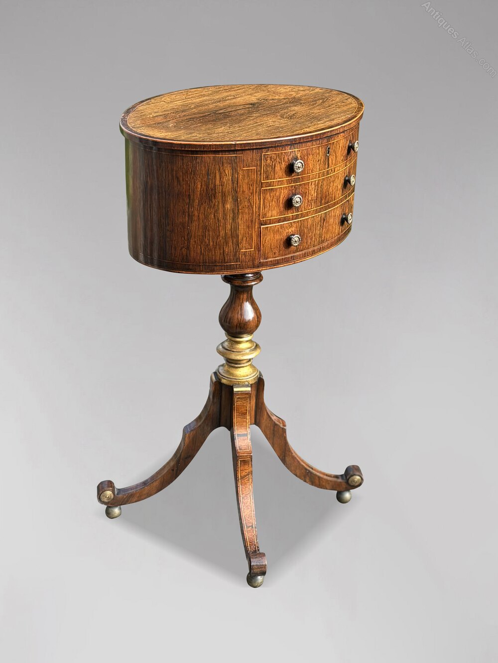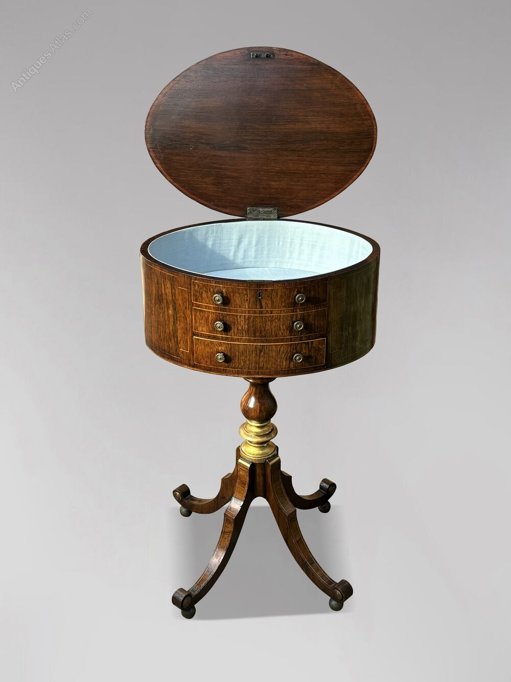 This exquisite occasional table from the early 19th century Regency Period showcases the elegance and craftsmanship characteristic of its time. It features a beautifully designed oval revolving top, cross-banded in rosewood, which is complemented by two dummy drawers and one working drawer adorned with turned brass handles. Lifting the top reveals a luxurious light blue silk cotton compartment, making it both functional and stylish.