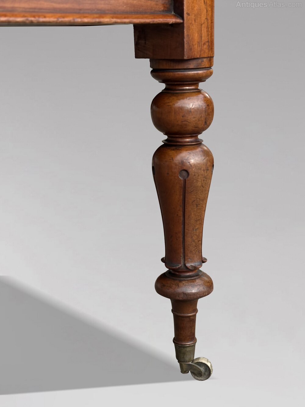 The table’s moulded rectangular top, with gently rounded corners, rests on elegantly turned legs, each terminating in large original brass castors. This attention to detail is typical of the late Regency/early Victorian period.
