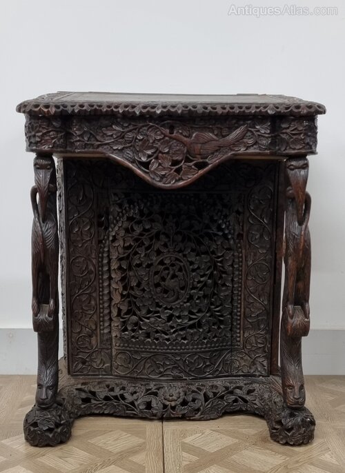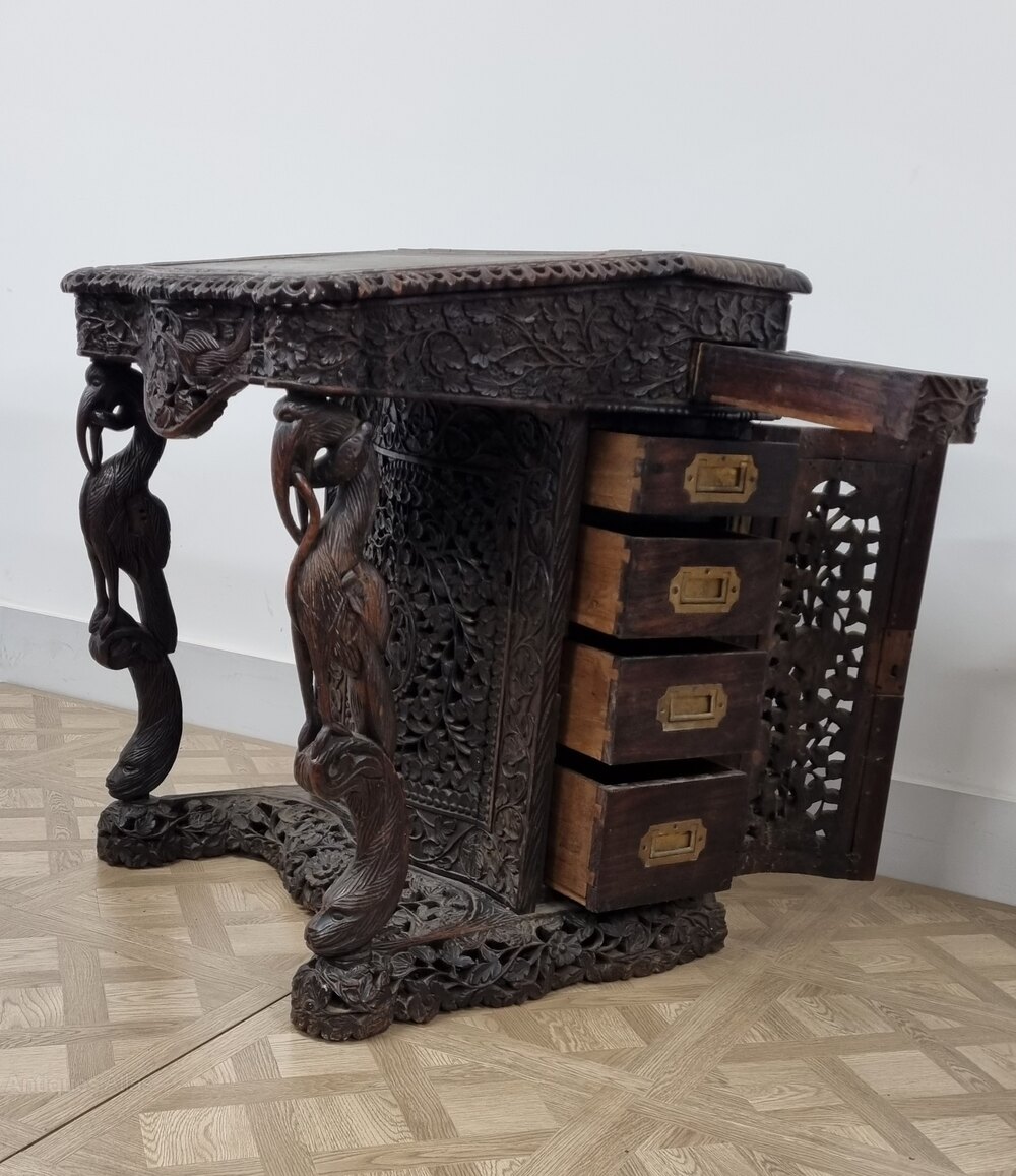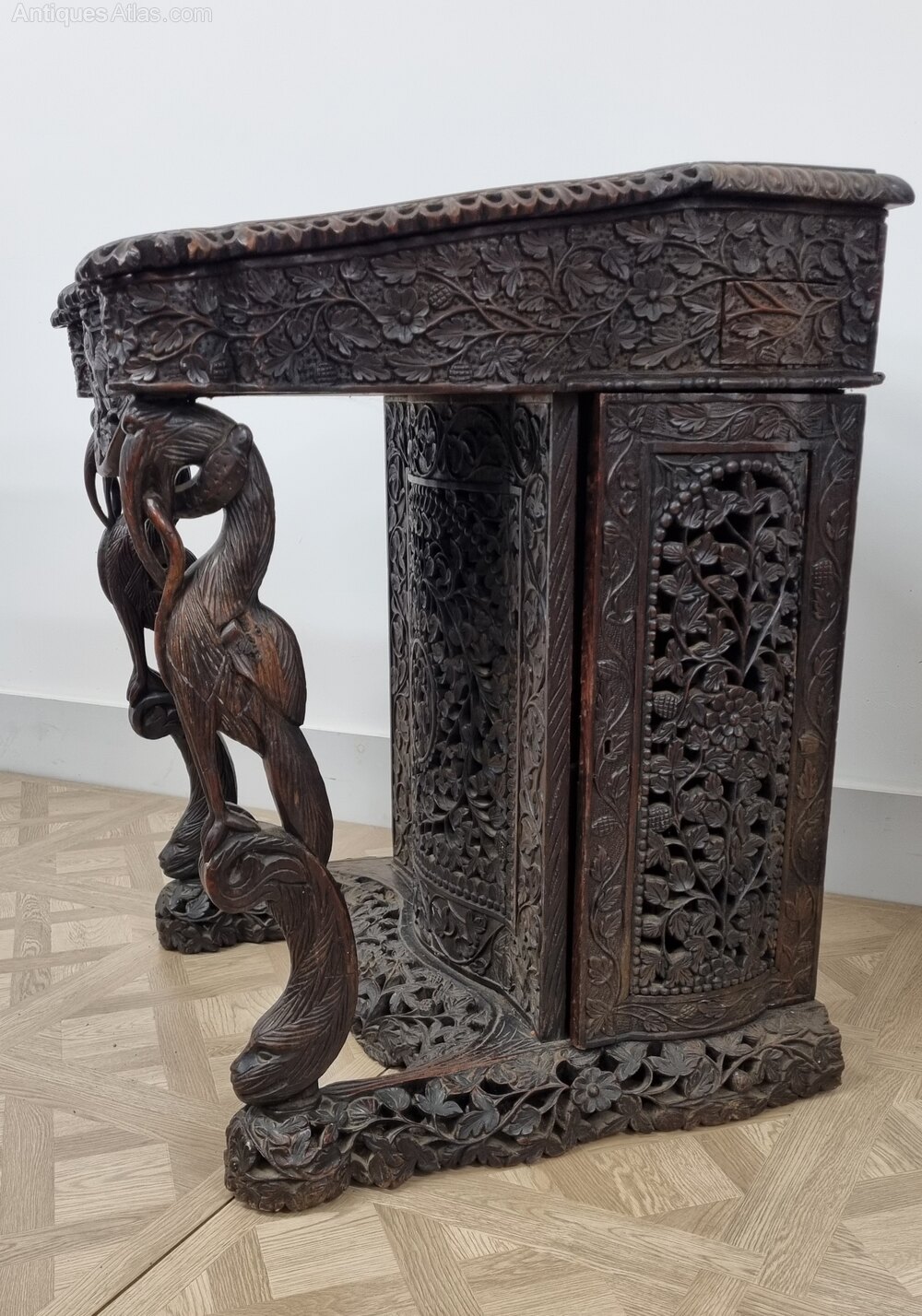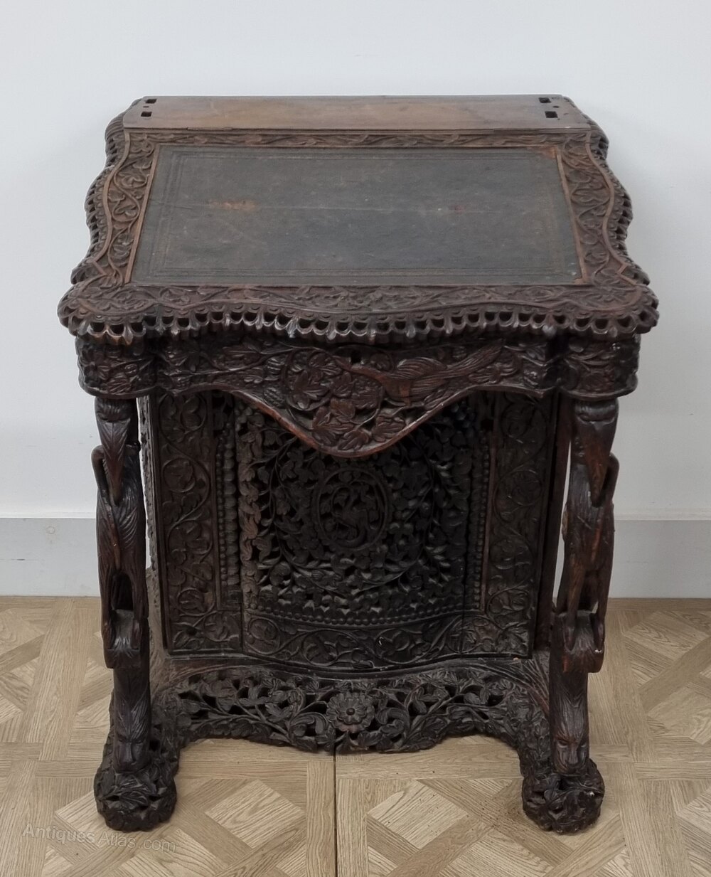 An exceptional 19th-century Anglo-Indian desk masterfully hand-carved from rich hardwood, featuring intricate floral and avian motifs throughout. The craftsmanship displays remarkable depth and detail, with stylized birds forming the supports and an elaborate pierced foliate design across the front and sides. The desk’s top is leather-covered, adding a refined contrast to the dark wood, and it cleverly conceals multiple drawers and hidden compartments—hallmarks of fine 19th-century cabinetry. Though it shows minor damage and a few missing elements consistent with age, the piece remains solid, stable, and highly presentable. It can be appreciated and used as is, or it would make an exceptional candidate for light restoration to return it to its full original glory.