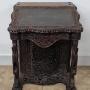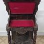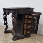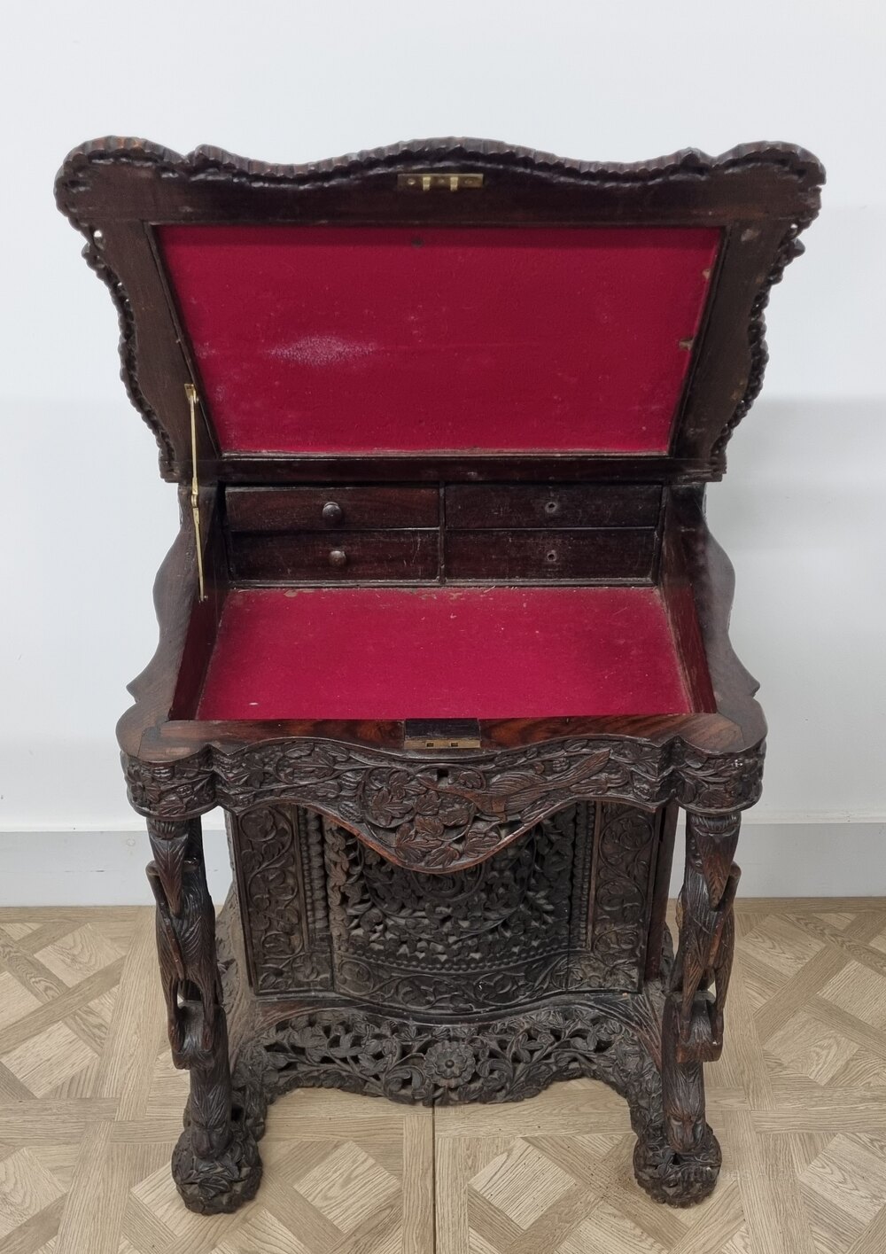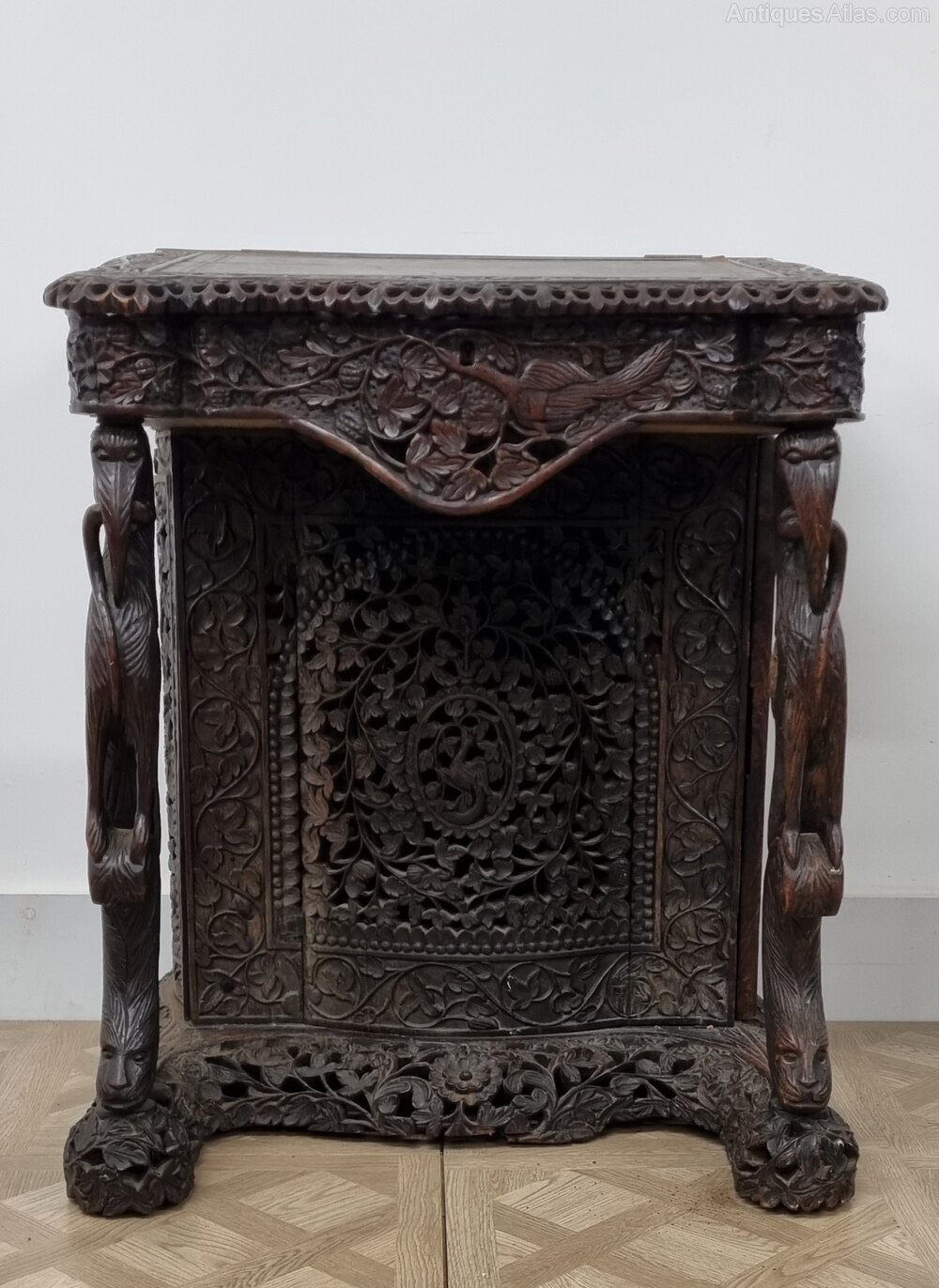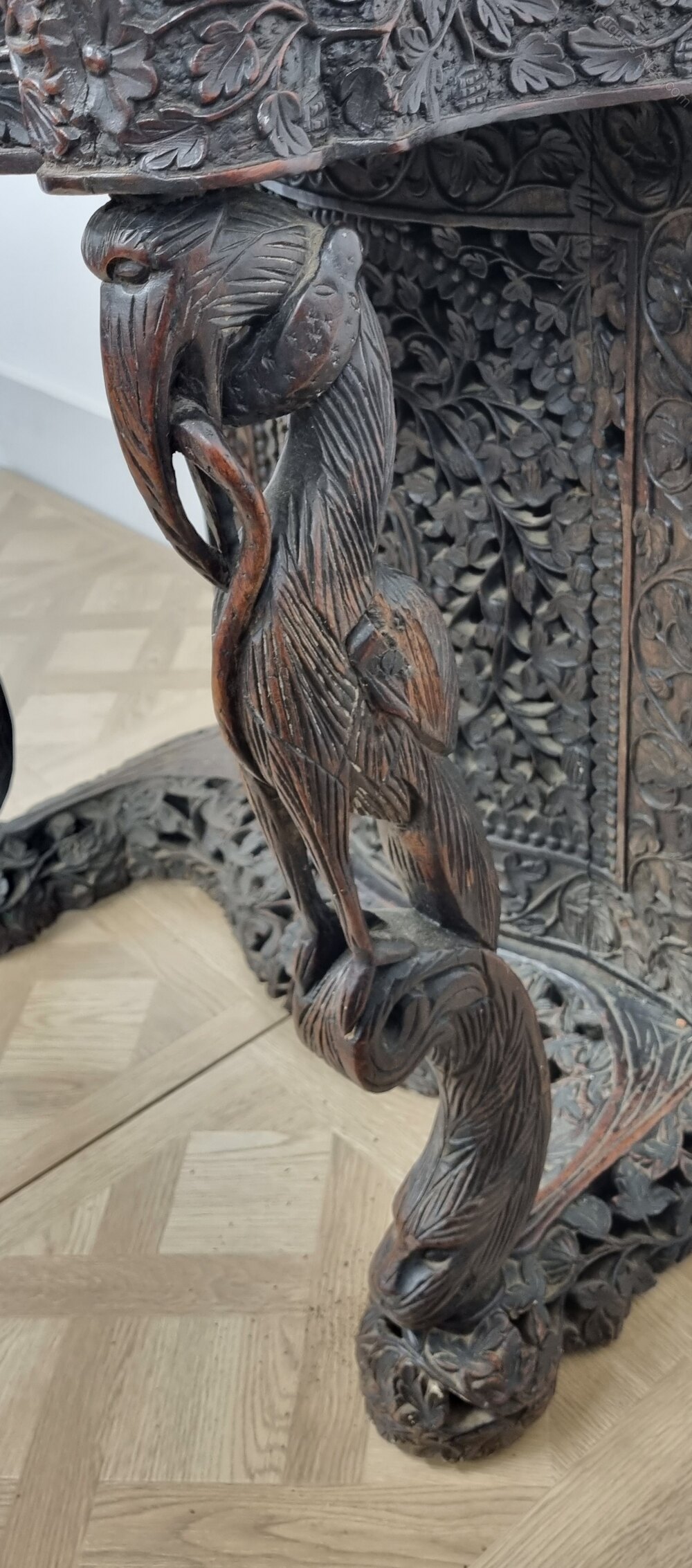 An exceptional 19th-century Anglo-Indian desk masterfully hand-carved from rich hardwood, featuring intricate floral and avian motifs throughout. The craftsmanship displays remarkable depth and detail, with stylized birds forming the supports and an elaborate pierced foliate design across the front and sides. The desk’s top is leather-covered, adding a refined contrast to the dark wood, and it cleverly conceals multiple drawers and hidden compartments—hallmarks of fine 19th-century cabinetry. Though it shows minor damage and a few missing elements consistent with age, the piece remains solid, stable, and highly presentable. It can be appreciated and used as is, or it would make an exceptional candidate for light restoration to return it to its full original glory.