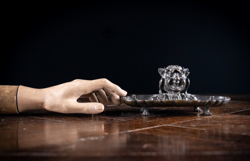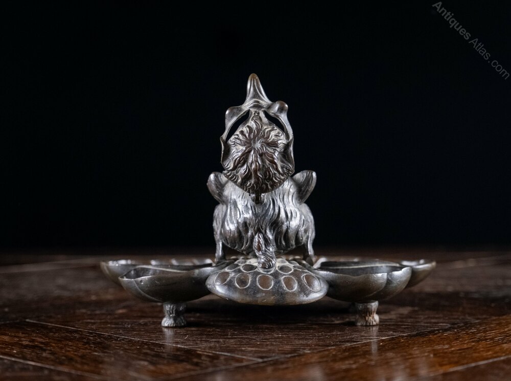 The devil is perched upon the back the bronze pen rest, with its hollow ears functioning as pen holders. The devil is concealed from above by a bird mask lid which reveals the devil beneath when lifted. Although the devil will be apparent to whomever opens the lid, he is then cleverly disguised as a bird when viewed from the back, with the devil's hind legs becoming the bird's feet and its ears the wings. The whole is sat upon four thick bronze paw feet.