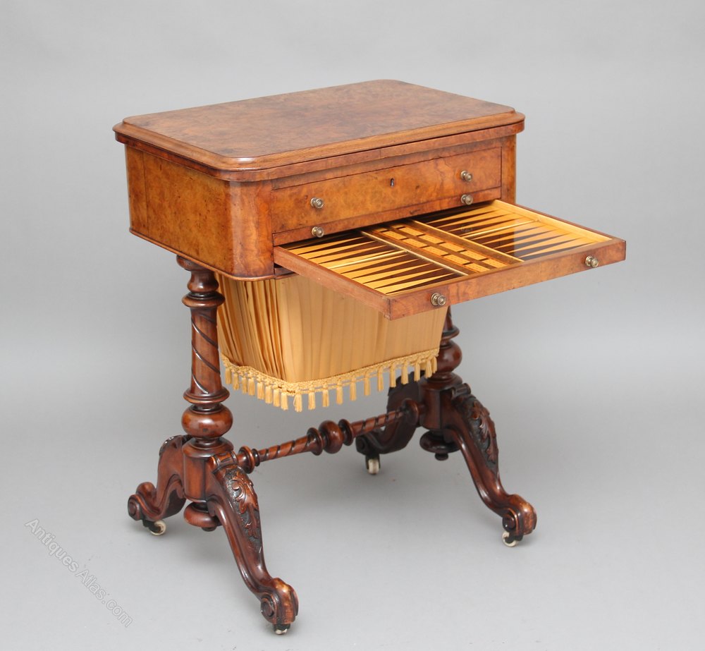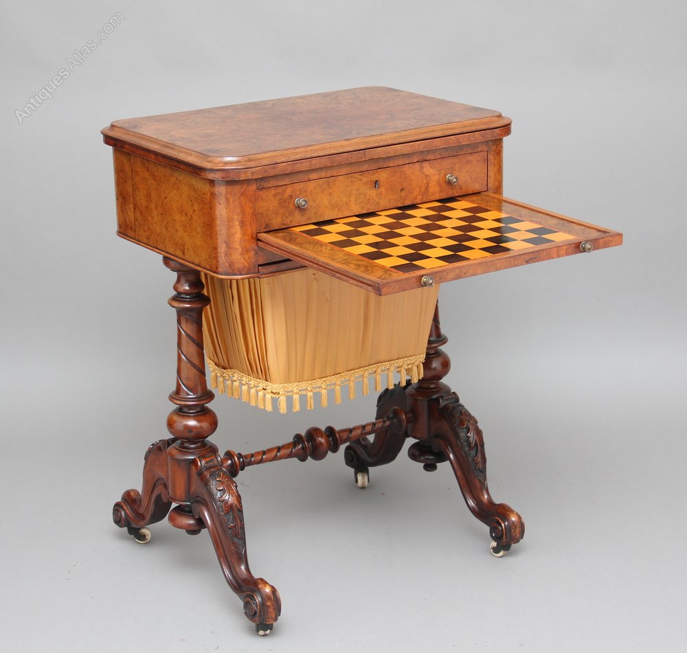 19th Century burr walnut games / work table, the burr walnut moulded edge top folding over to reveal a green baize playing area, with a drawer below and two pull out slides, one slide that pulls out which has a draught and chess board and the other a backgammon board, below these you have a work basket, supported on two turned and carved columns united by a turned and carved stretcher, the columns end with carved cabriole legs with white china castors. A lovely quality and practical piece of Victorian furniture. Circa 1860.
