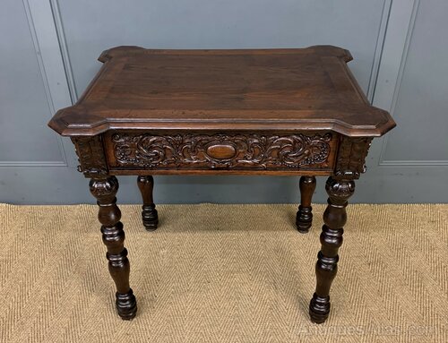 A charming 19th century carved oak lamp, or occasional table. Very well constructed and decorated with crisply carved detailing to all for sides. The lobed shaped top is cross banded. With a single drawer to the freeze and standing on turned legs. Sympathetically refinished in our workshops and now offered for sale in excellent condition with a great colour and patina, ready to go straight into the home.