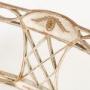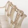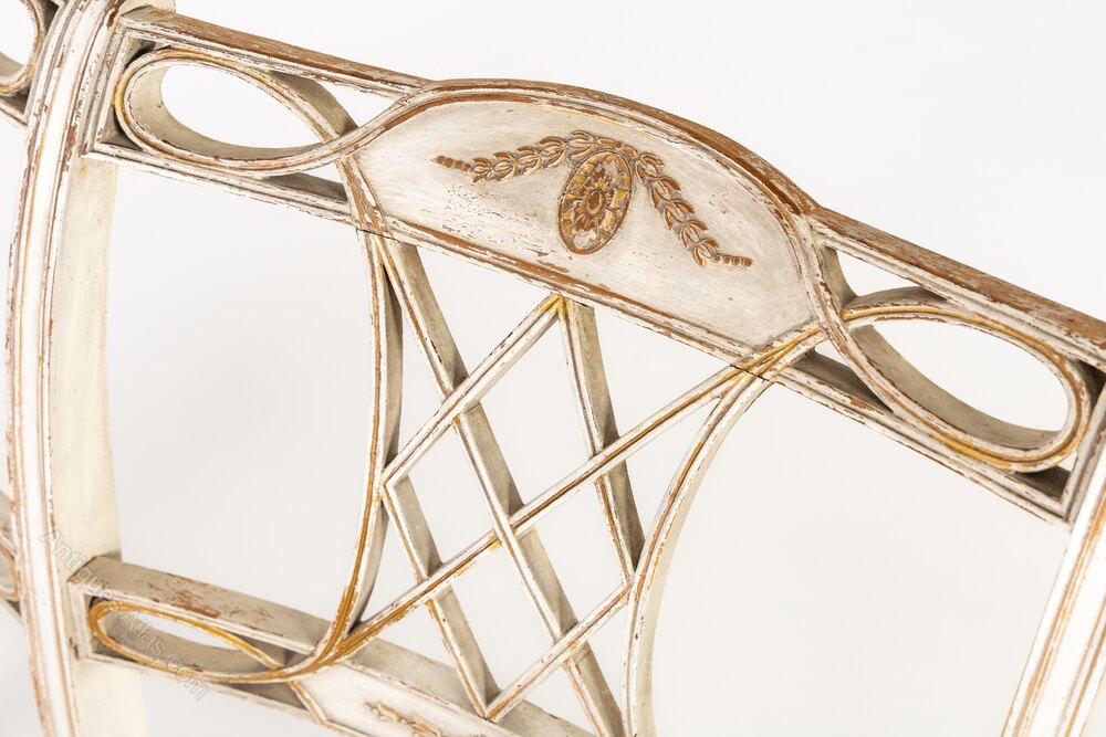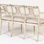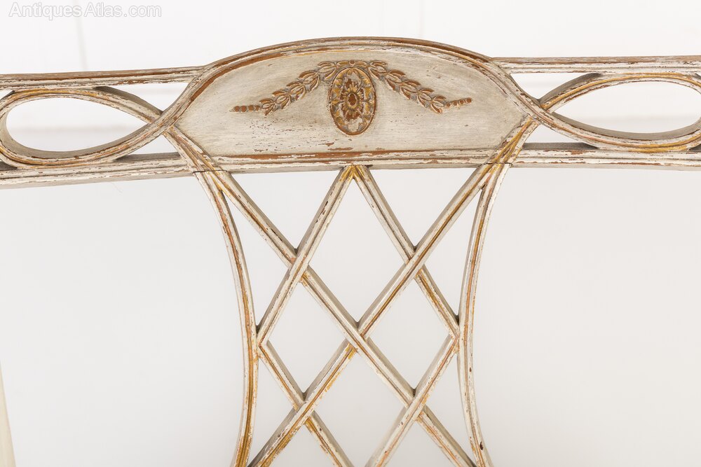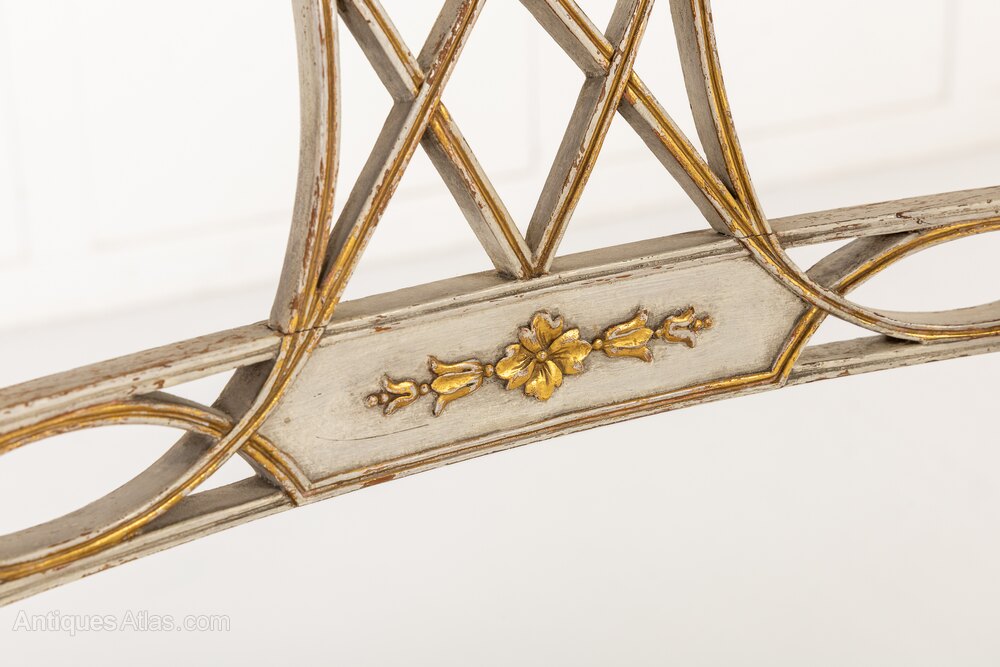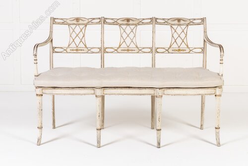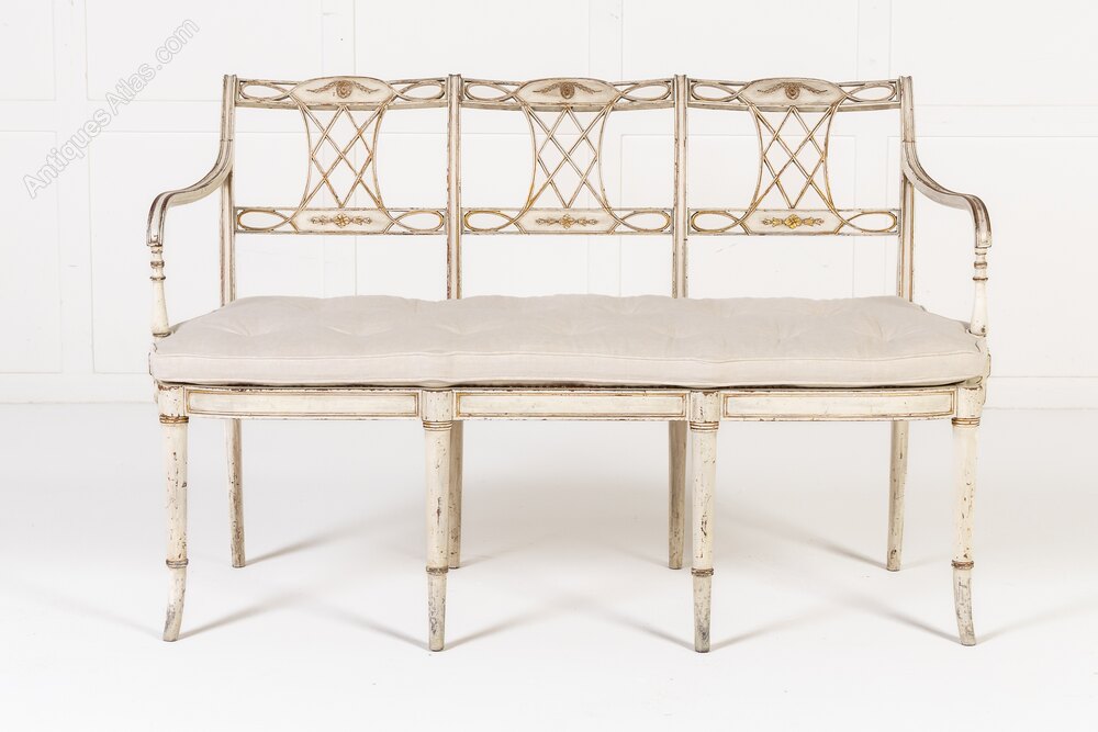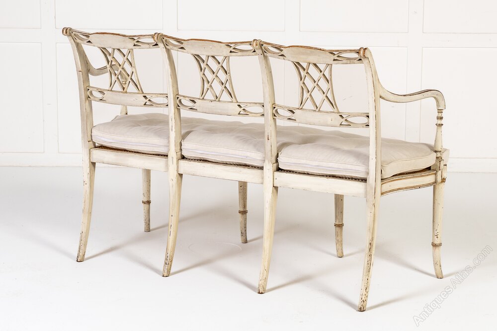 This elegant settee embodies the English Regency style, which was highly influenced by Neoclassicism and ancient Greek and Roman motifs. The frame is constructed of wood (likely beechwood) and features an off-white or cream painted finish, accented with refined gilt decoration. This combination was a hallmark of the period. It has a distinct open backrest composed of three vertical sections. Each section showcases a delicate, geometric crossed trellis pattern below an ornate central cartouche motif. The settee is a three-seater bench with gently outswept arms. It stands on slender, turned, and tapering legs. It has a single, thick loose seat cushion.