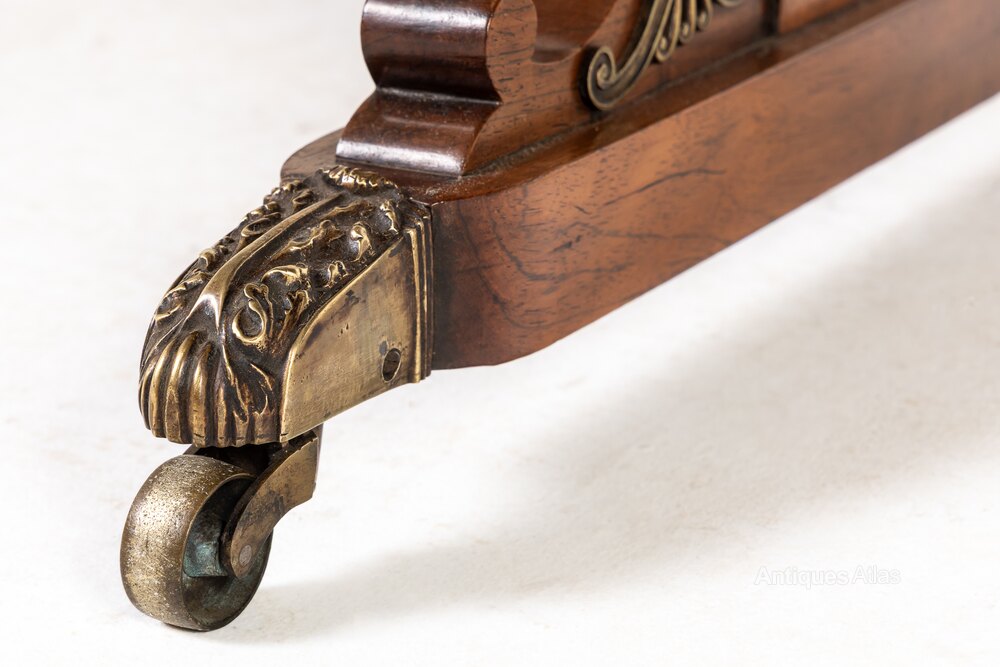 This sofa table has an impressive, finely figured bookmatched top set above a frieze with two drawers and brass drawer pulls, and the usual side flaps. Beneath the drawers is a gilt brass and ebonised strip. The two plain end supports terminate in brass mounted platform feet with brass castors. The turned stretcher on the table is ebonised.