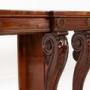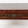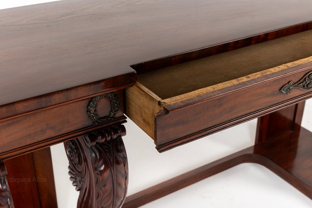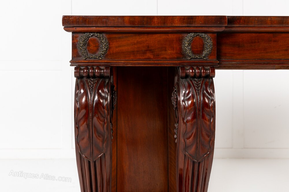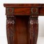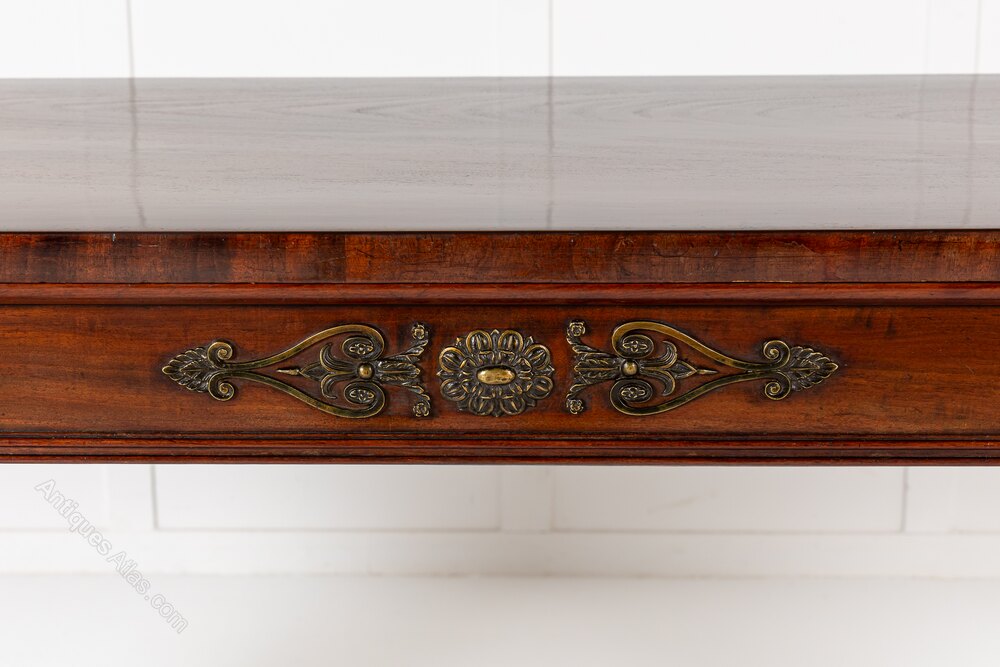 This table is of high regency form. It has an inverted breakfront outline, the two ends set forward from the centre. At the front are four cabriole legs with reeded detailing and lotus flower-type carving above beautifully executed paw feet. The frieze of the table is embellished with very fine quality ormolu mounts, consisting of four laurel wreaths, representing victory, and a longer central mount with anthemions and floral detailing. In the centre of the frieze is a concealed drawer.