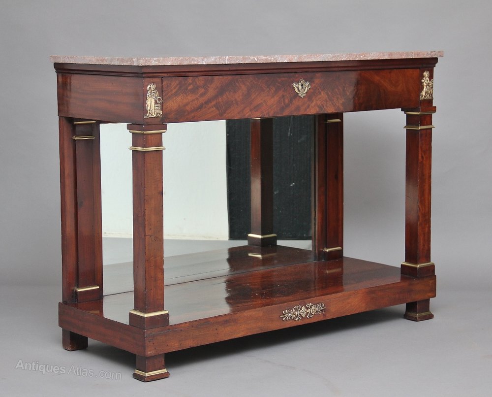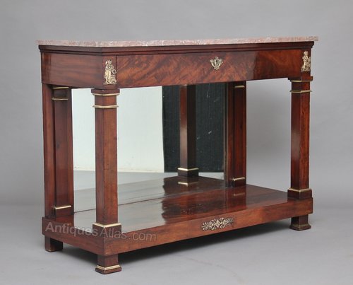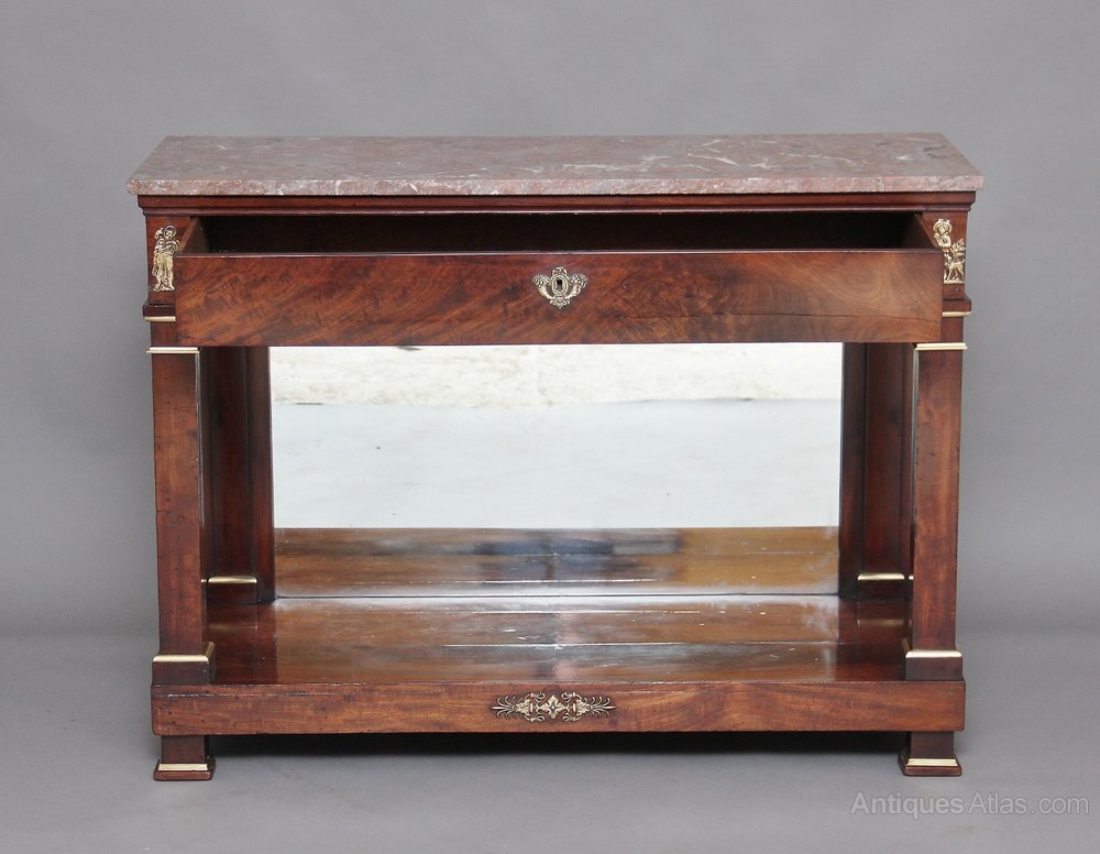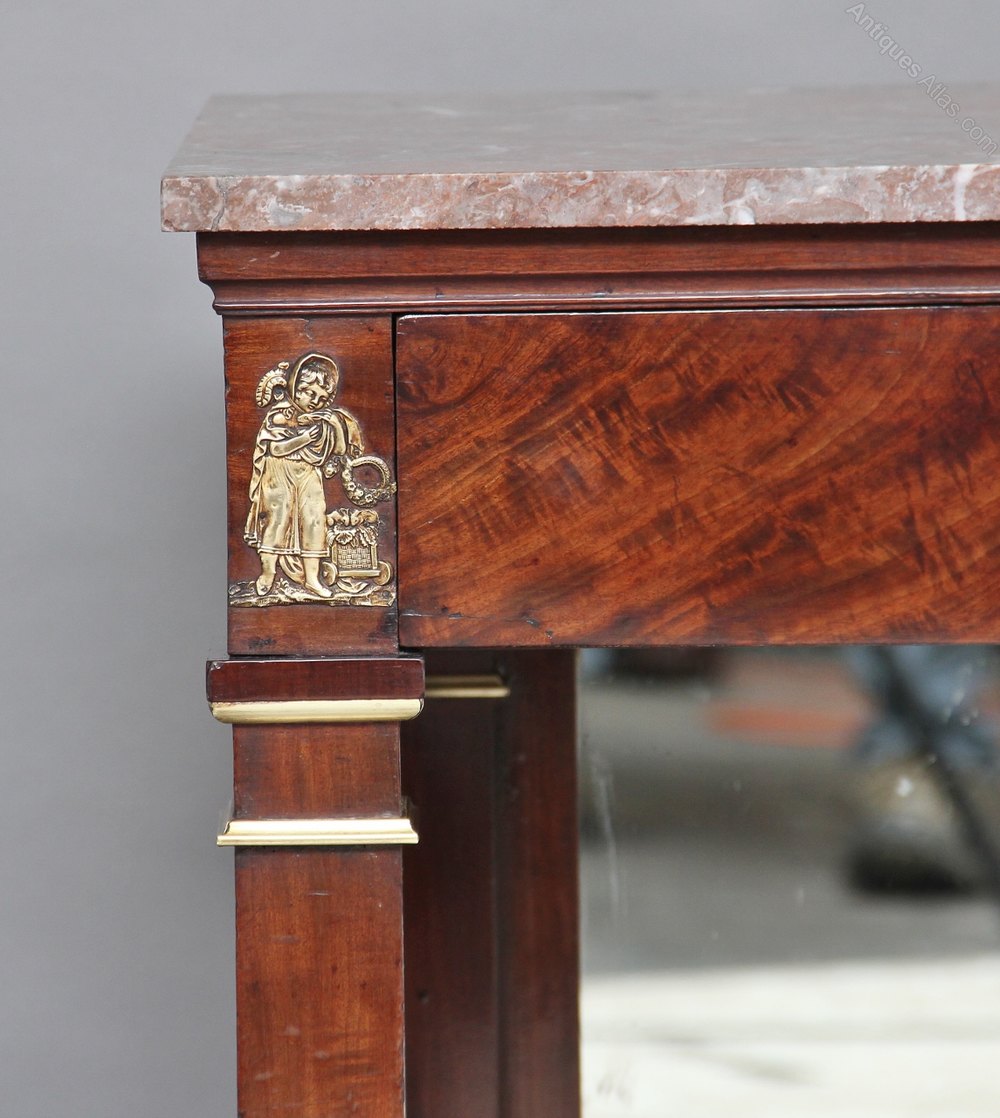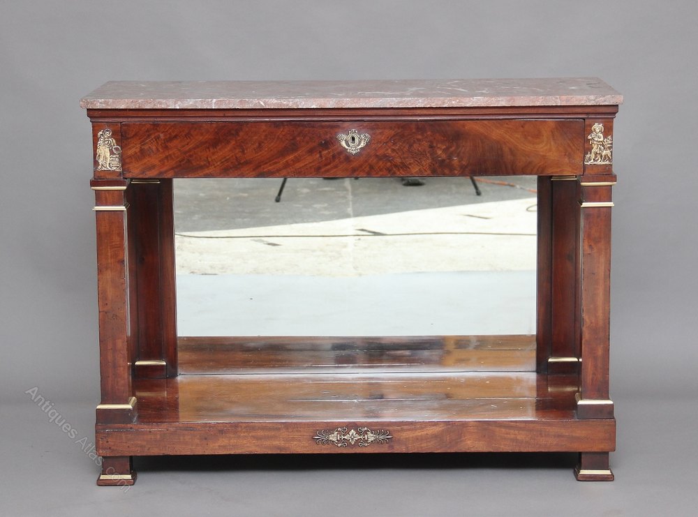 Early 19th Century French empire mahogany console table with a grey and pink variegated marble top, decorated with brass mouldings on the columns, with a single oak lined drawer underneath the top and a mirror at the back between the drawer and the shelf, standing on block feet again decorated with brass mouldings, the front of the consul having lovely quality brass mounts.