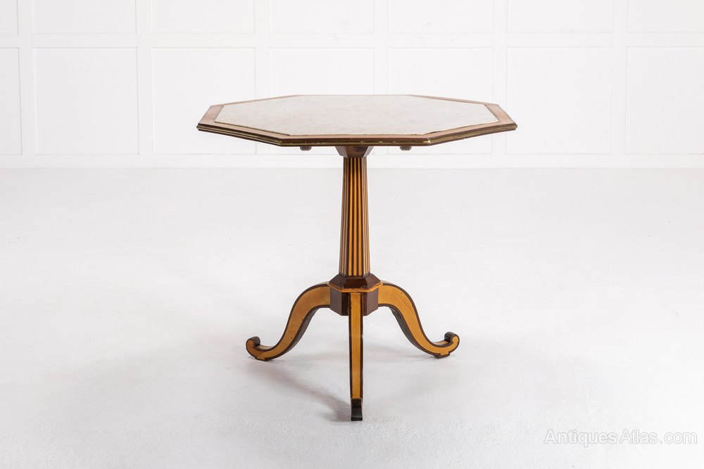 Very stylish design French satinwood and mahogany marble top table with brass edging.