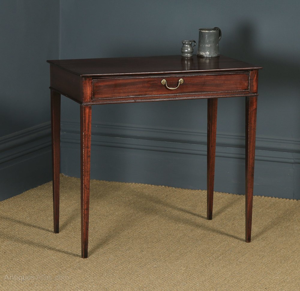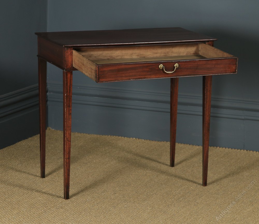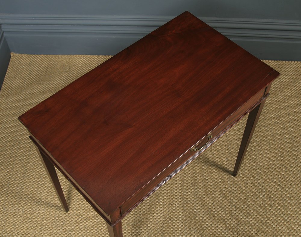 Condition This table is in excellent original condition, considering its age. The table has been French polished by hand to a professional standard in our workshop. Nominal old use marks to the leading edges, but nothing significant considering the age of the item (see photos). The drawer is in good working order and closes flush to the frame. The drawer boasts the original swan neck brass handle & escutcheons. The frame has been constructed in the traditional joined manner. The table has a fantastic rich colour and patination. This table is well constructed, solid in joint and ready to use.