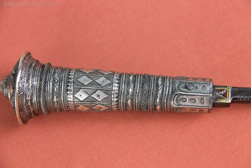 19th century Indian Silver mounted Lohar axe. Has a steel blade inlaid with brass, red enamel and silver. Hilt has a heavily embossed silver grip. Note there is no scabbard with this item. In good overall condition with some rust staining to blade.