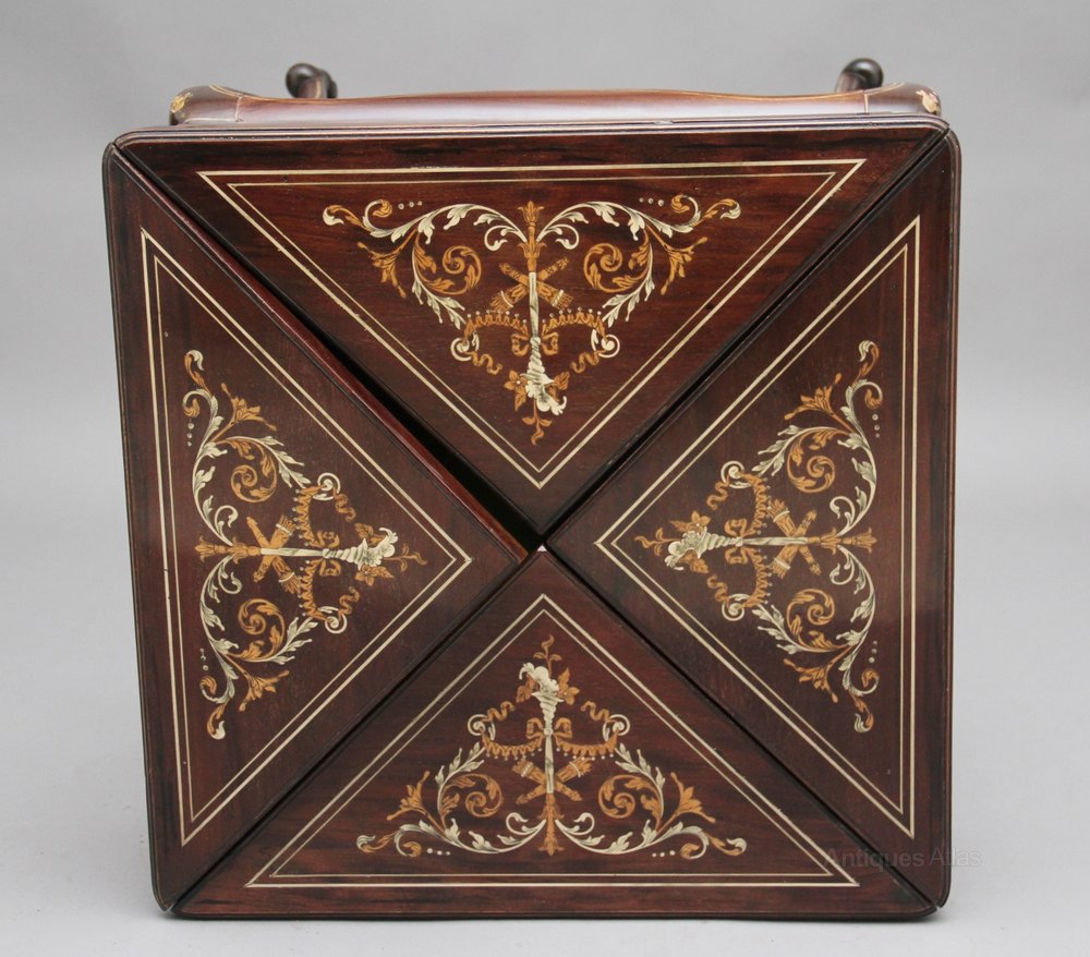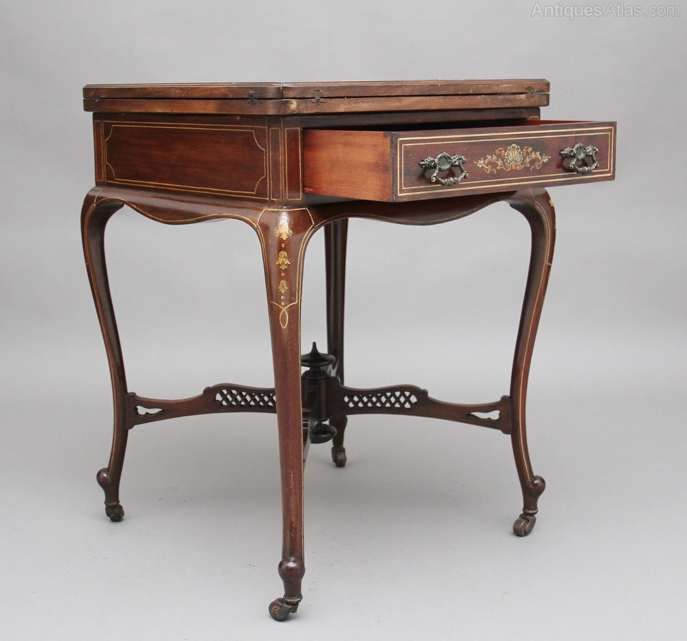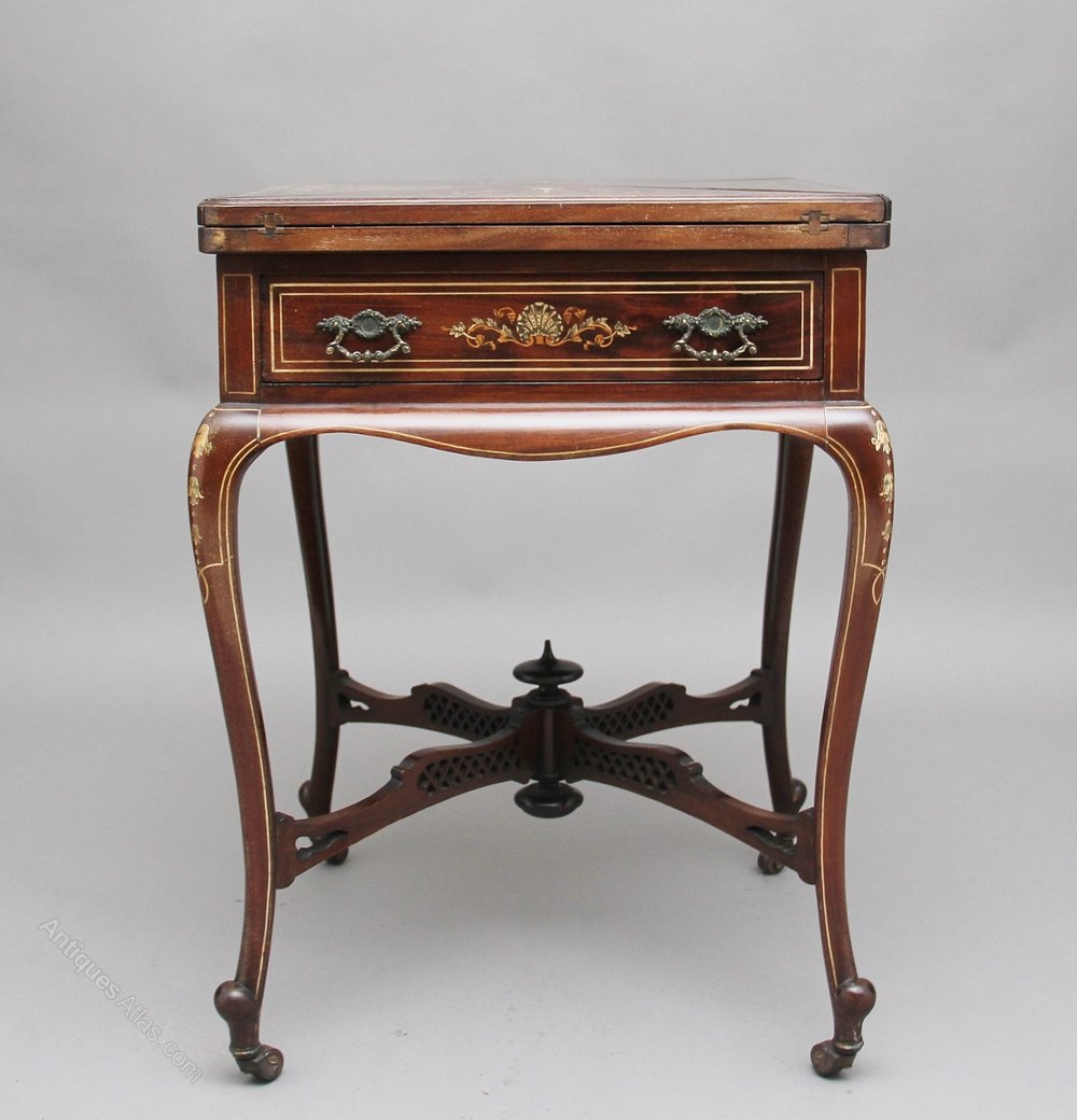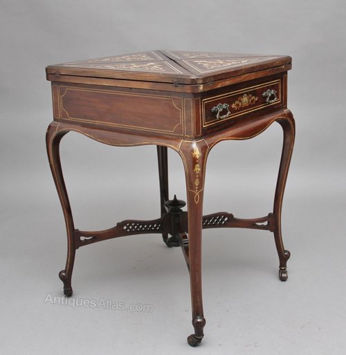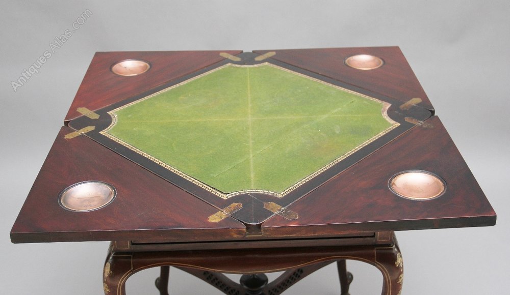 19th Century mahogany, bone and boxwood inlaid envelope card table, finely inlaid all over standing on four cabriole legs united by a pierced X stretcher, with a single mahogany lined drawer, the four flaps turn over to reveal a green baize lined playing surface including four copper lined guinea wells. Circa 1890.